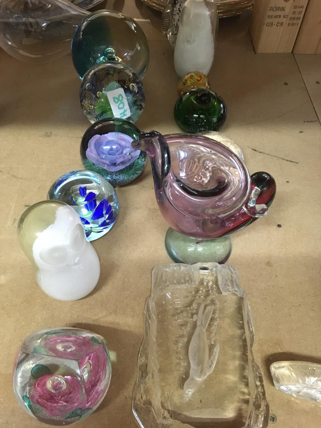 A collection of glass paperweights.