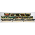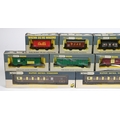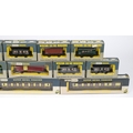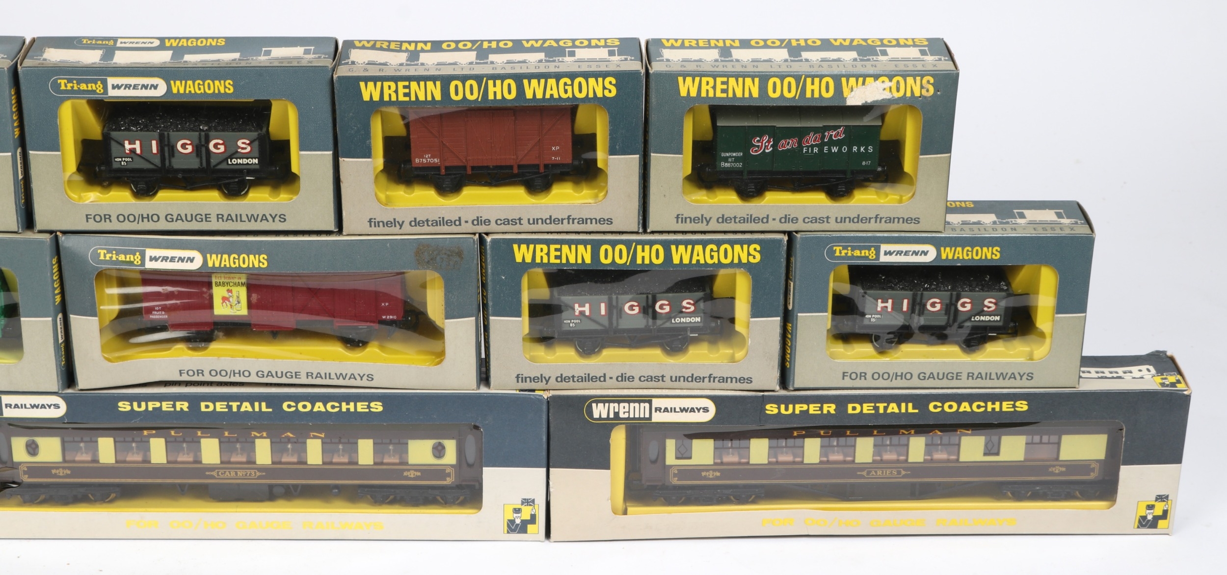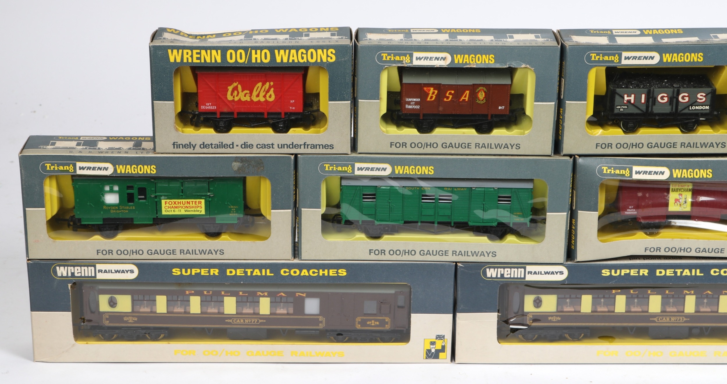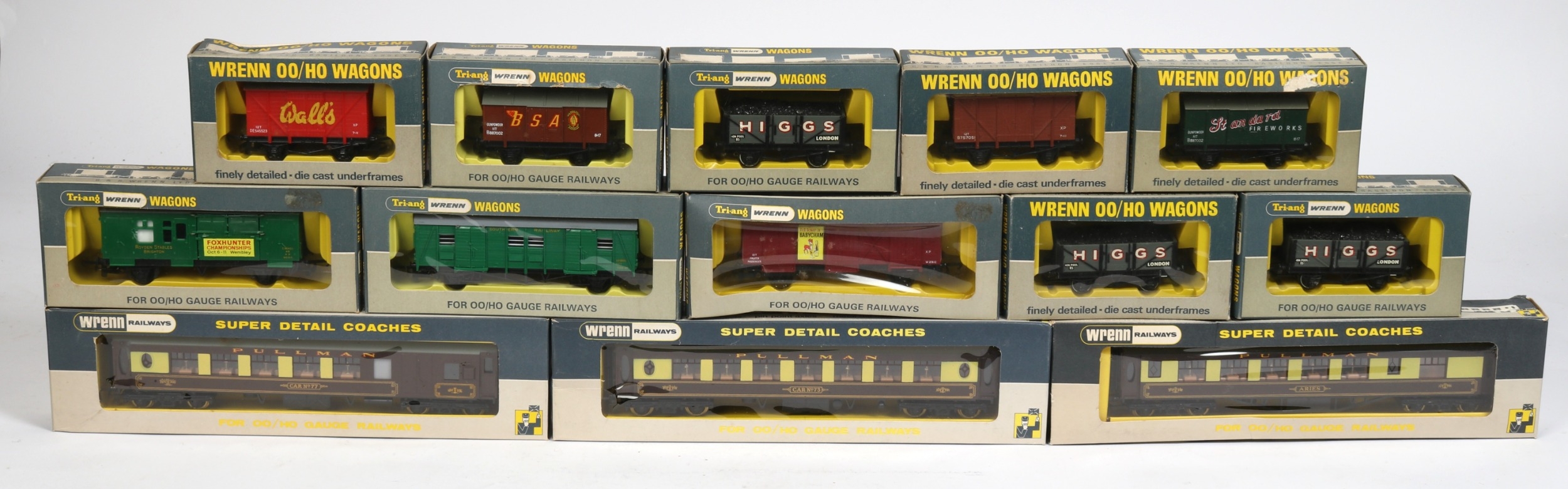 13 Wrenn Railways Rolling Stock. 3x PULLMAN cars, W6000 Brake 2nd, Car 77, W6001 2nd class Car 73 and a W6002 1st Class Aries. Plus a W4315P Southern Horse Box "Royden Stables Brighton" and a W4323P Utility Van, Southern Railway. W4305P Fruit Van, Babycham. 3x W4635P Coal Wagons, HIGGS London. 2x Ventilated Vans- W4318P, Wall's and a W4318P/A Peek Freans. Plus 2x Gunpowder Vans- W4313 Standard Fireworks and a W5009, BSA. All boxed, minor wear/some creasing. One wagon in an associated box. £80-120