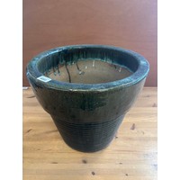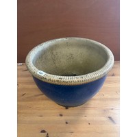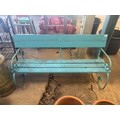 A blue painted metal framed bench with wooden slats, measuring 142cm long.