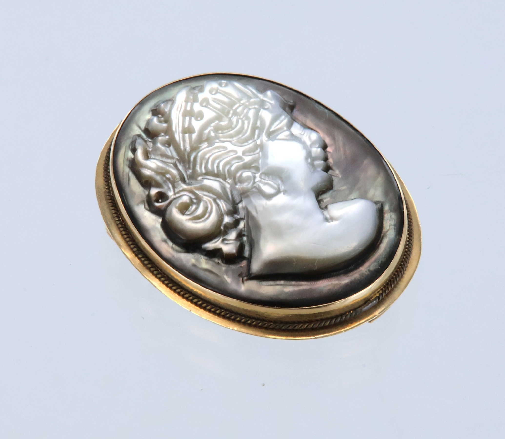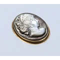 Yellow metal (stamped and tests 14ct) mother of pearl cameo brooch with pendant fitting, signed Scala, measures 28mm x 22mm, weight 3.3g