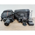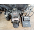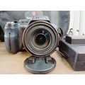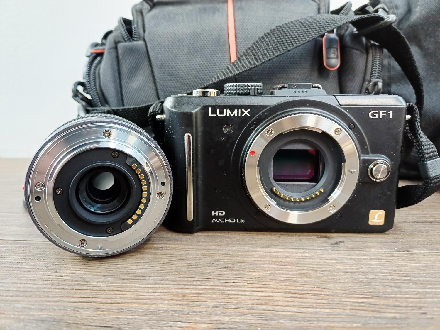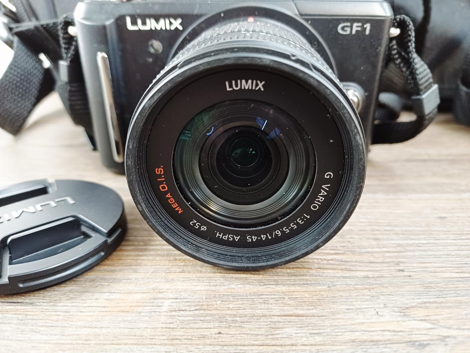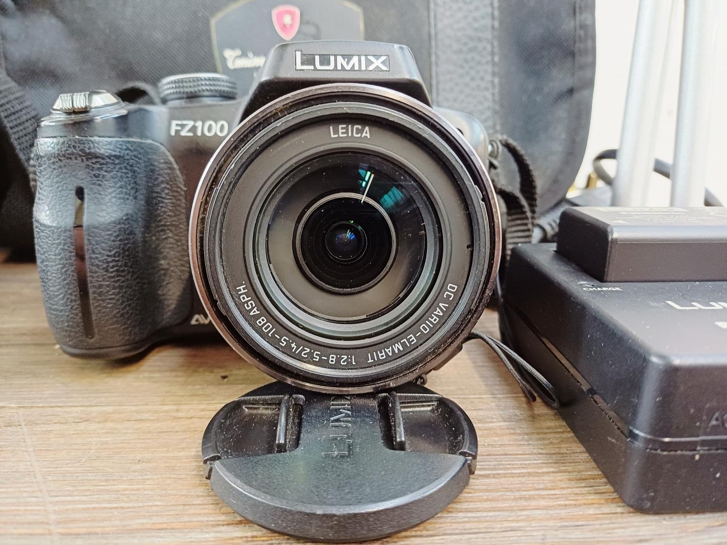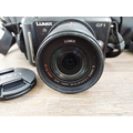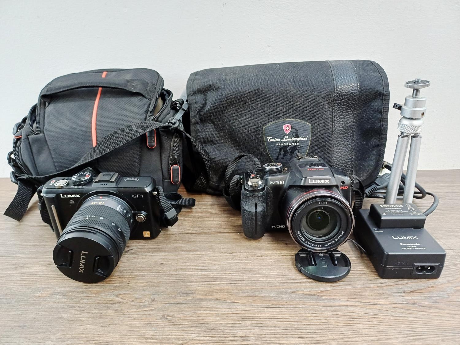 Two cased Panasonic Lumix digital cameras with batteries, one DMC-GF1 Micro Four Thirds 12mp CMOS sensor mirrorless system camera fitted with G Vario 1:3.5-5.6 14-45mm lens and one FZ100 14mp CMOS sensor bridge with charger and mini tripod