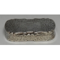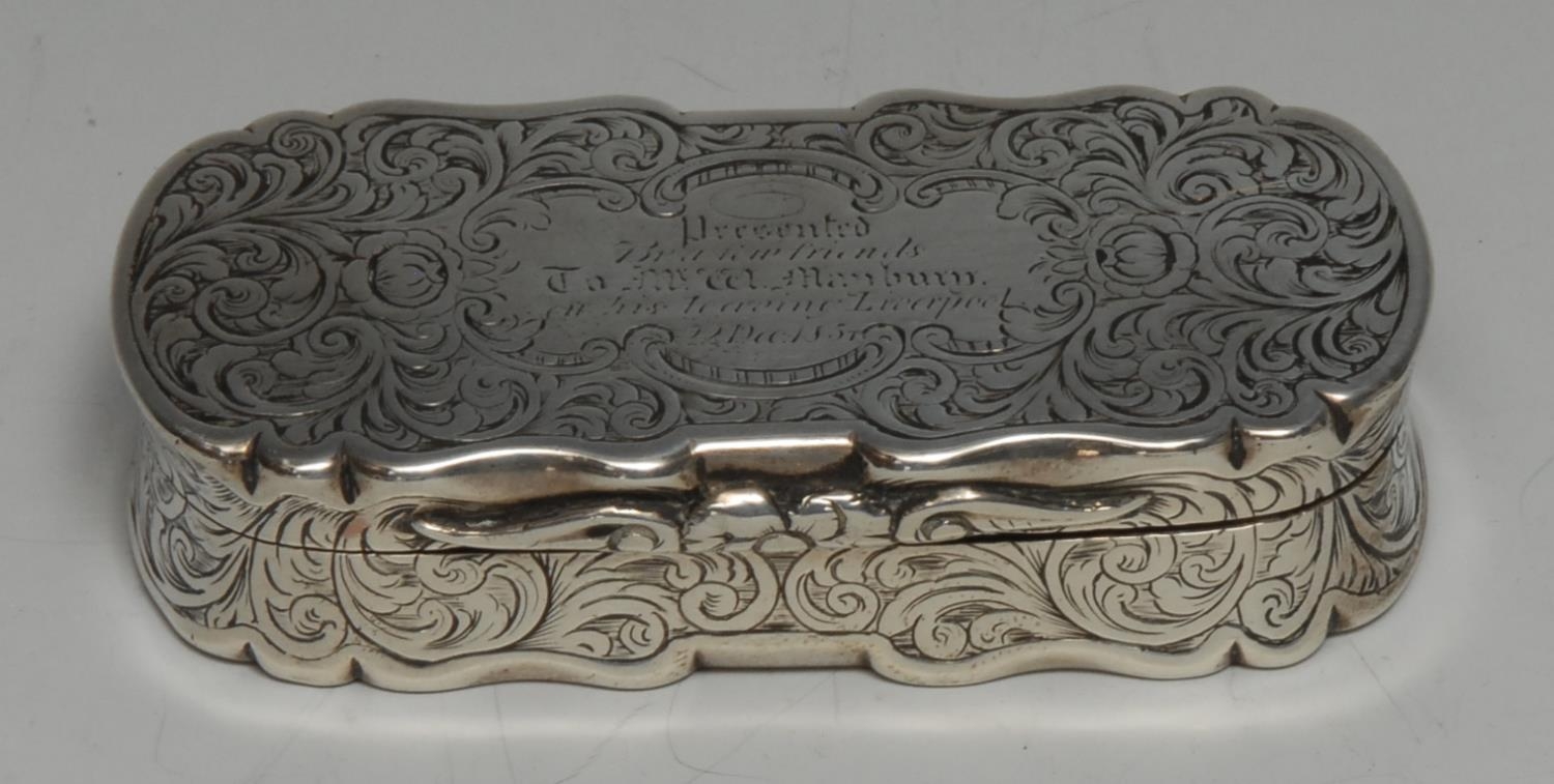 A Victorian silver shaped oval snuff box, engraved with scrolling foliage, hinged cover, 8.5cm wide, Alfred Taylor, Birmingham 1854