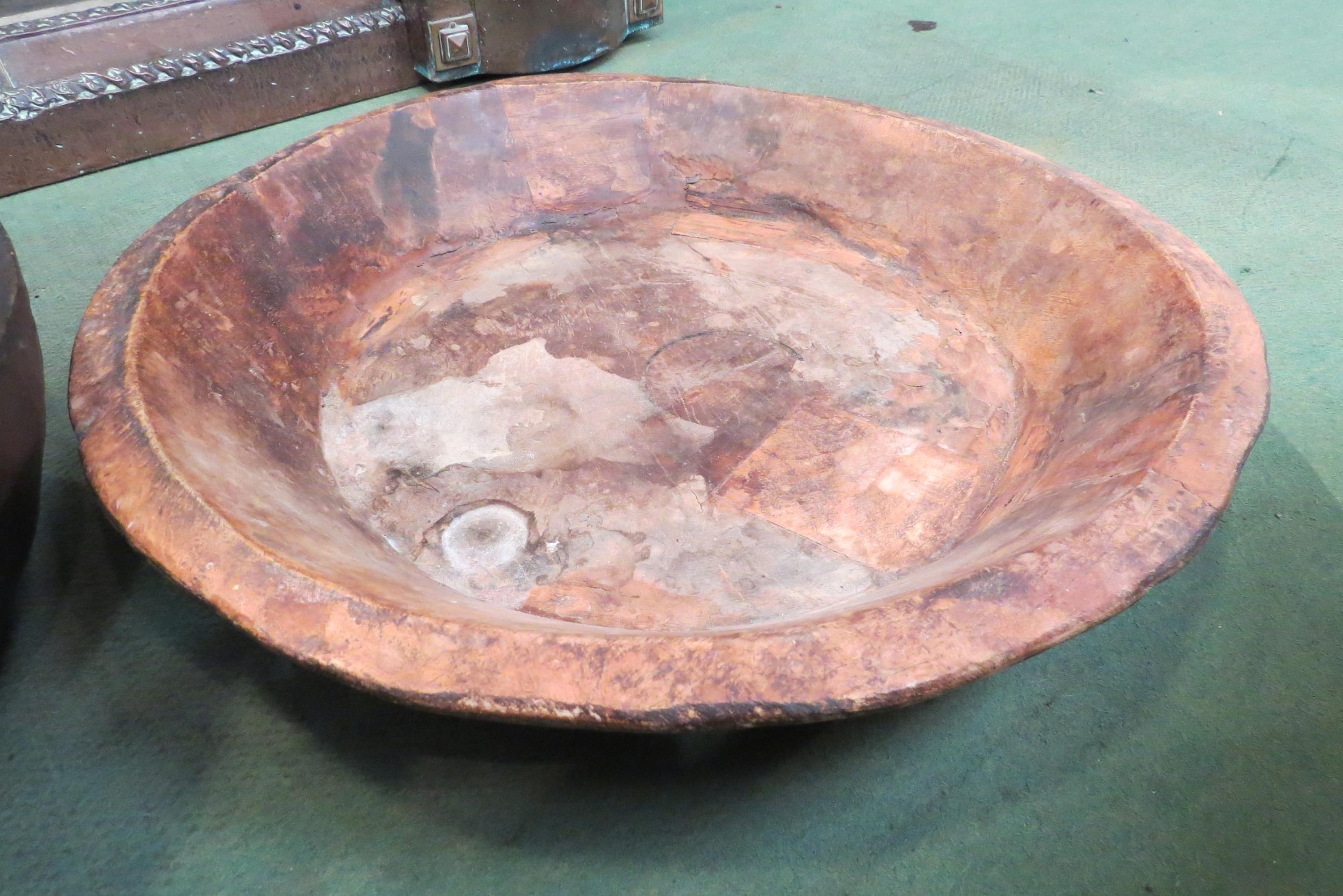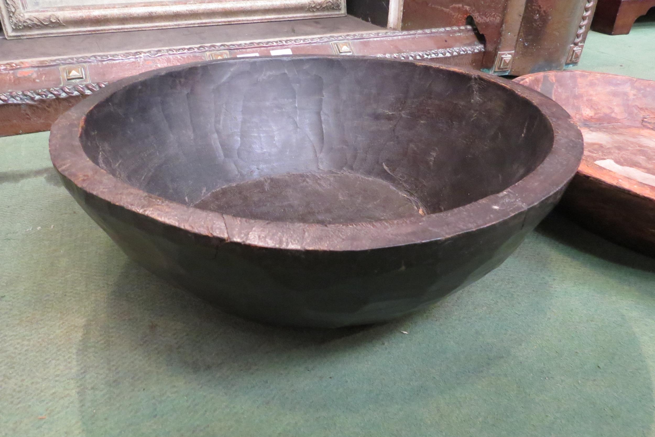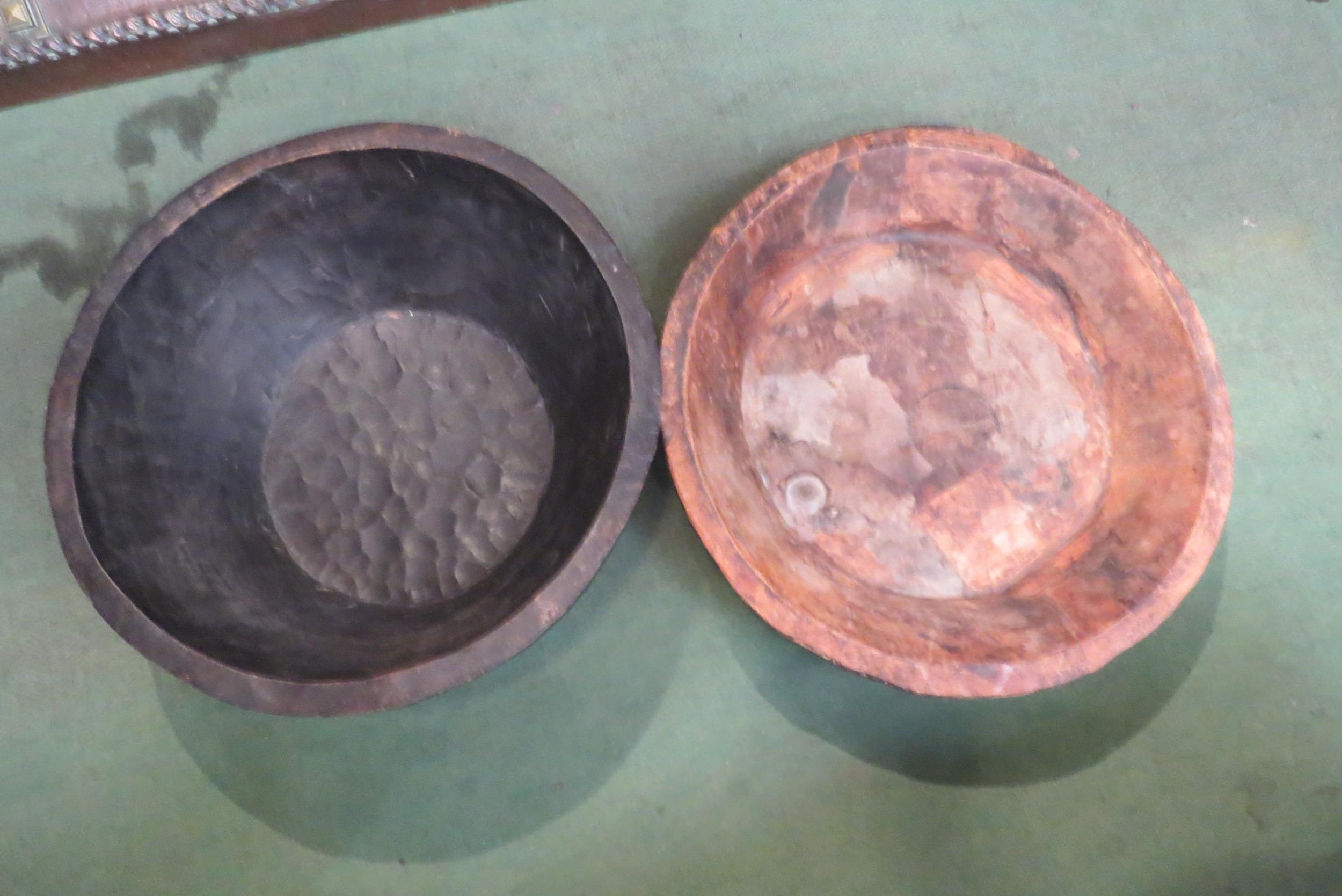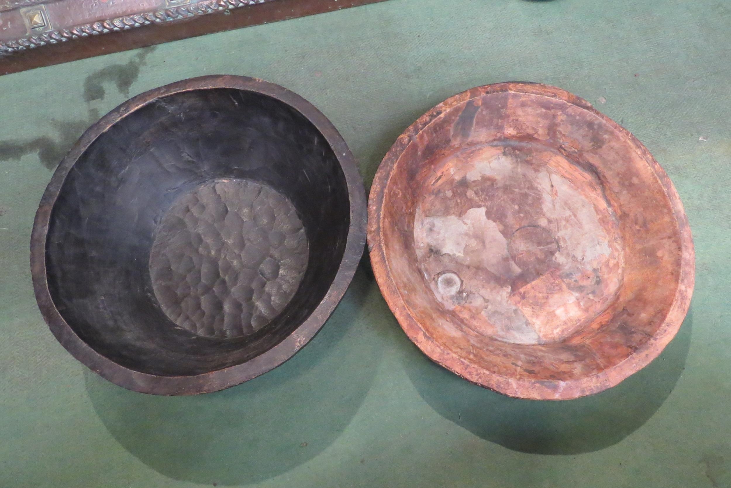 Two large wooden bowls, hand adzed, 46cm and 43cm diameter