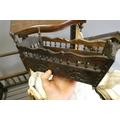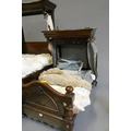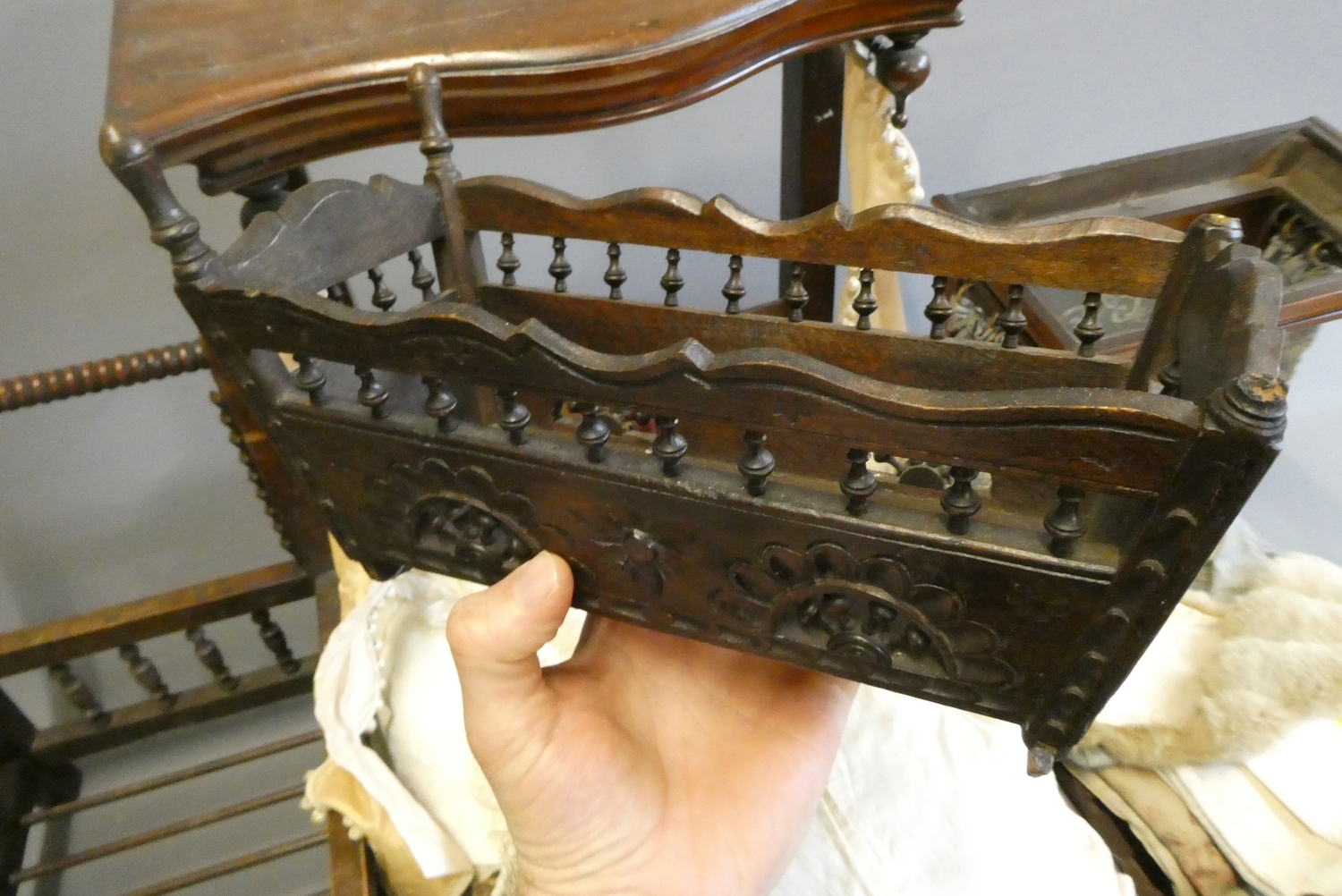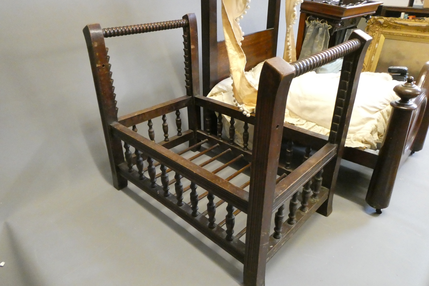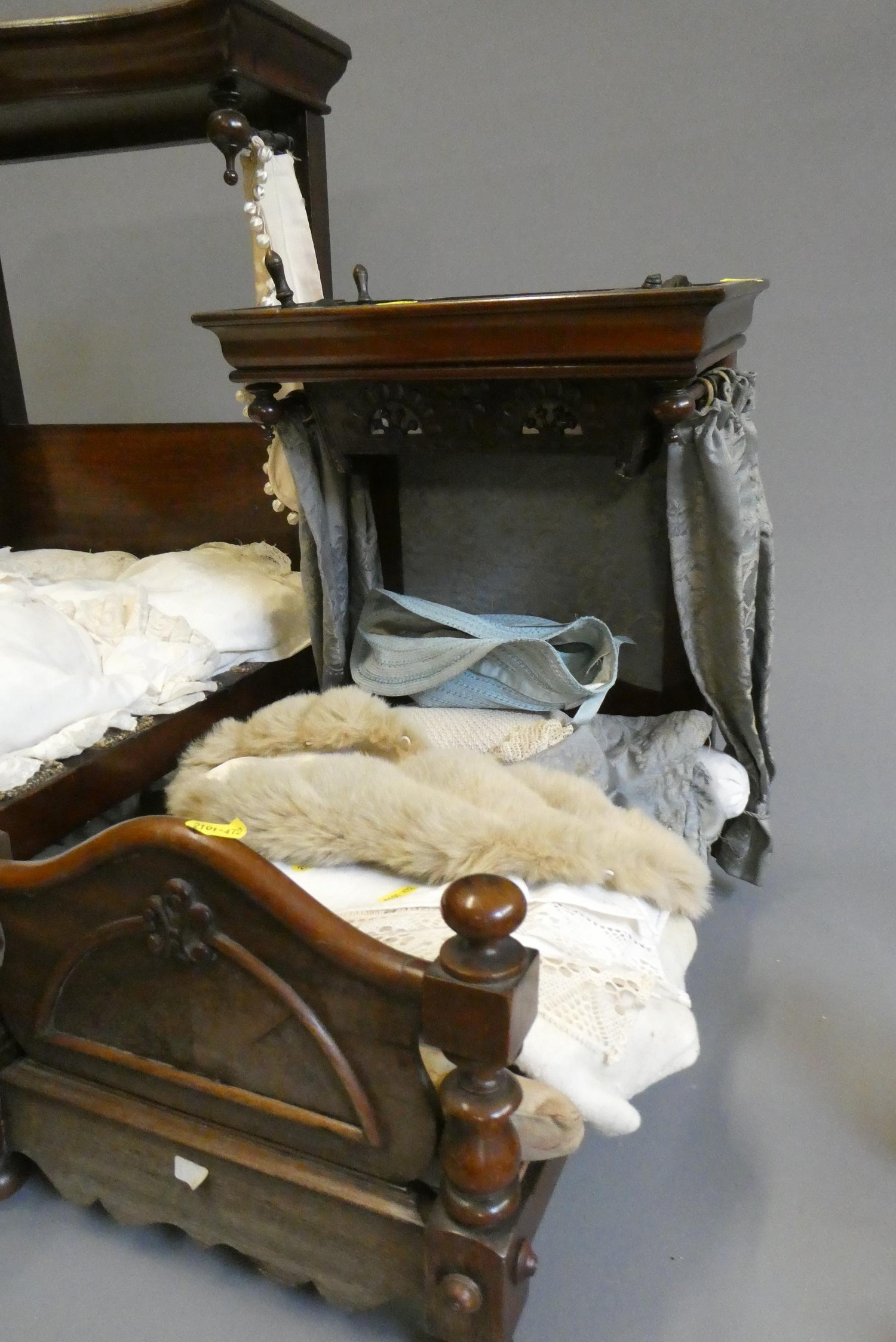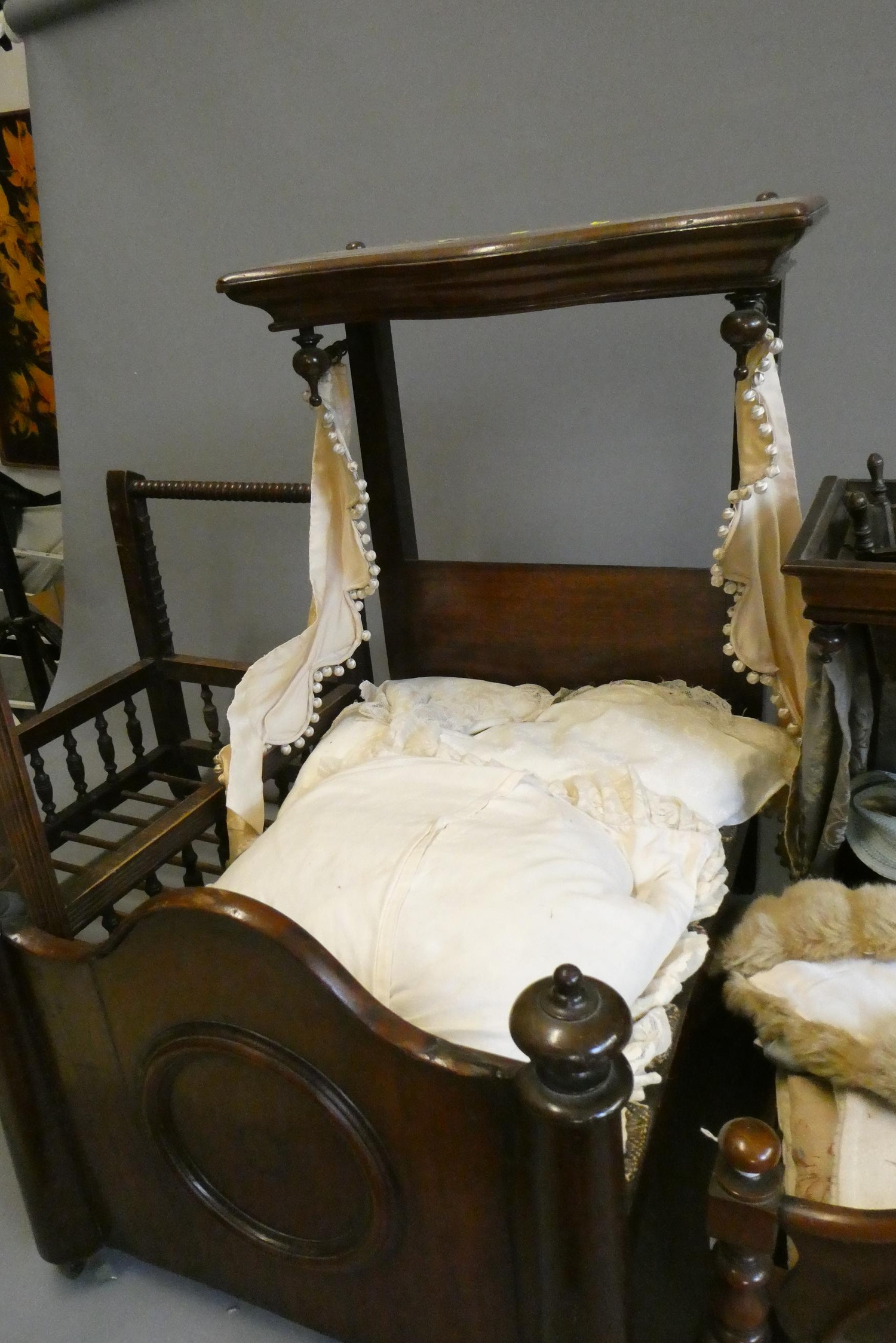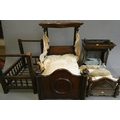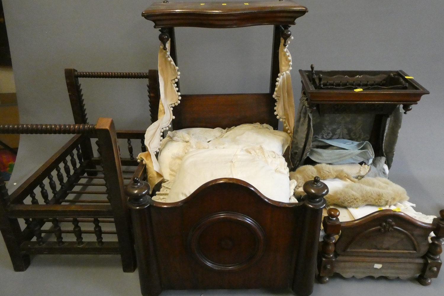 Three antique doll's beds, all of wood construction, comprising two half testers and one with turned lateral supports, largest 25" x 27", and a doll cradle (4)
