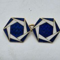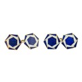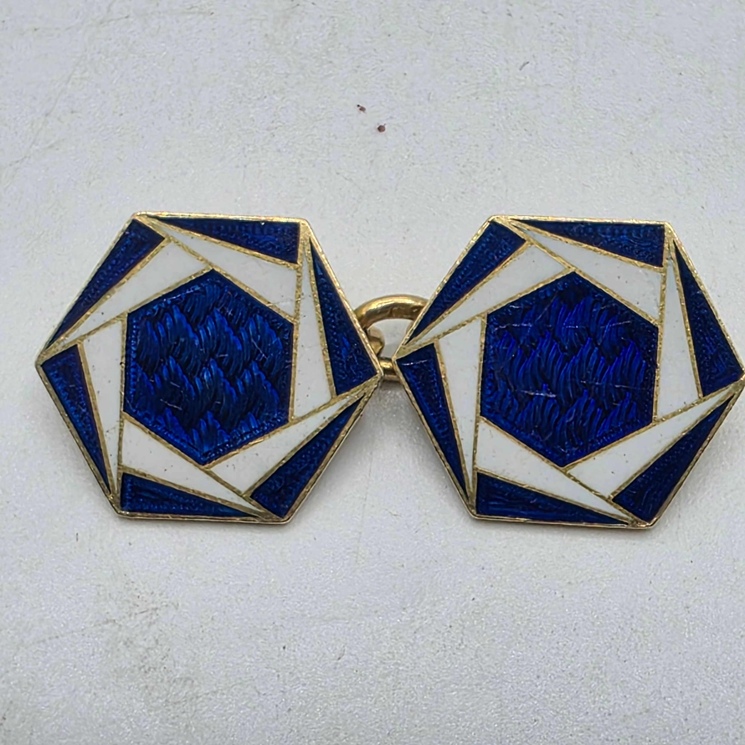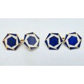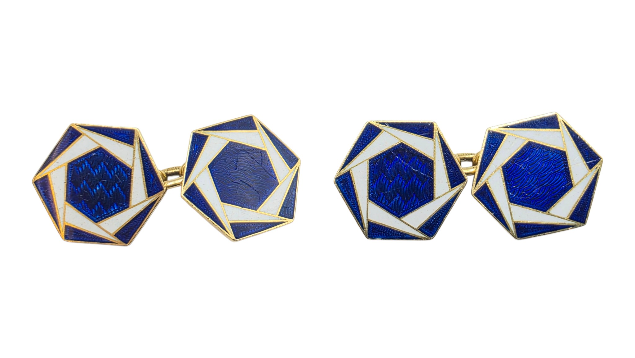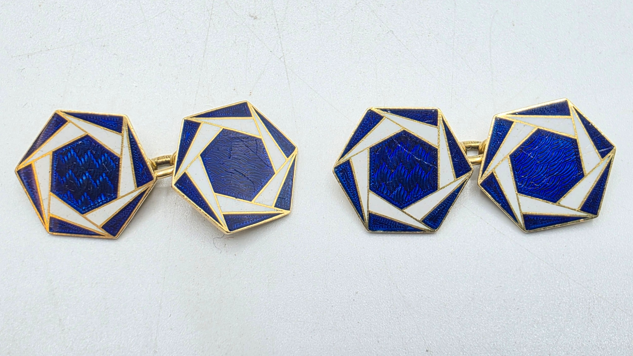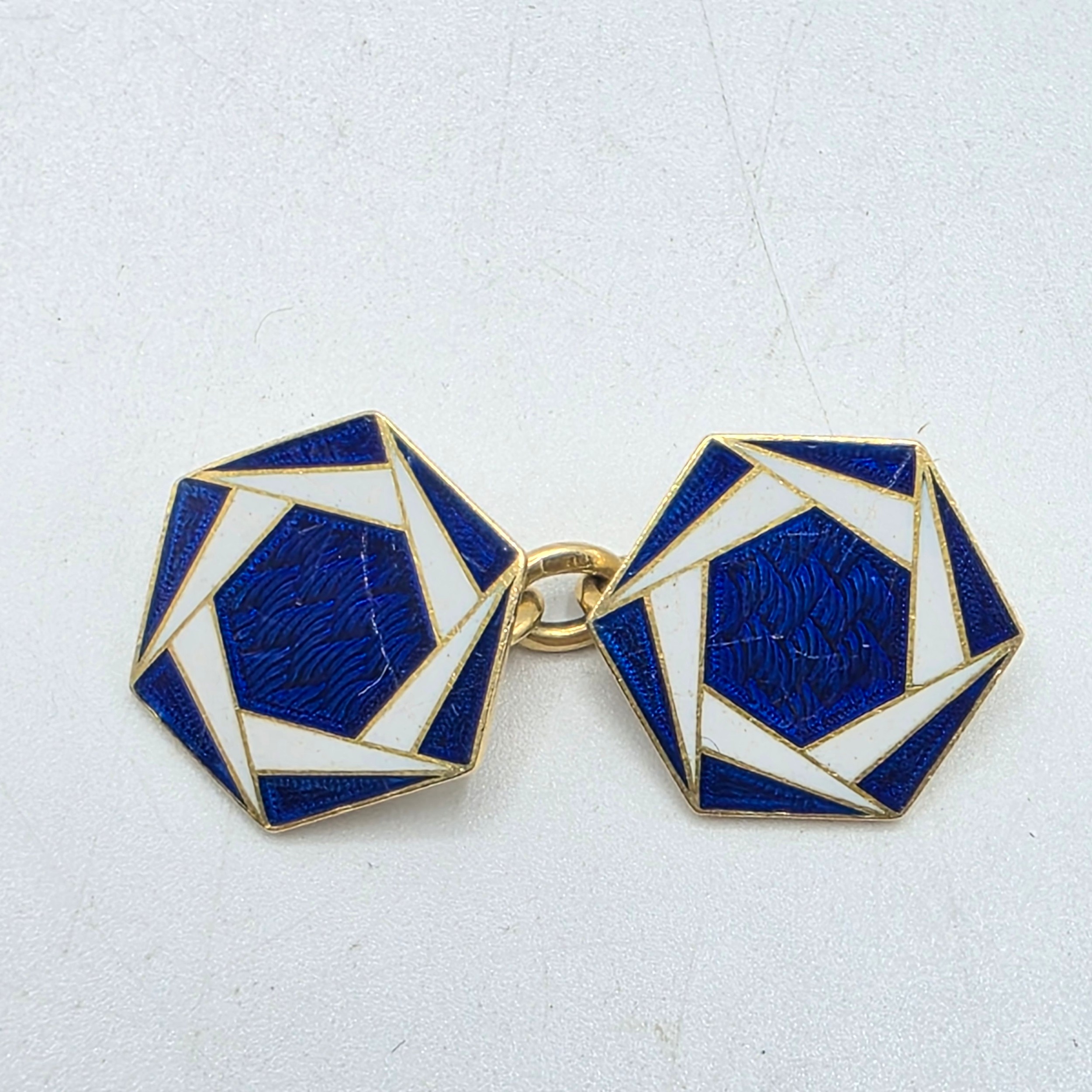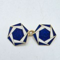 A pair of 18ct gold hexagonal double sided cuff links with blue and white enamel decoration. 8.3g.