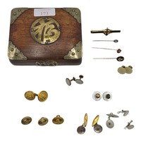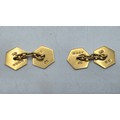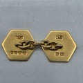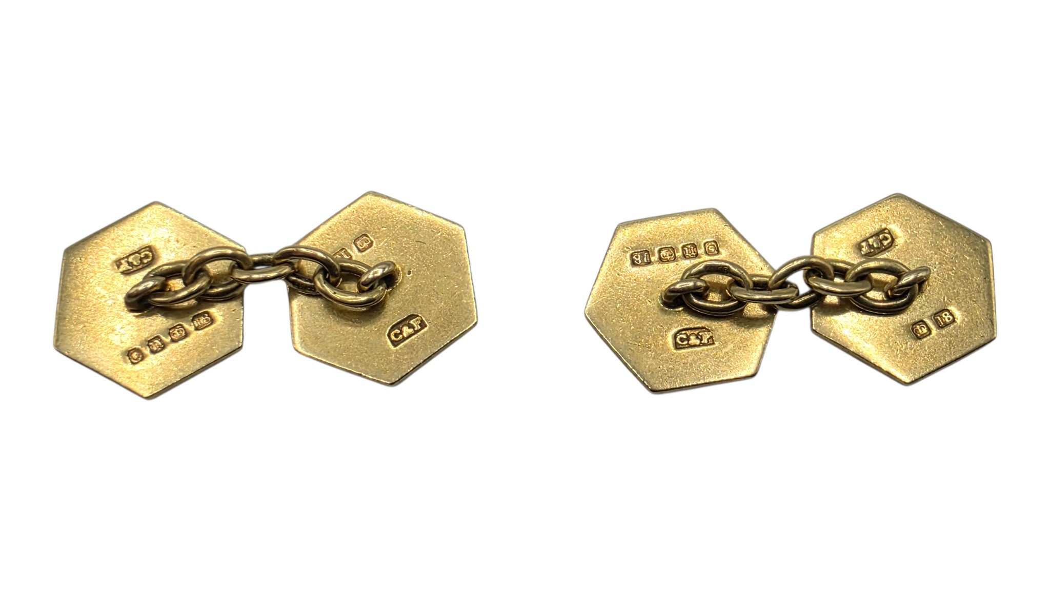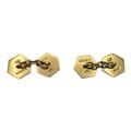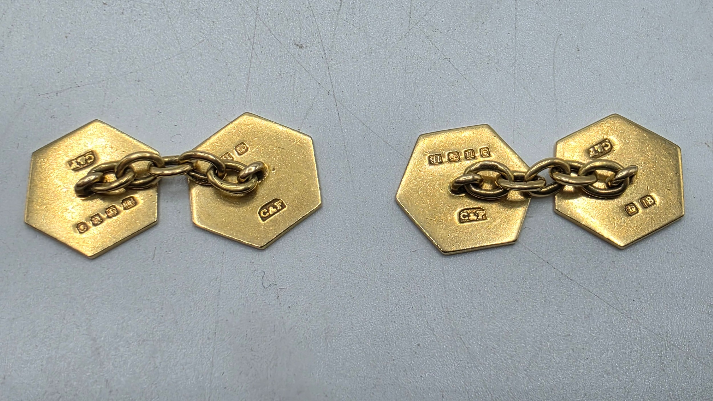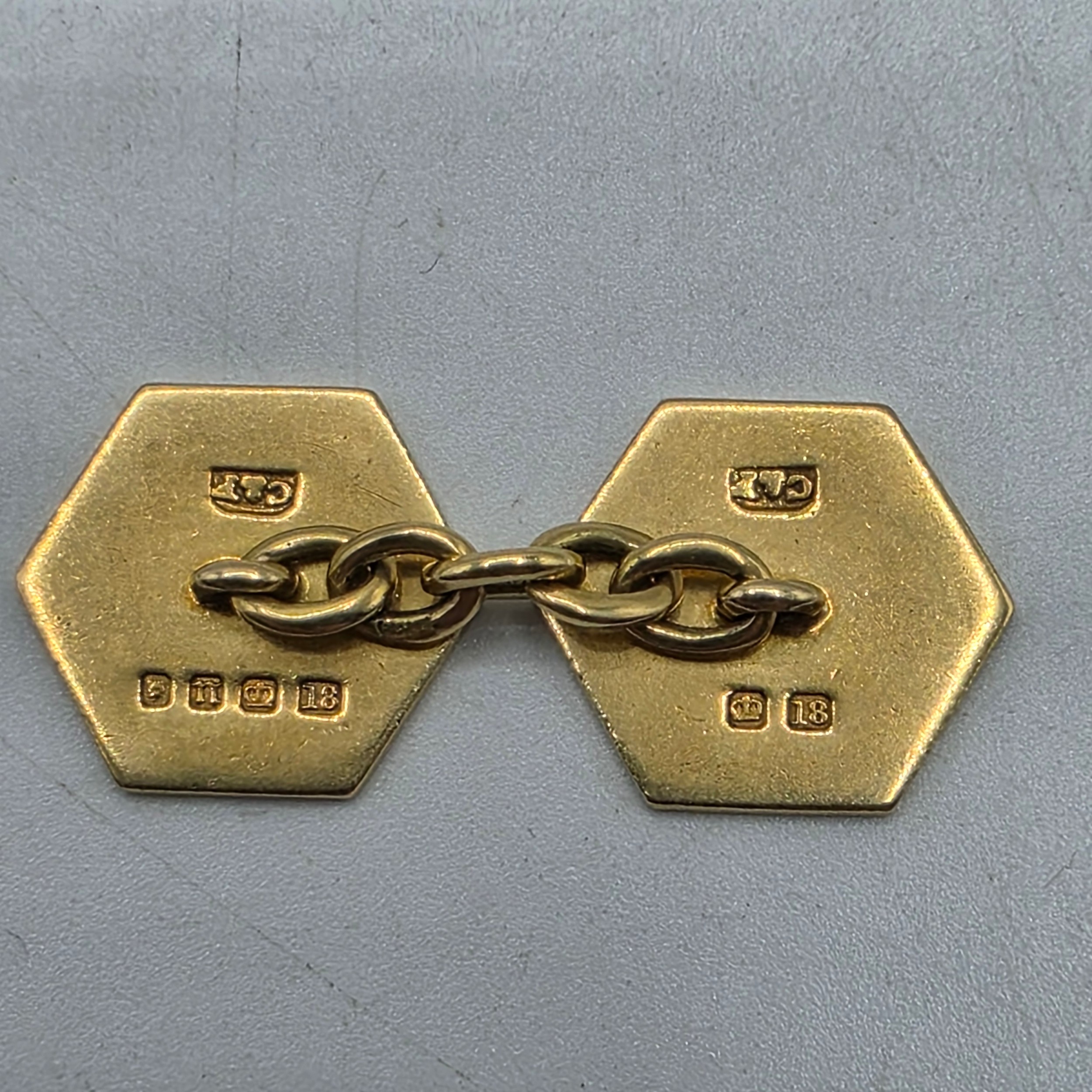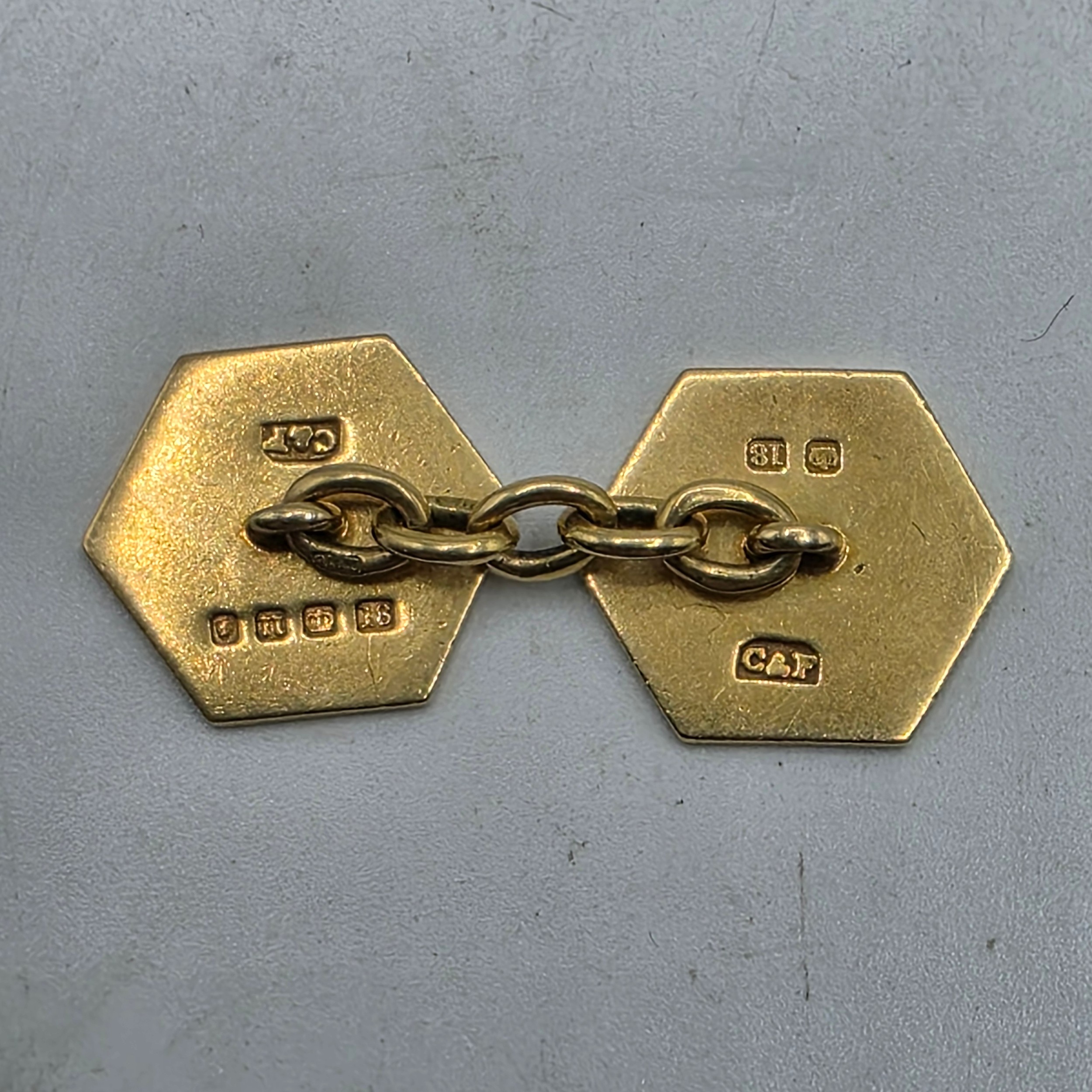 A pair of 18ct gold hexagonal double sided cuff links with blue and white enamel decoration. 8.3g.