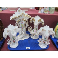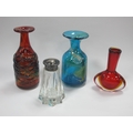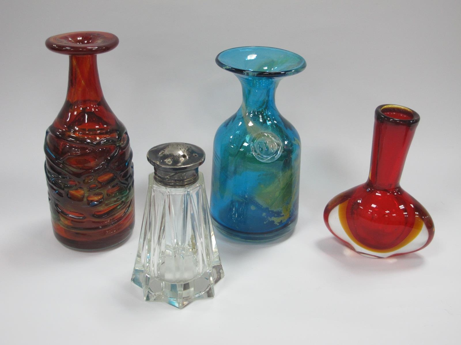 Mdina Turquoise Glass Spill Vase, 17cm high, a similar red example with applied pierced wavy band to body, sugar castor, ruby glass vase. (4).
