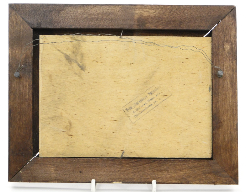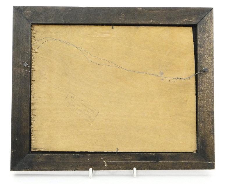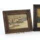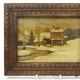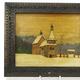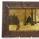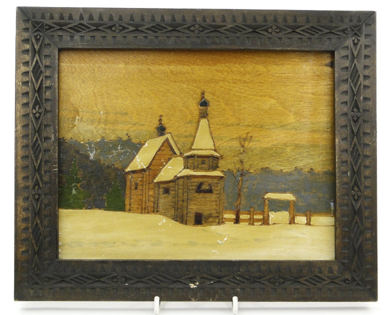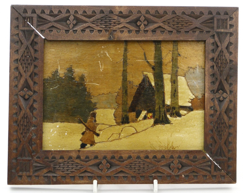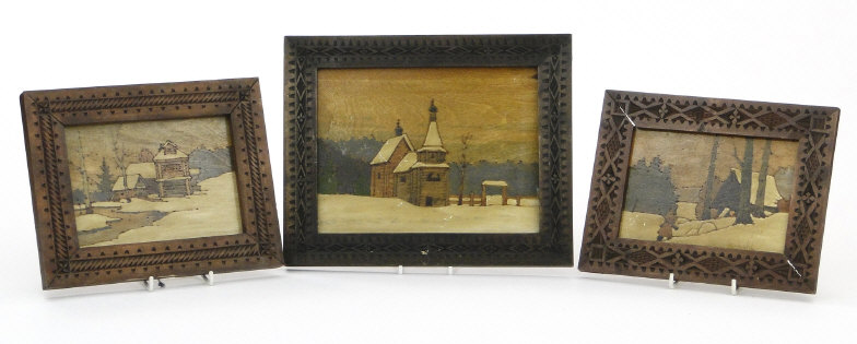 Three Russian painted pokerwork panels depicting snowy landscapes, each with carved wood frame and an ink stamp to the reverse, the larger 17cm x 22cm