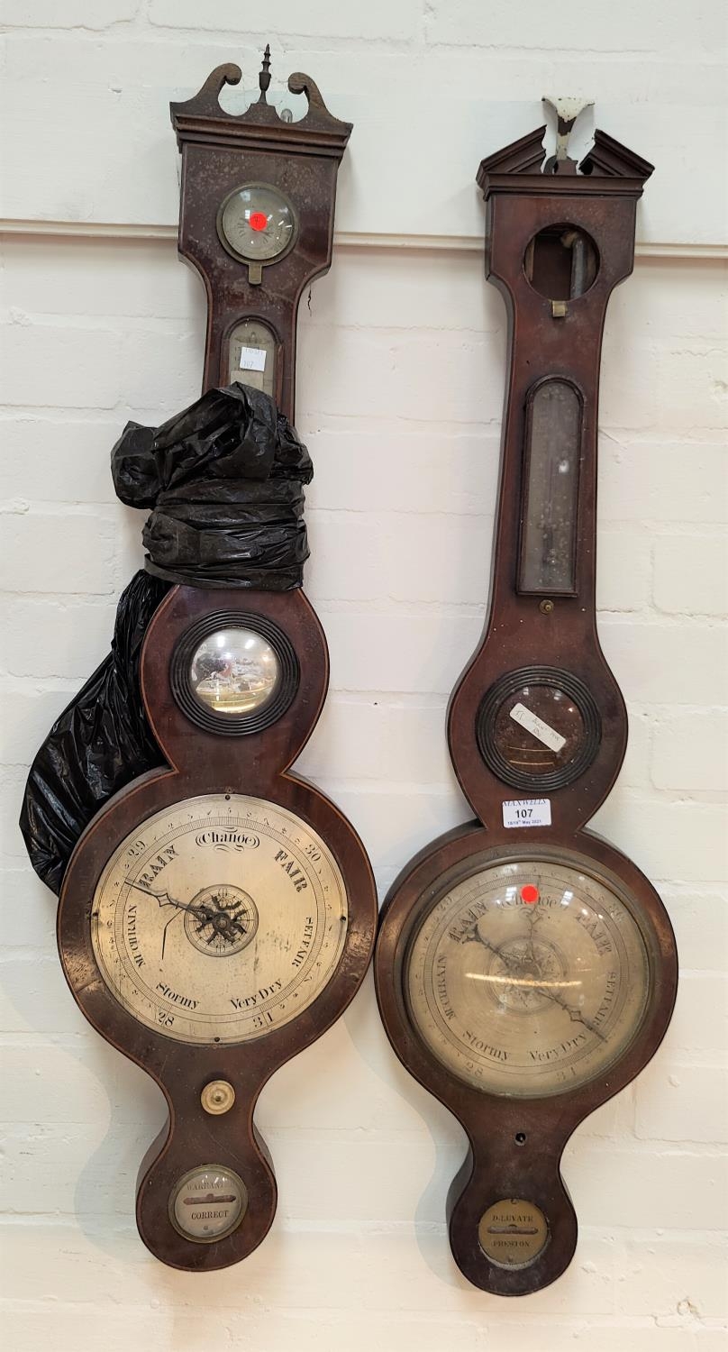 A 19th century mercury column barometer with thermometer in banjo shaped mahogany case, by Lovate, Preston, height 95 cm (no hygrometer); a similar barometer (no glass)