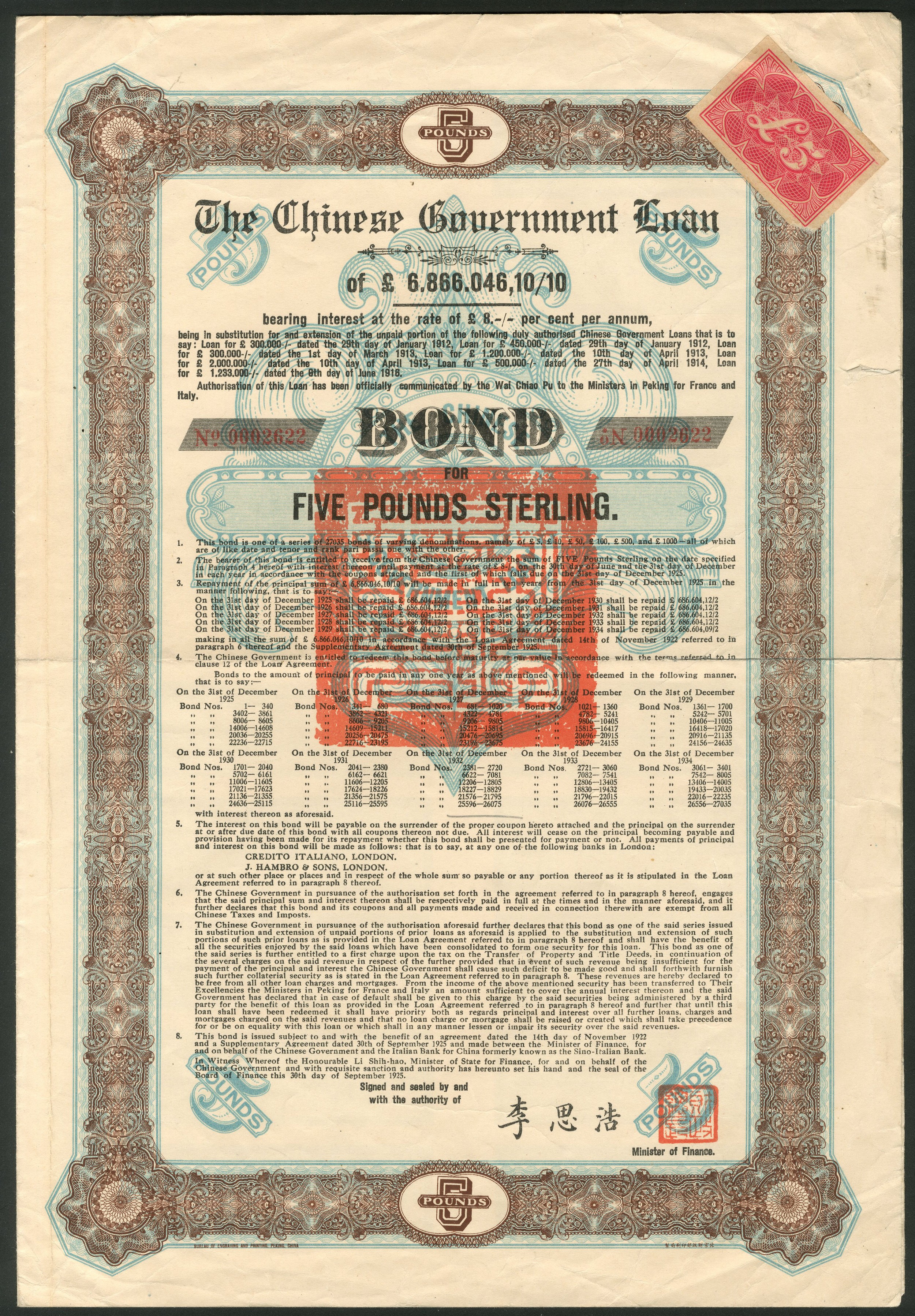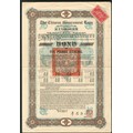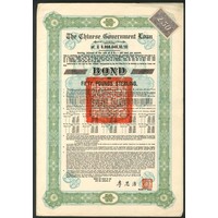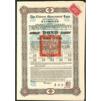 China: 1925 8% 'Skoda' Loan, bond for £5, 8th tranche, inverted 'No.', #0002622, ornate border, brown and blue, red 'chop' in centre, with coupons. Edge splits VF and rare.