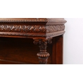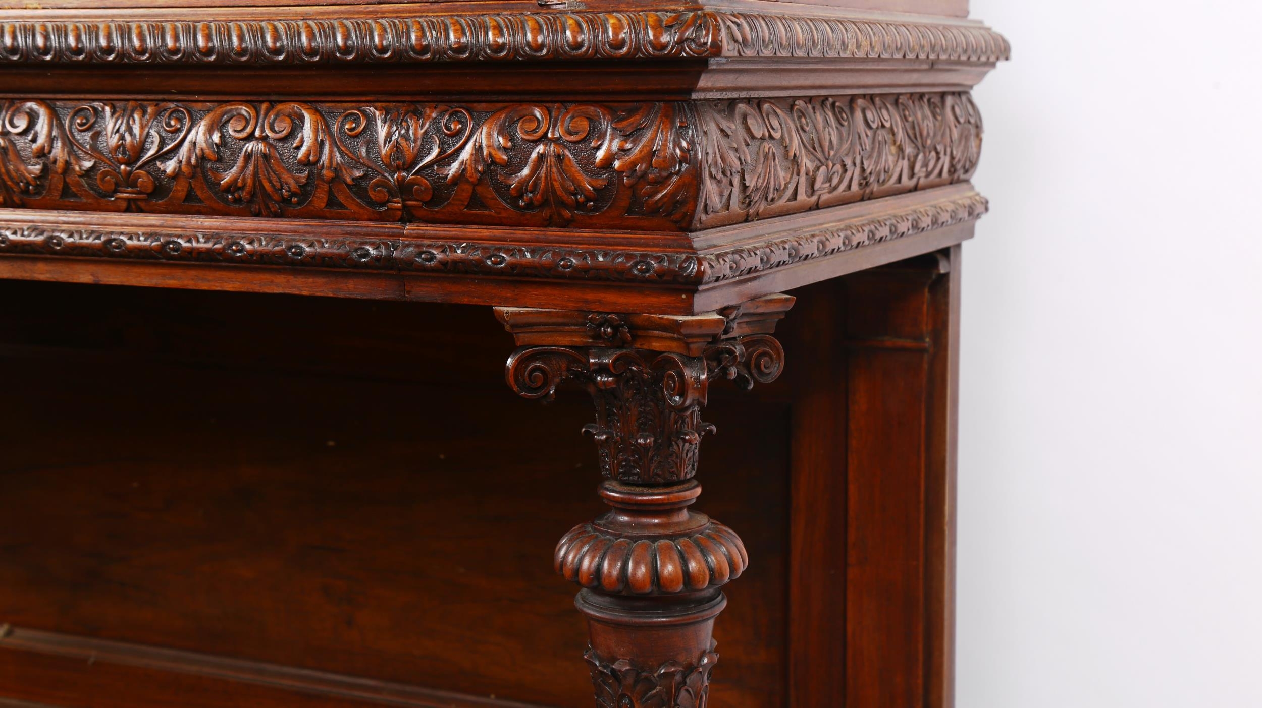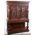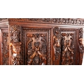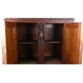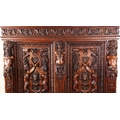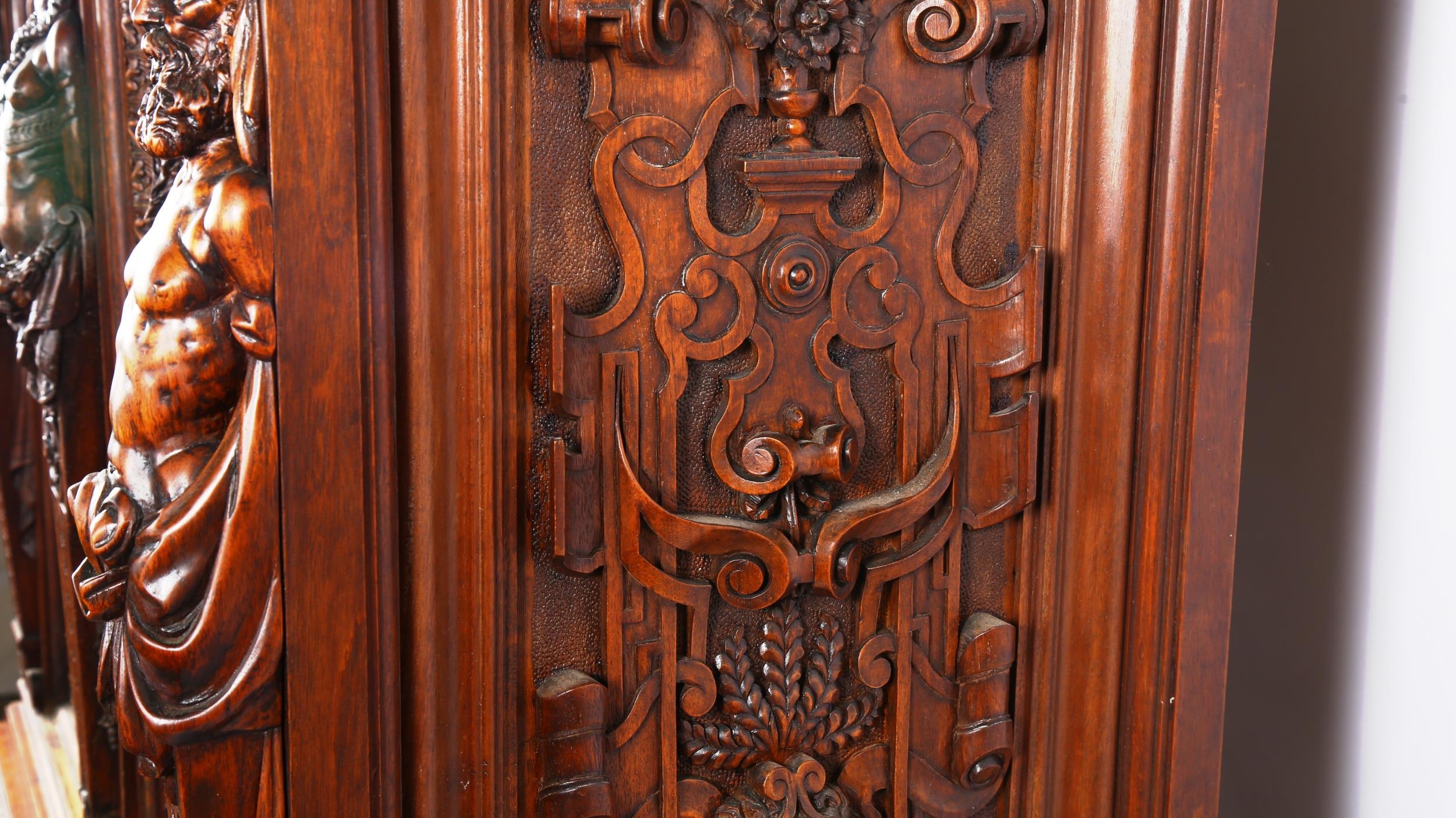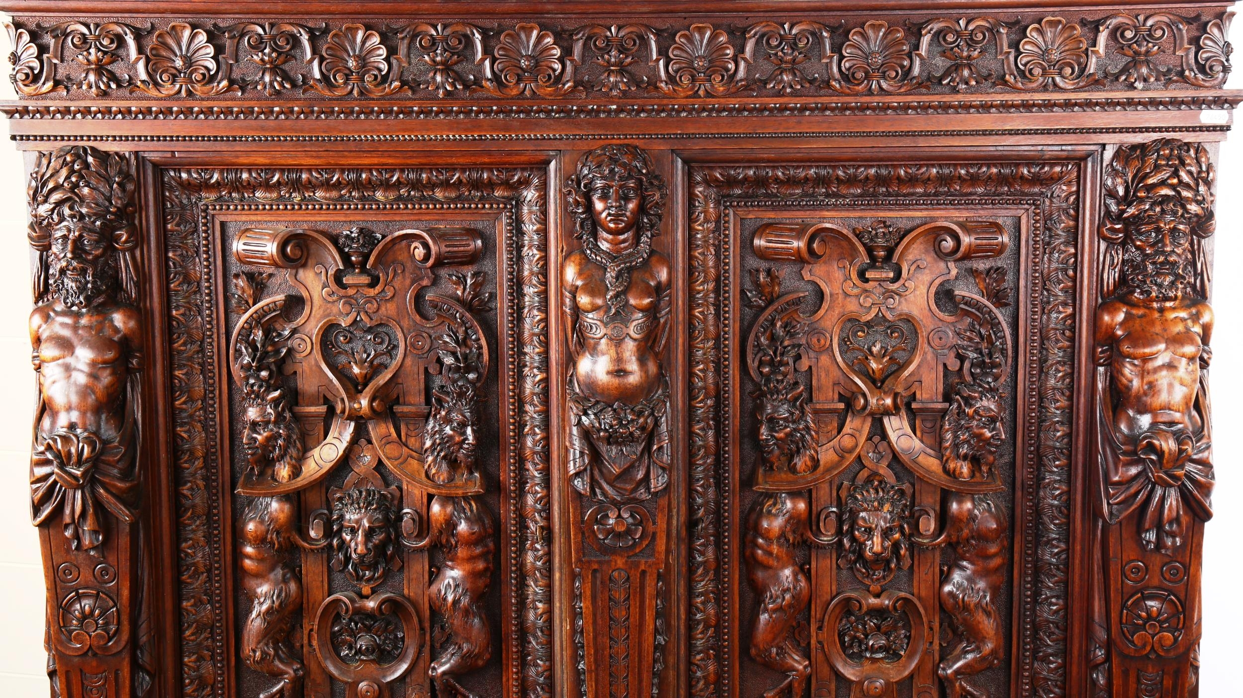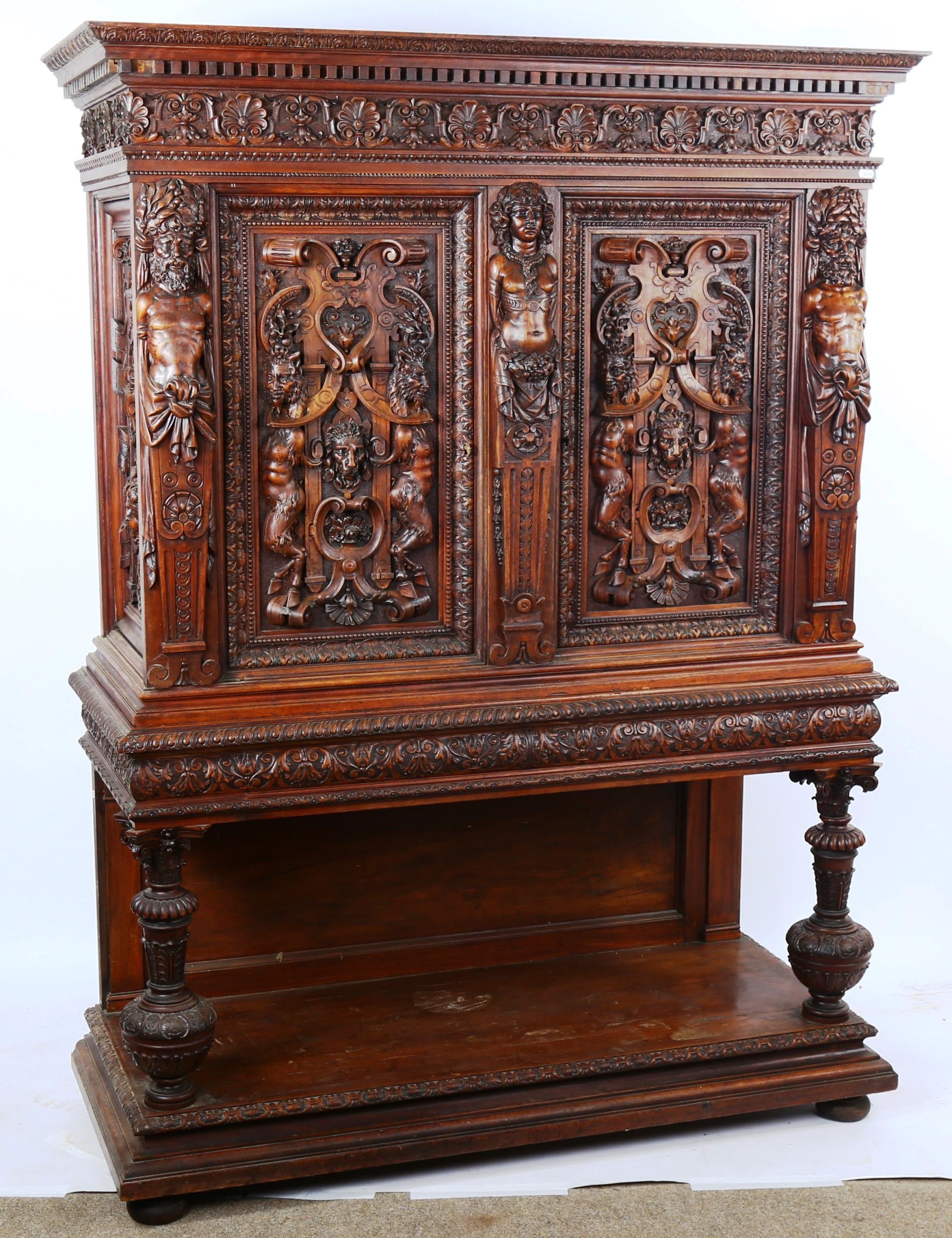 An impressive 19th century Neo-Classical design walnut 2-door cupboard, the 2 finely carved and panelled doors decorated with satyrs and lion masks flanked by Classical figure pilasters, central frieze drawer below with finely carved columns and platform base, width 130cm, depth 51cm, height 176cm
