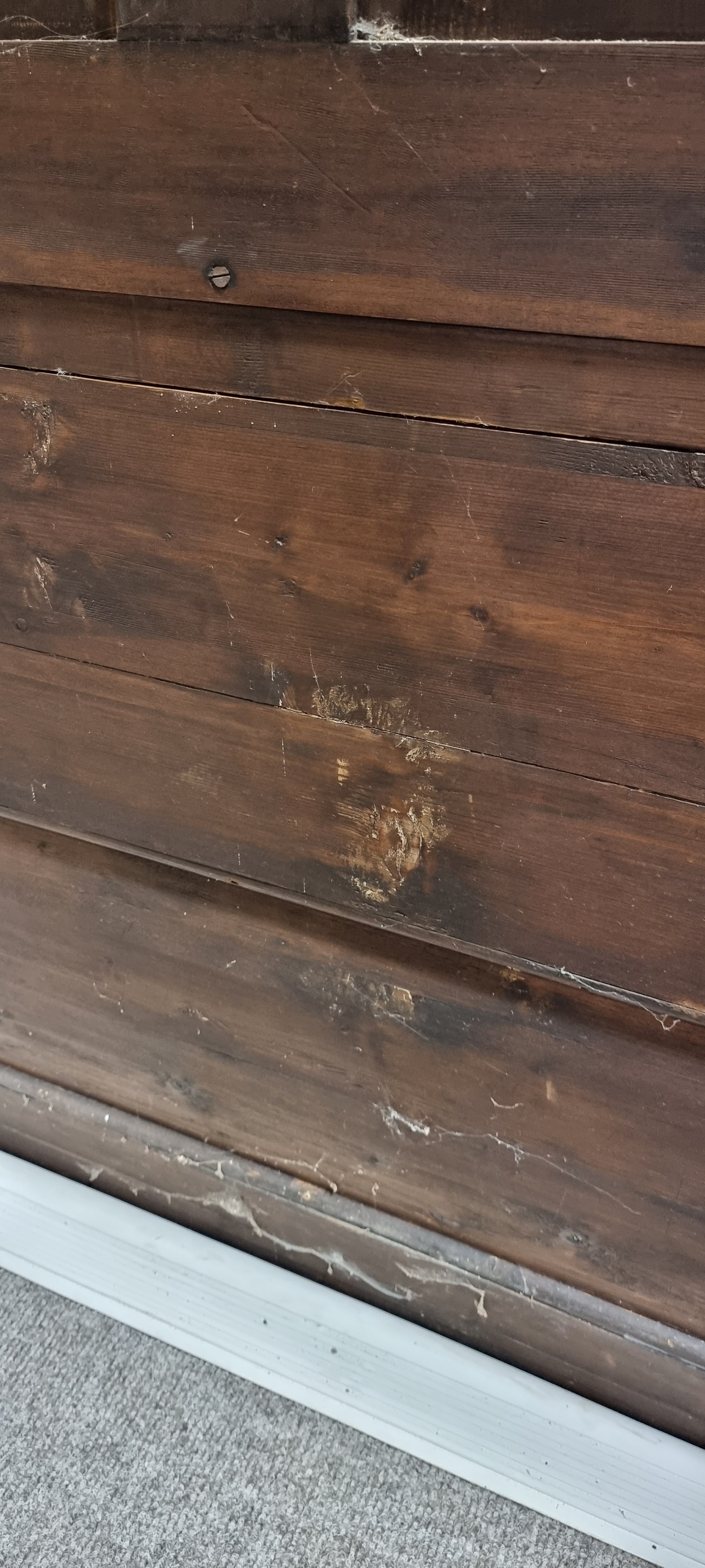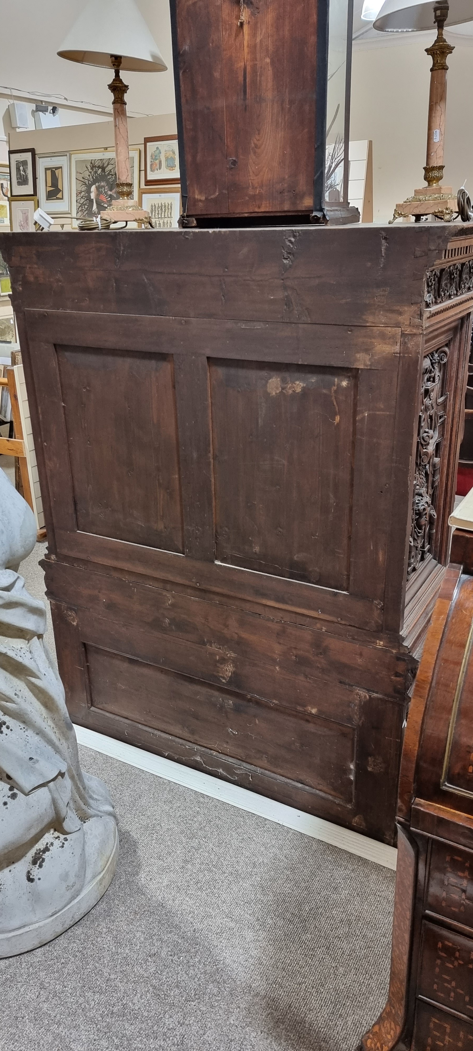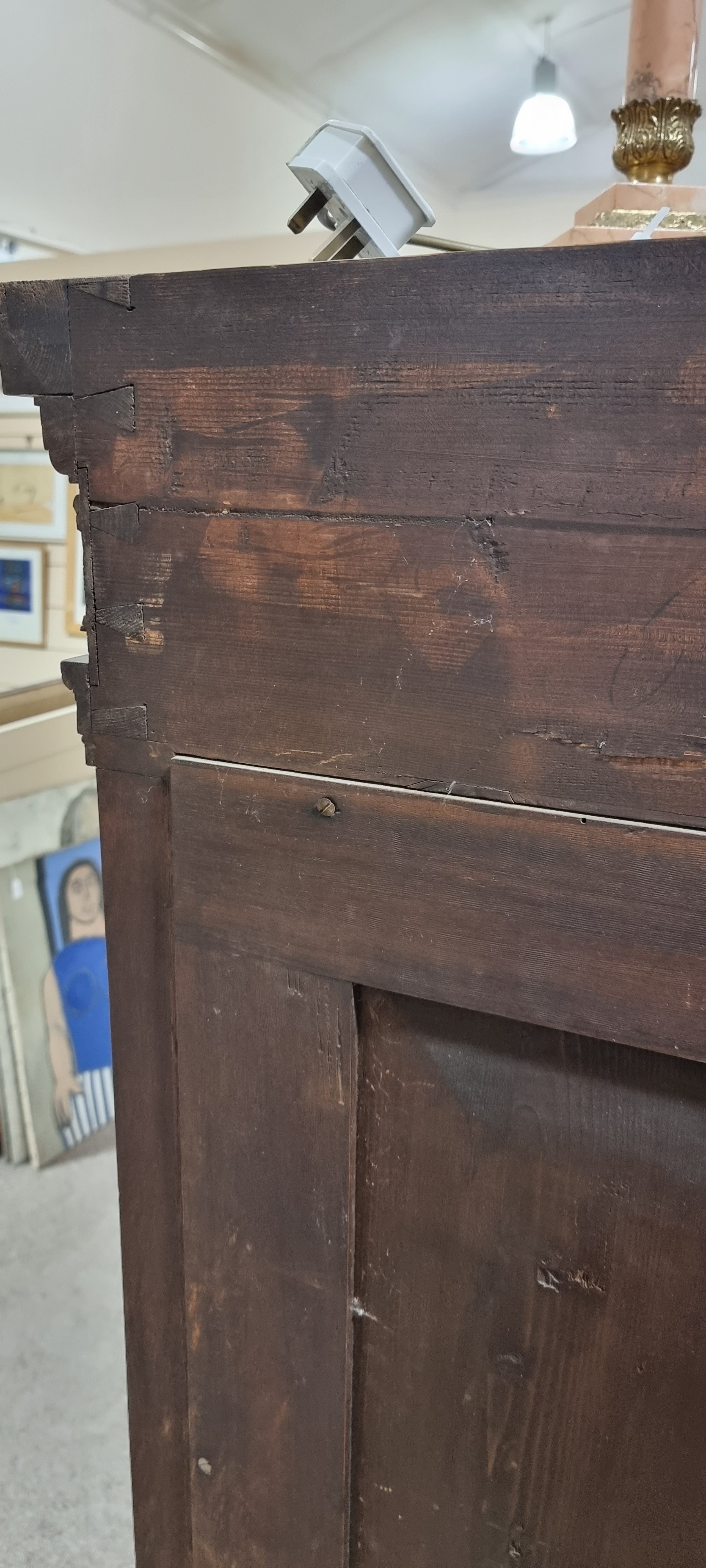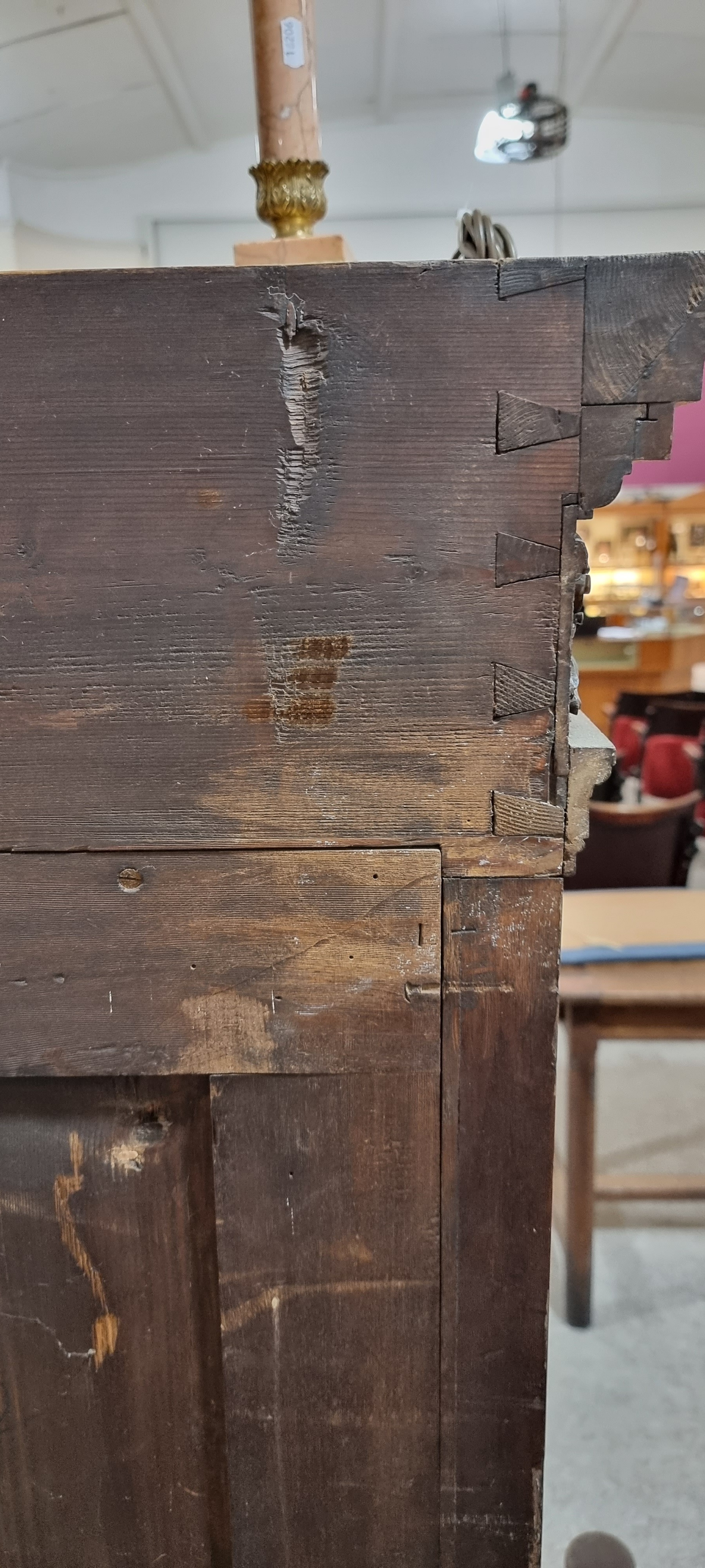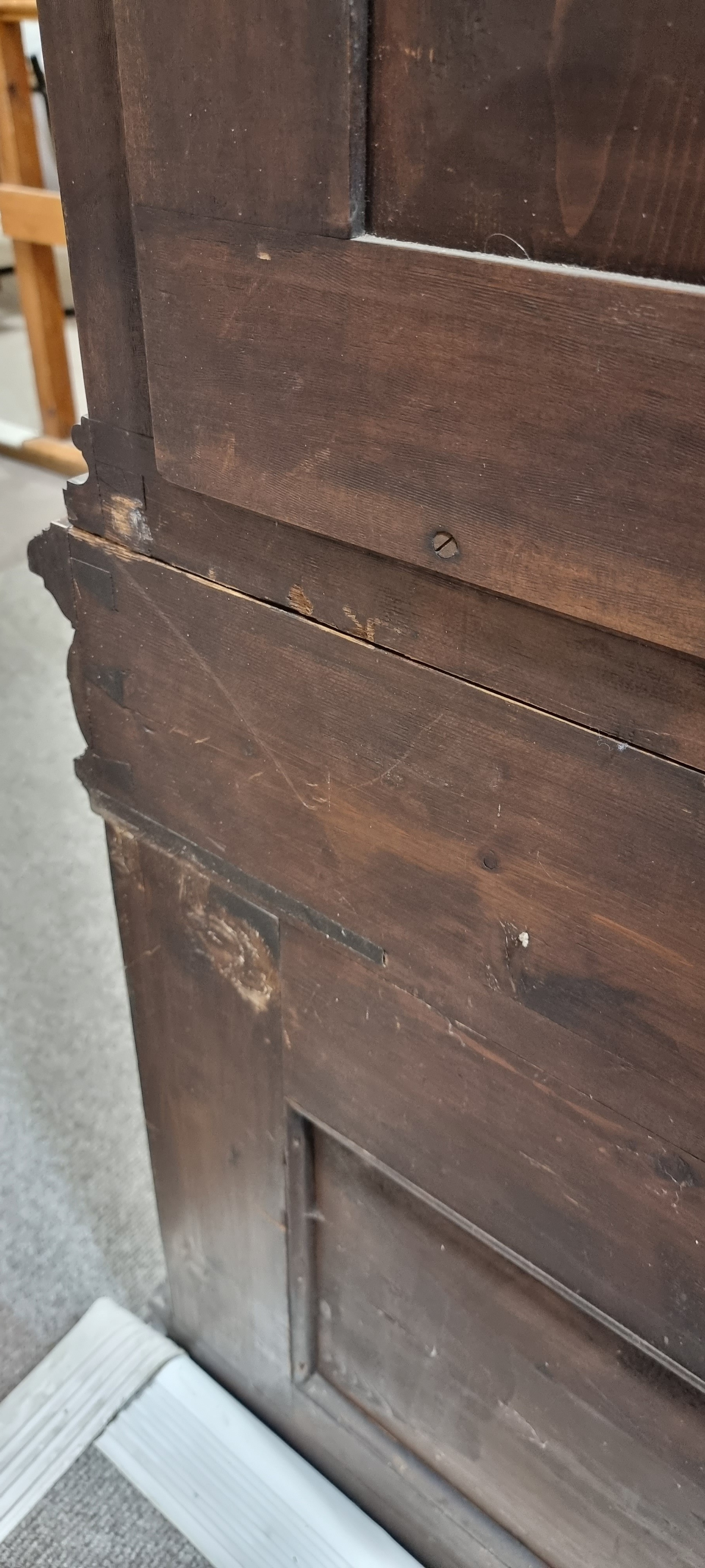 Generally in very good original condition, several of the square wooden blocks from the dentile pediment are missing, no splits or repairs in the panels, would benefit from re-polishing, generally very good