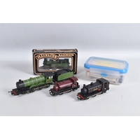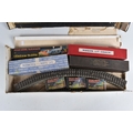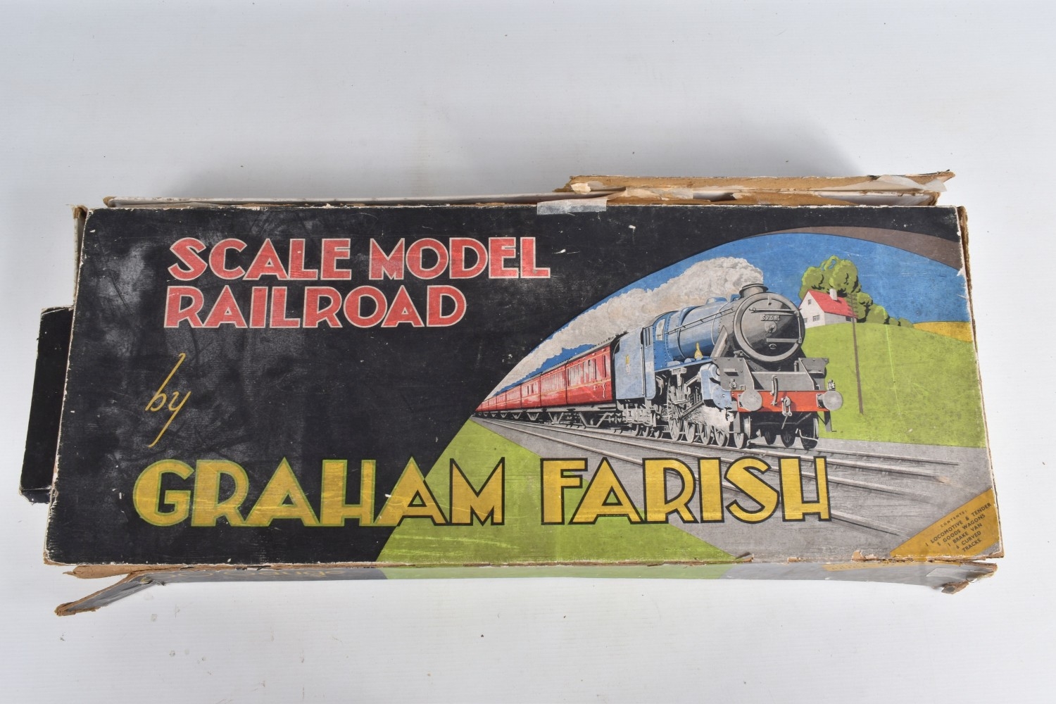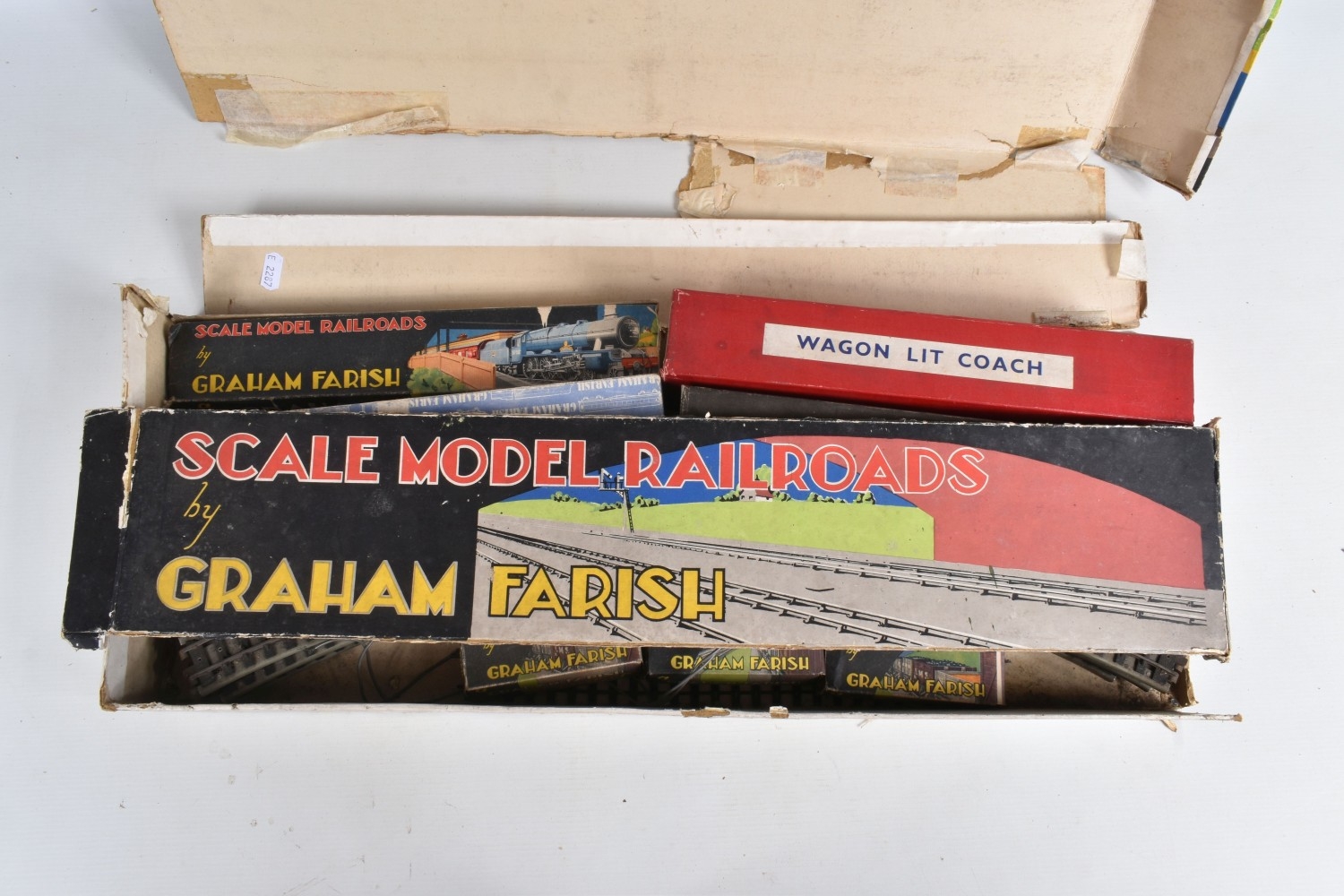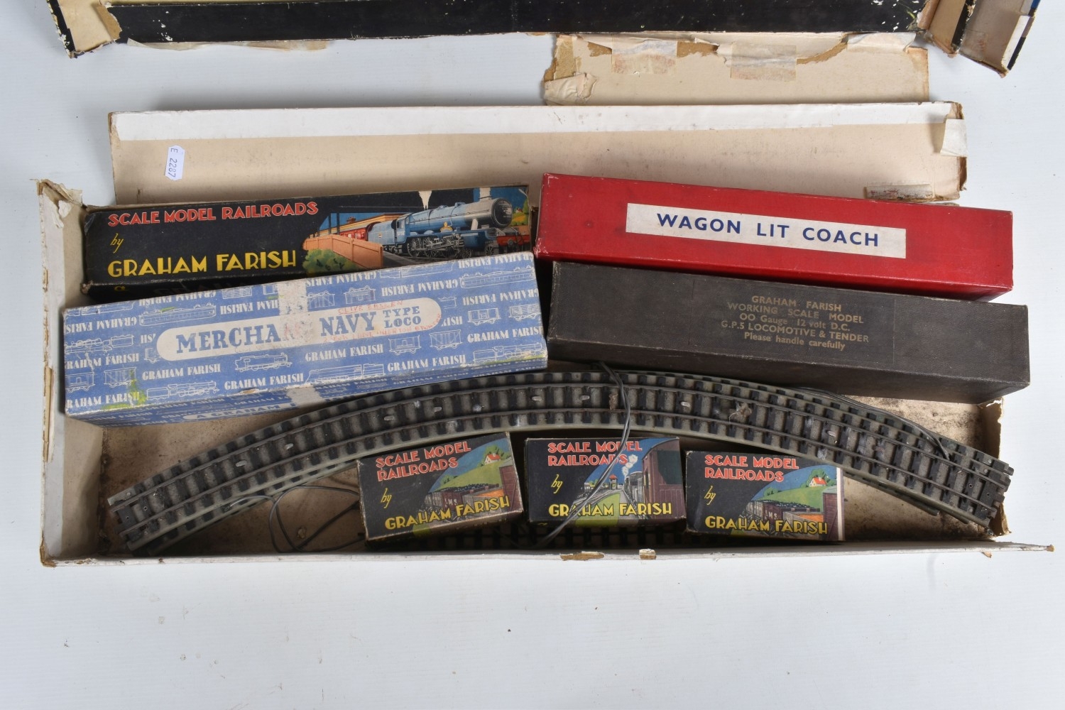 A QUANTITY OF BOXED GRAHAM FARISH OO GAUGE MODEL RAILWAY ITEMS, Merchant Navy class locomotive and tender, missing nameplates and cabside numbers, front pony truck detached, B.R. blue livery, B.R. logo on one side of tender only (possibly 'Exeter' No.34101), with original paperwork, 'GP5' class 5MT No.44753, B.R. black livery, partially dismantled, Pullman Coach 'Phyllis' and Wagon Lits coach both with deformation to plastic bodyshells, a Steel Mineral wagon in grey (incorrect box) and two 7 plank coal wagons, one with metal fatigue to body, the other repainted and missing wheels, all items in playworn condition with paint loss and wear in addition to any problems noted above, small quantity of track, all boxes with some damage and wear, missing flaps etc., all contained in a damaged set box