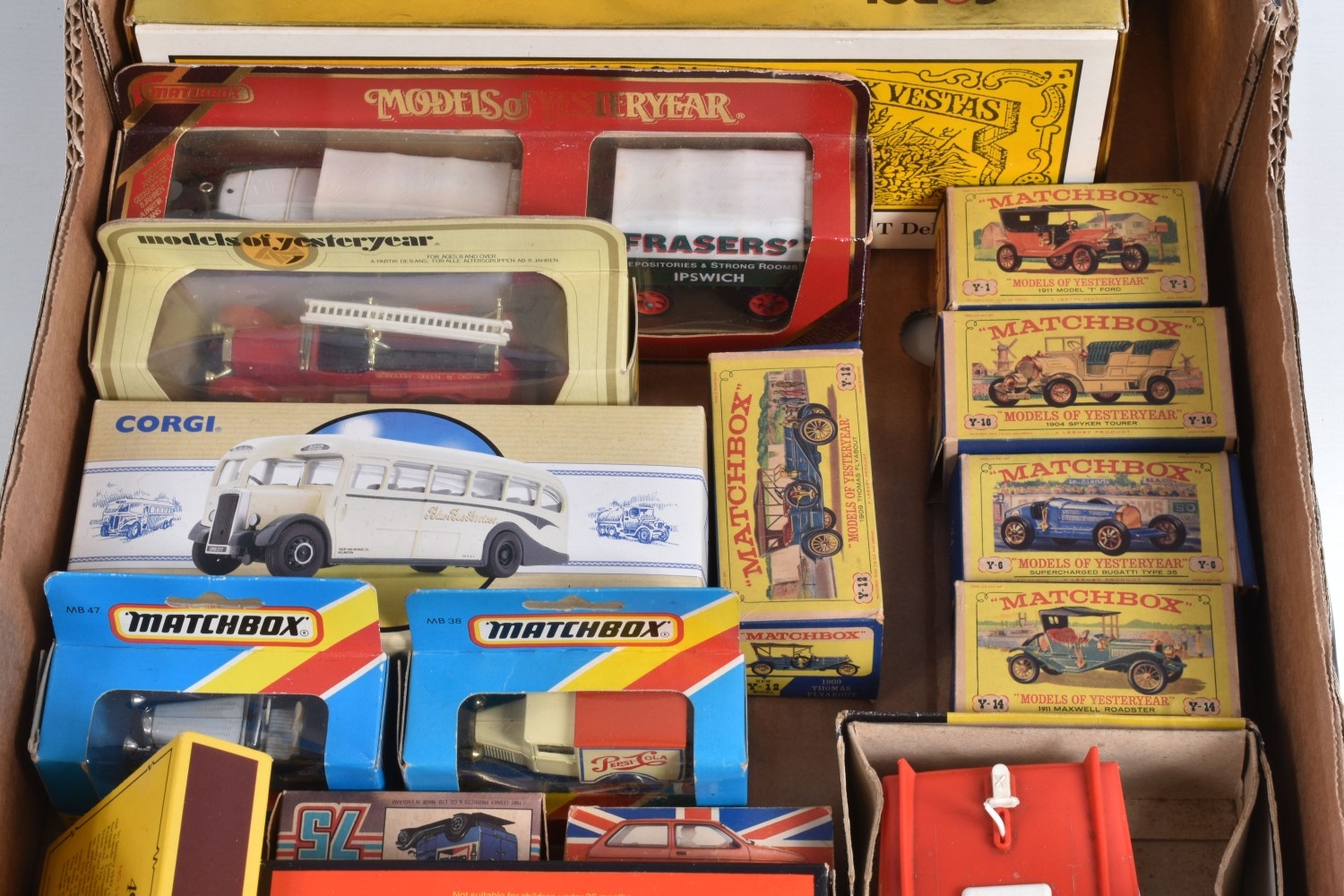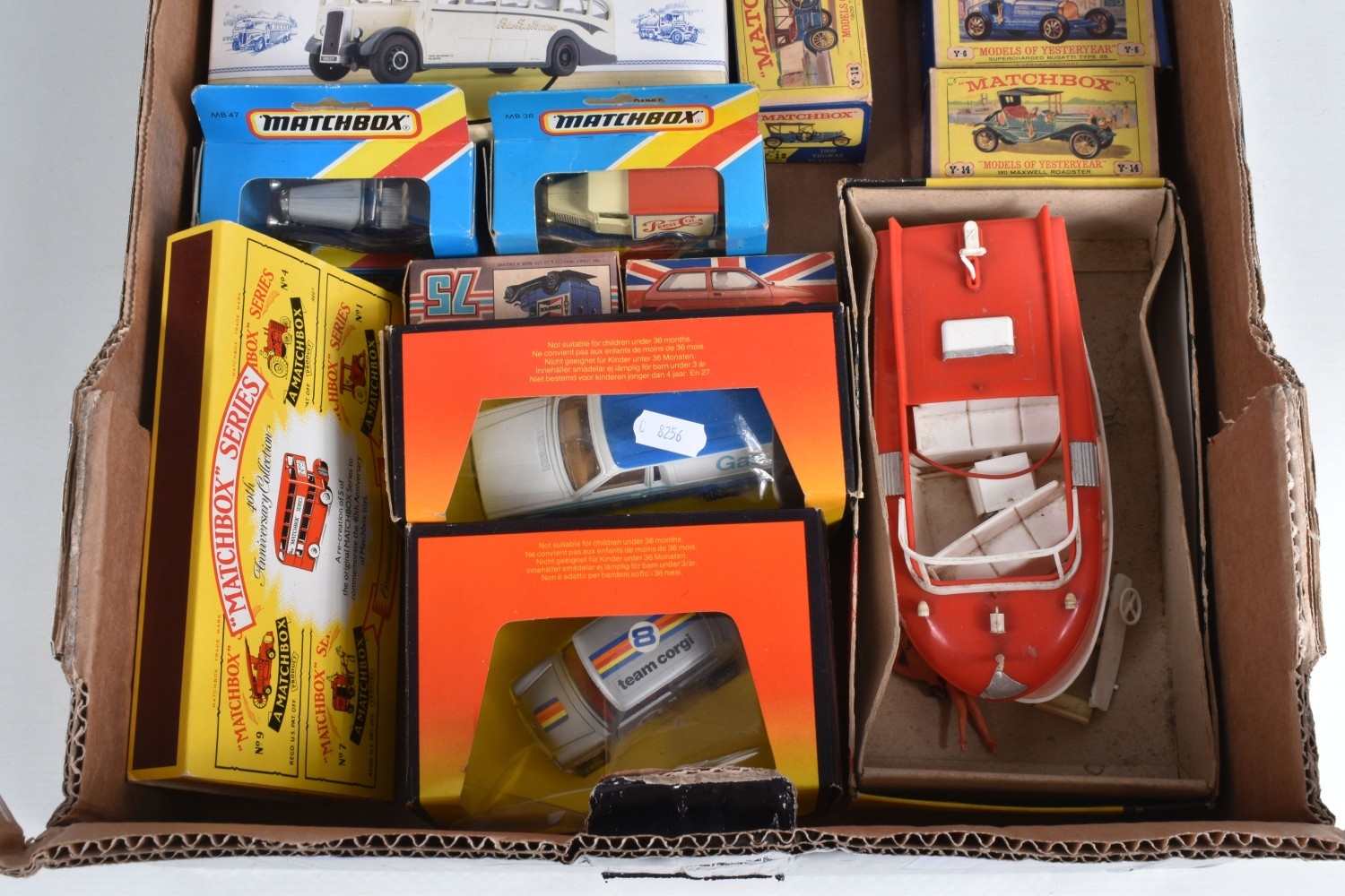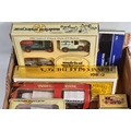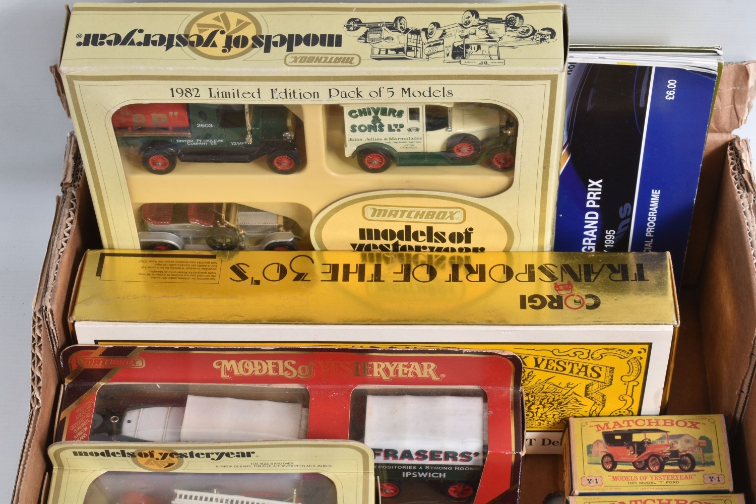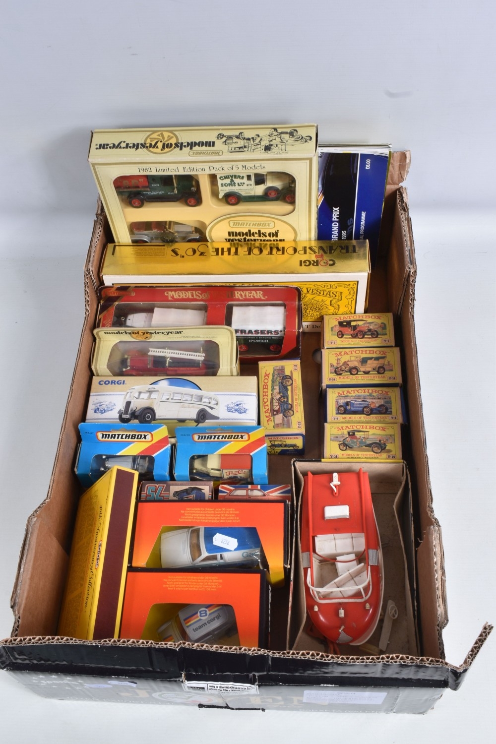 A QUANTITY OF BOXED DIECAST VEHICLES, to include Corgi Transport of the 1930's set, No.R2500, Corgi Classics, Matchbox Models of Yesteryear 1960's and later issues including 1982 Limited Edition Pack of 5 Models and Foden C type Steam Wagon and Trailer - Fraser's, with a damaged wheel, No.Y-27, Matchbox Series 40th Anniversary Collection Commemorative Pack, No.G-1, boxed constructed Scalecraft Speedboat & Water Skier kit, contents not checked and has some damage, with a quantity of Jordan related Motor Racing literature including one programme signed by Jarno Trulli and a British Grand Prix programme and racecard from1995, all items appear complete and in good condition, damage and wear to some boxes