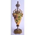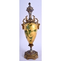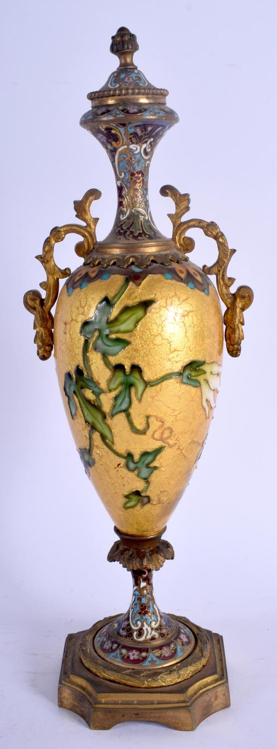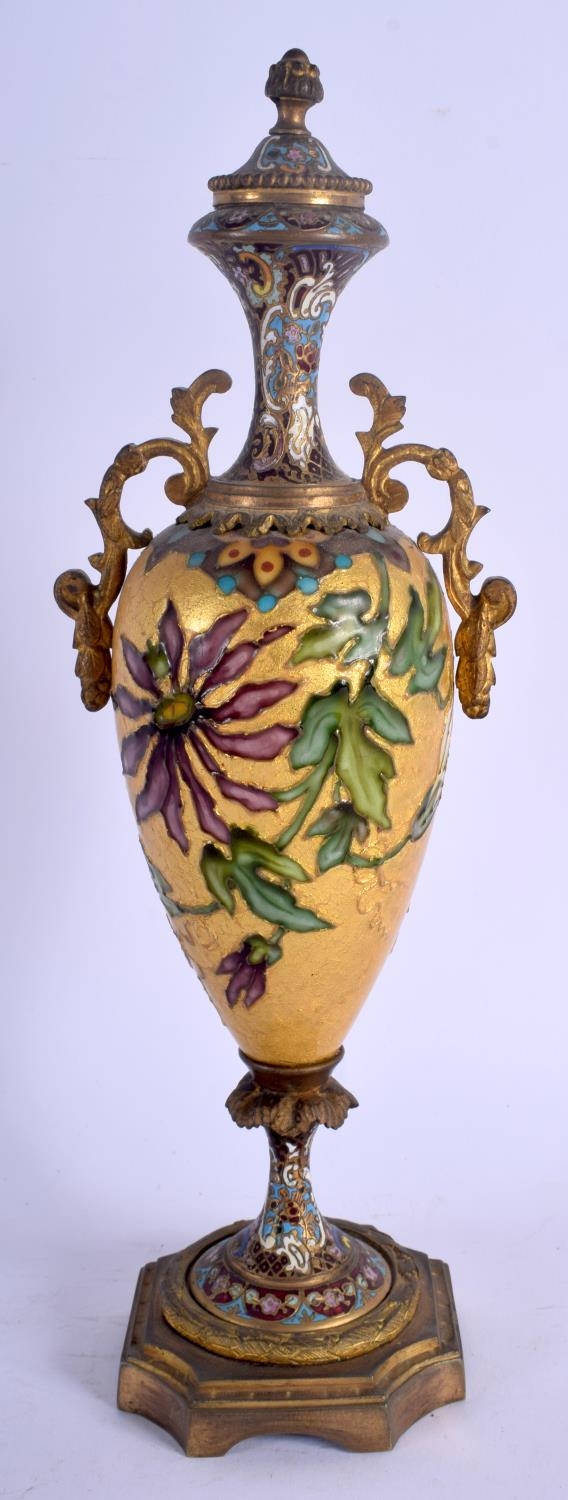 A 19TH CENTURY FRENCH CHAMPLEVE ENAMEL GILDED VASE AND COVER decorated with flowers. 30 cm high.