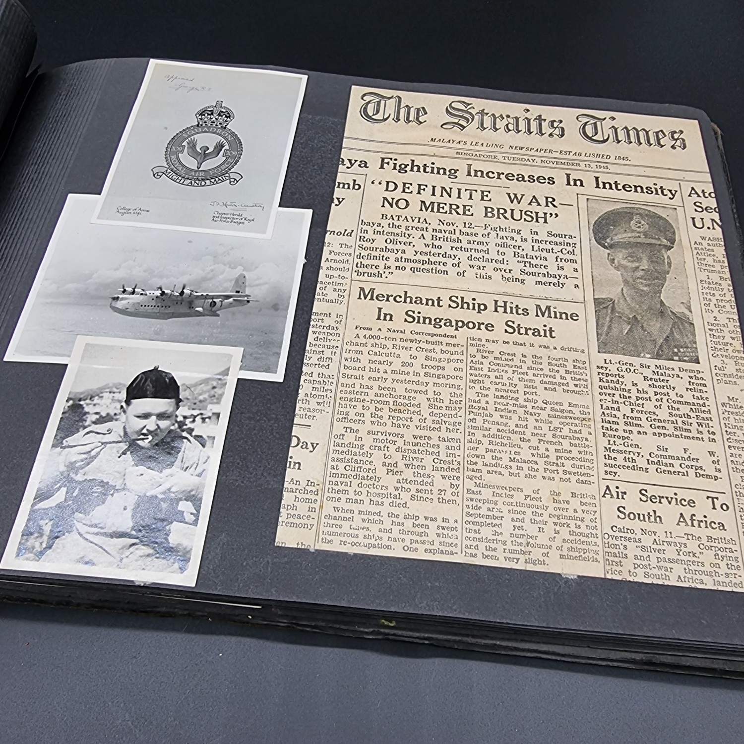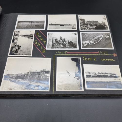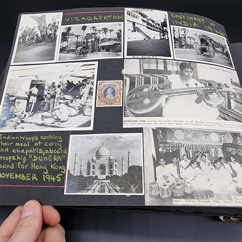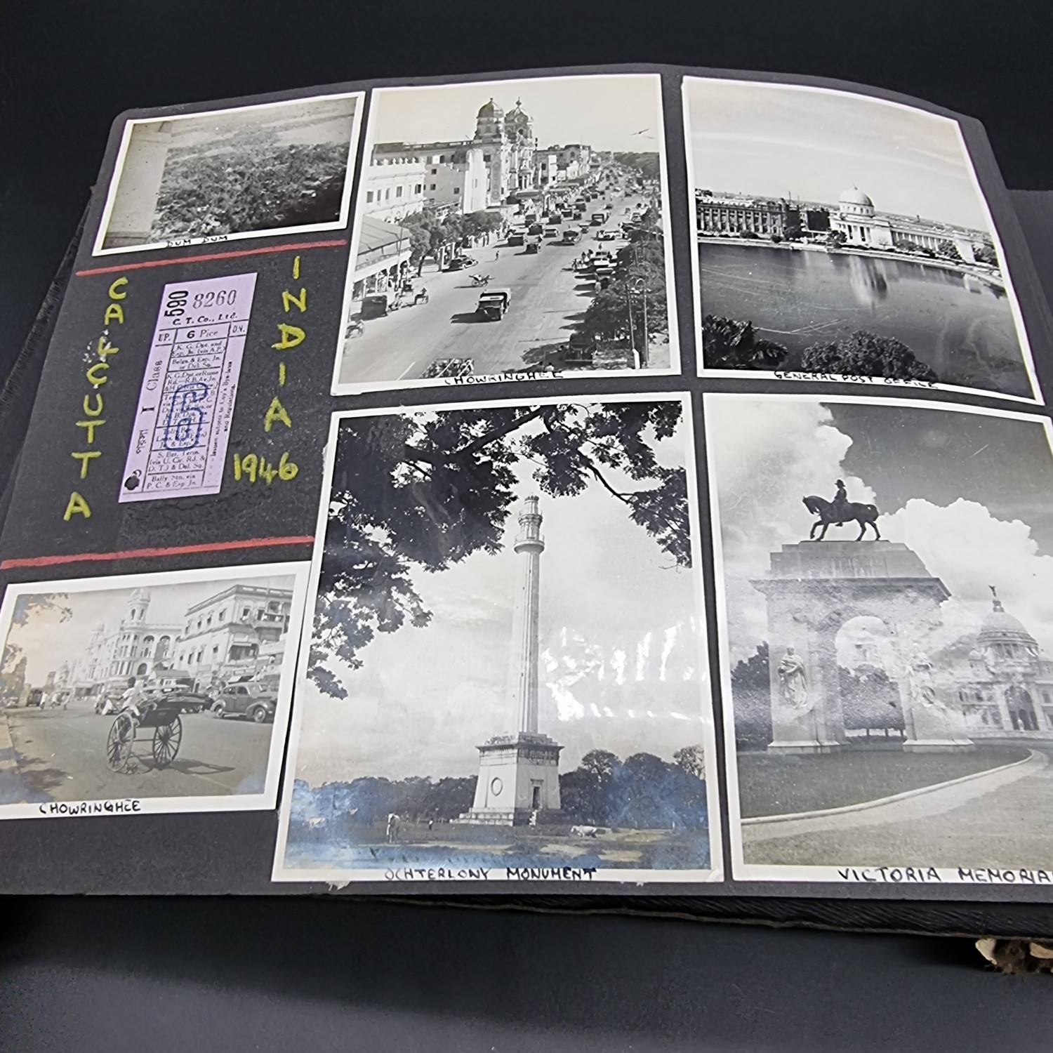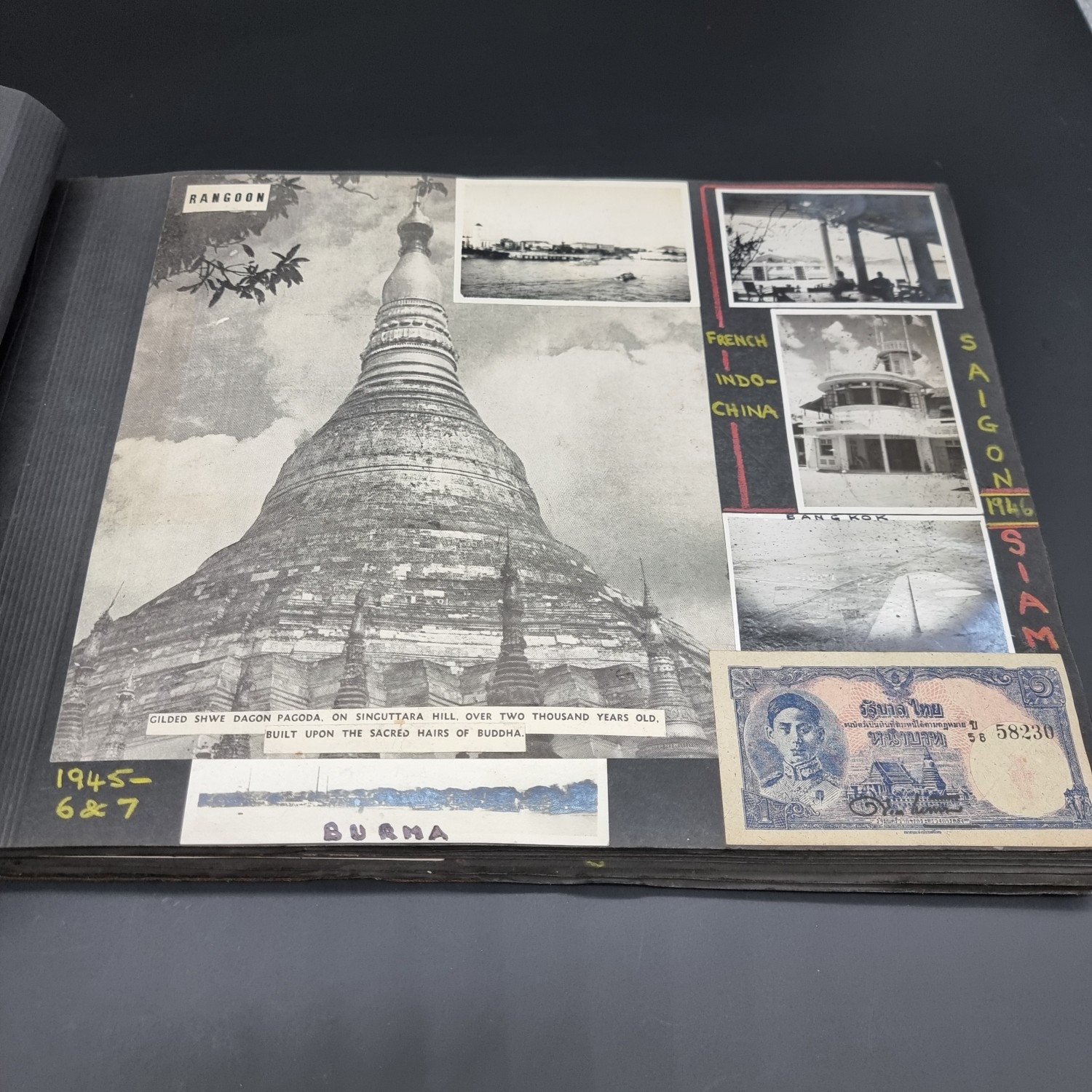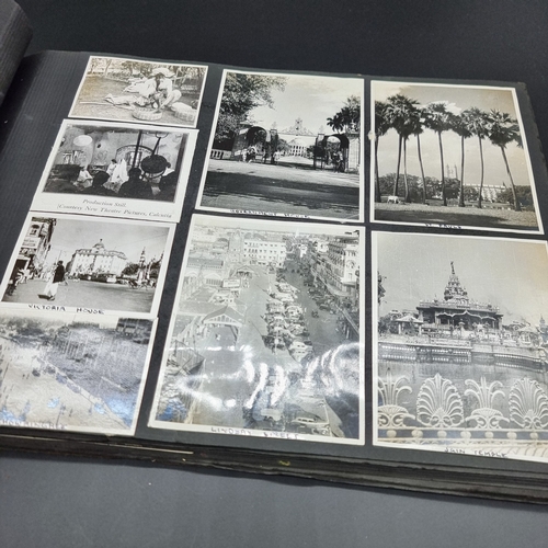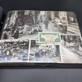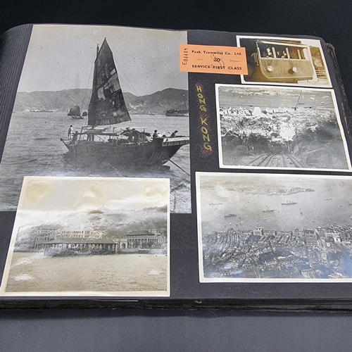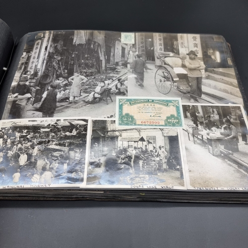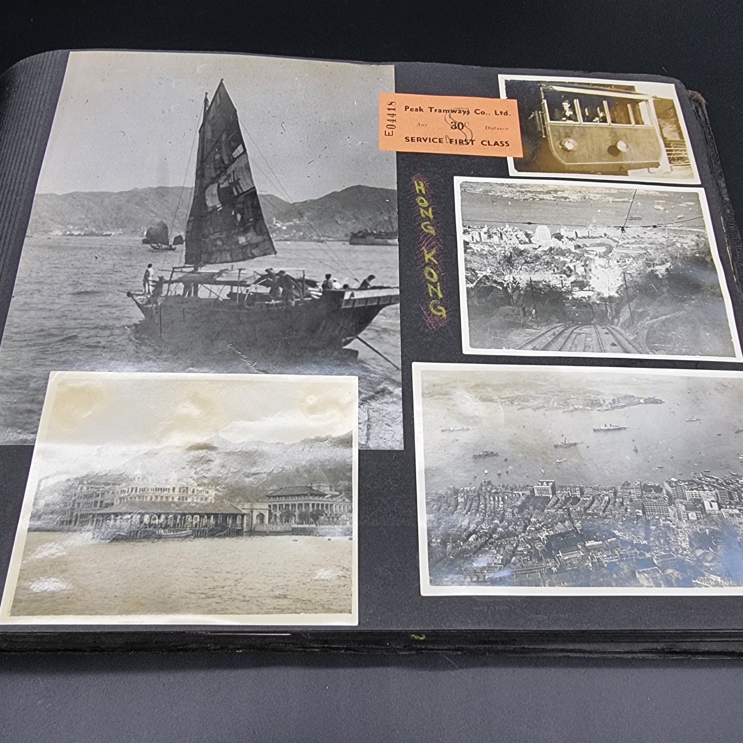 PHOTOGRAPH ALBUM: Hong Kong, Kowloon and Singapore, 1946, images recording the period just after the Japanese occupation: approx 180 b&w photographs of various sizes, some original and others commercial, numerous street scenes including Wanghai market, Queen Street and residences of Aw-Boon-Haw and Aw-Boon-Par, Chinese millionaires: some related tickets, stamps, banknotes and cuttings tipped-in: contained in black buckram album of period, oblong 4to. (1)