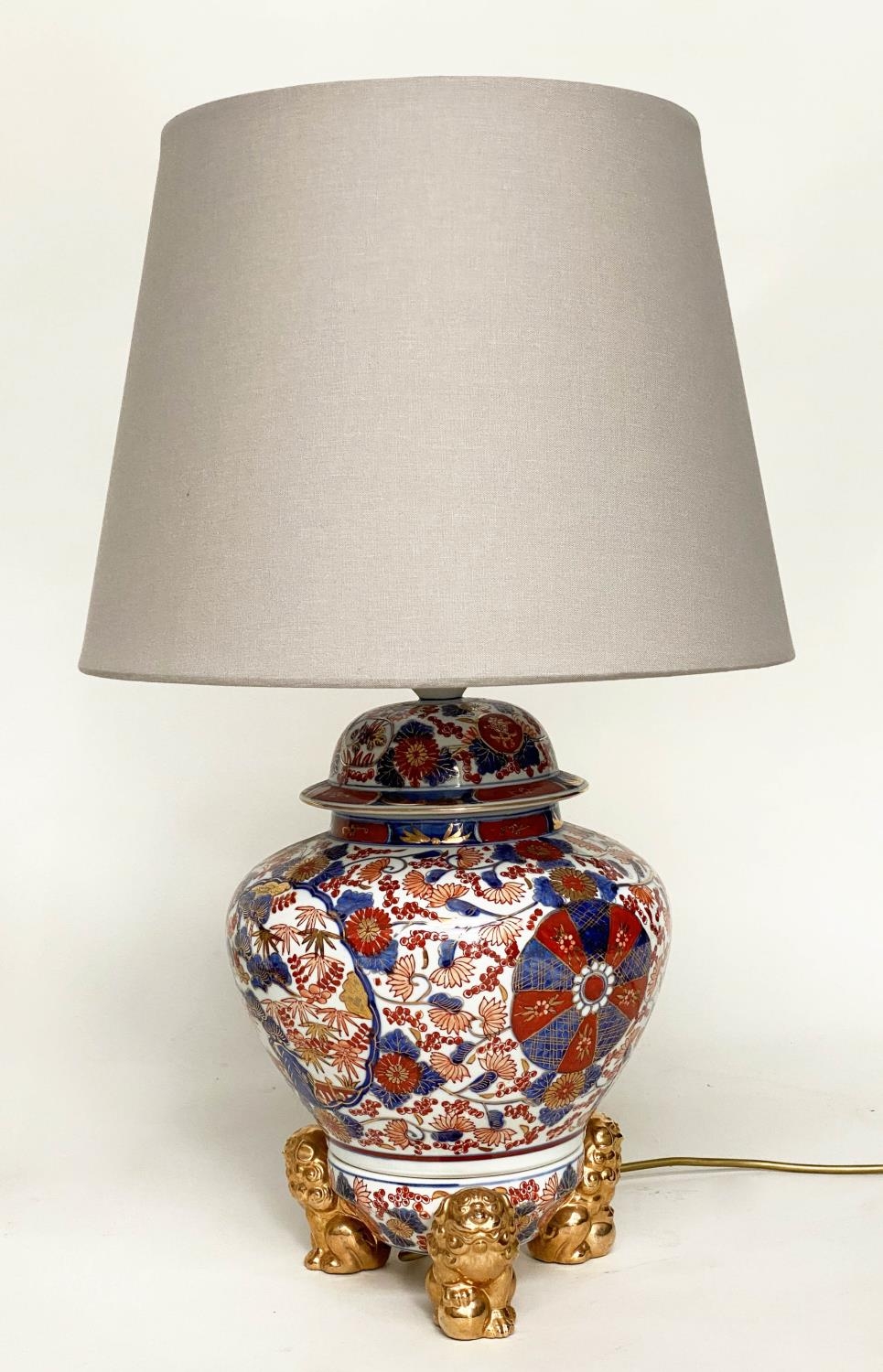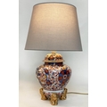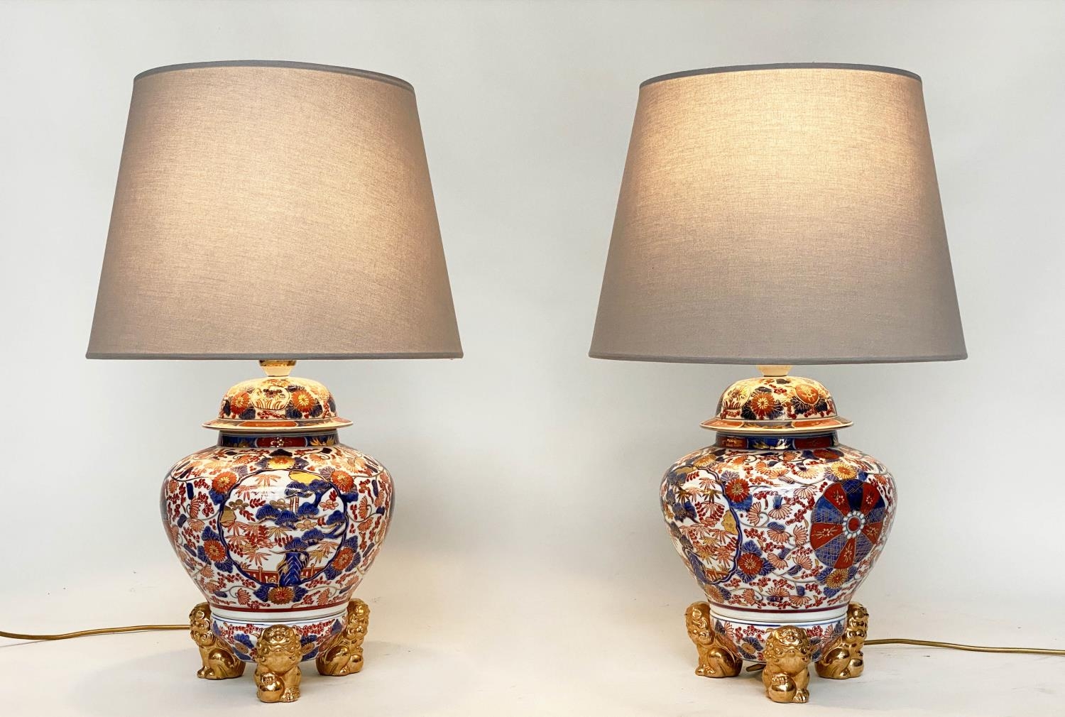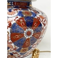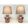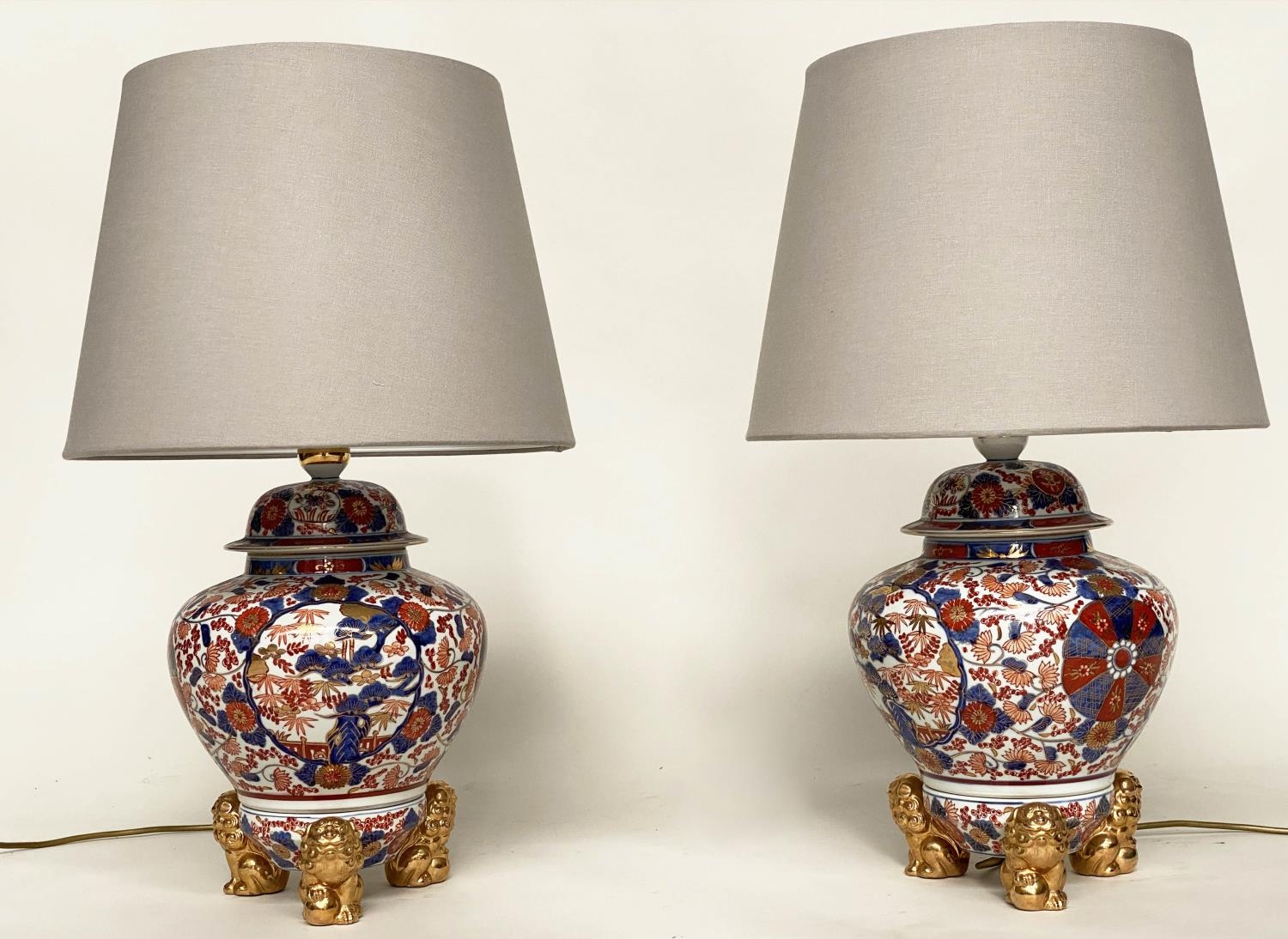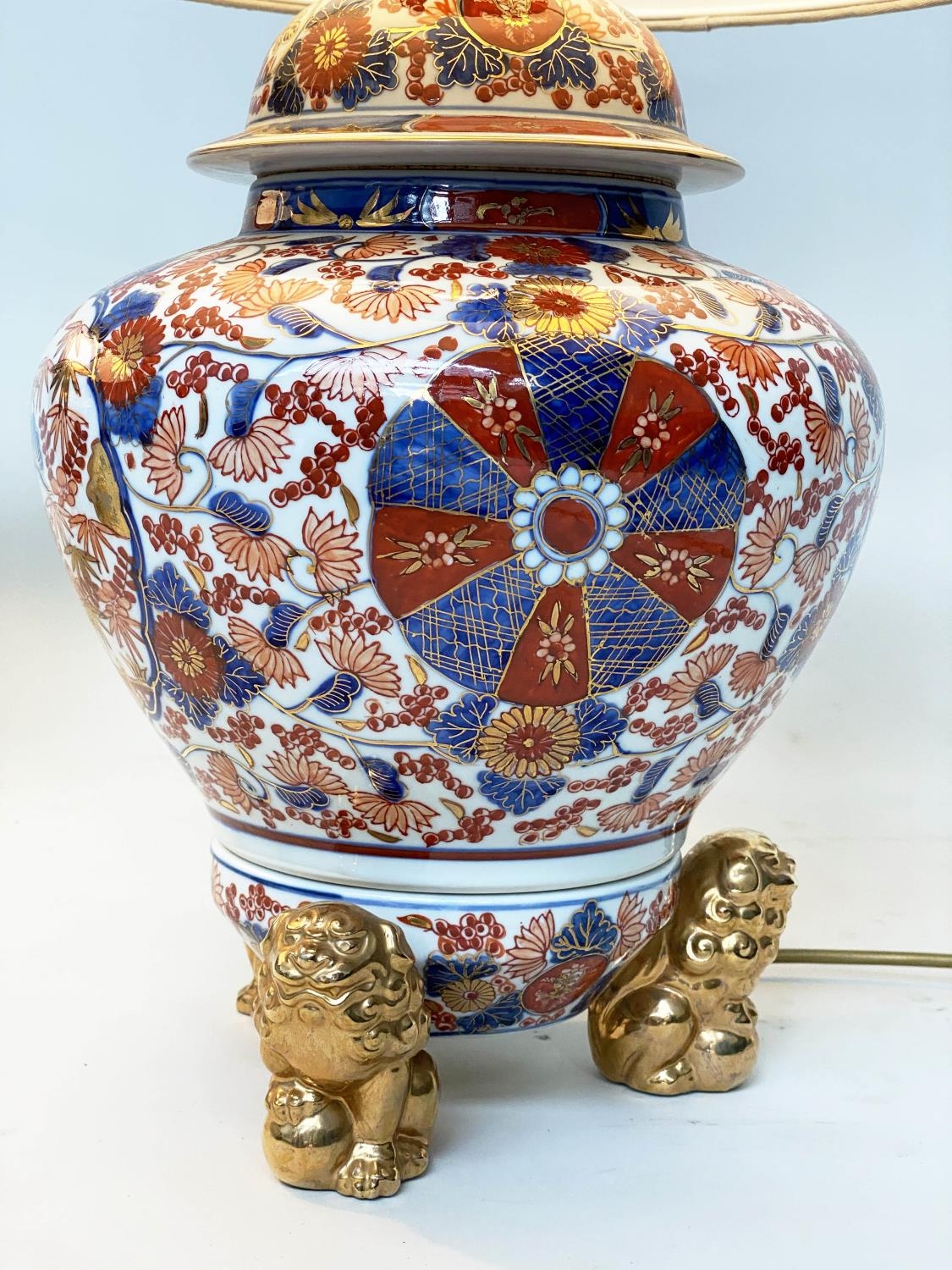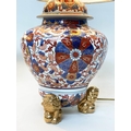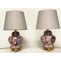 TABLE LAMPS, a pair, Imari design ceramic of lidded vase form with Dogs of Foo gilt supports (with shades), 72cm H. (2)