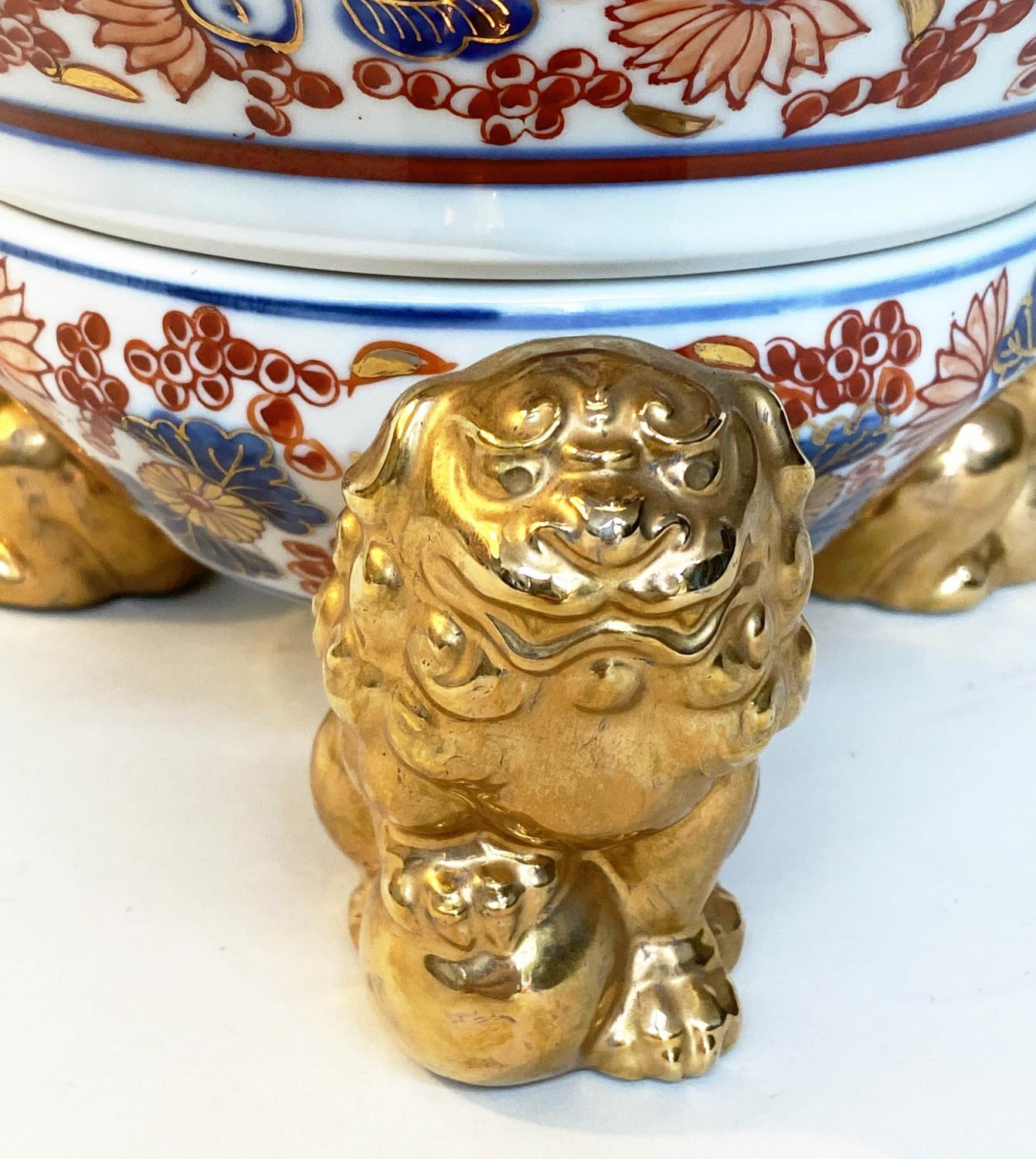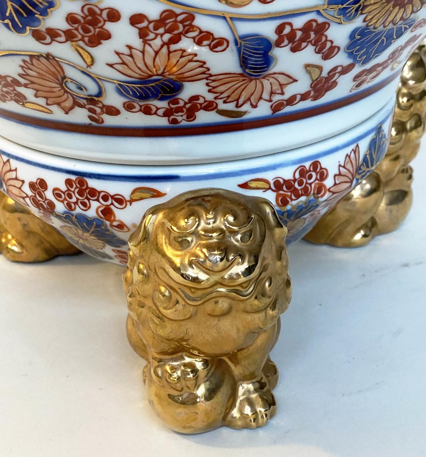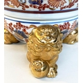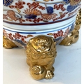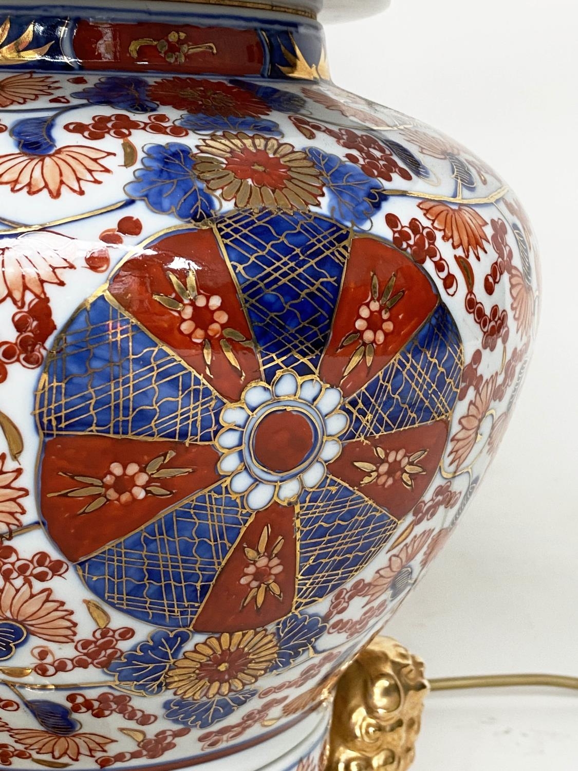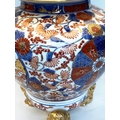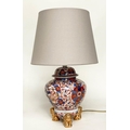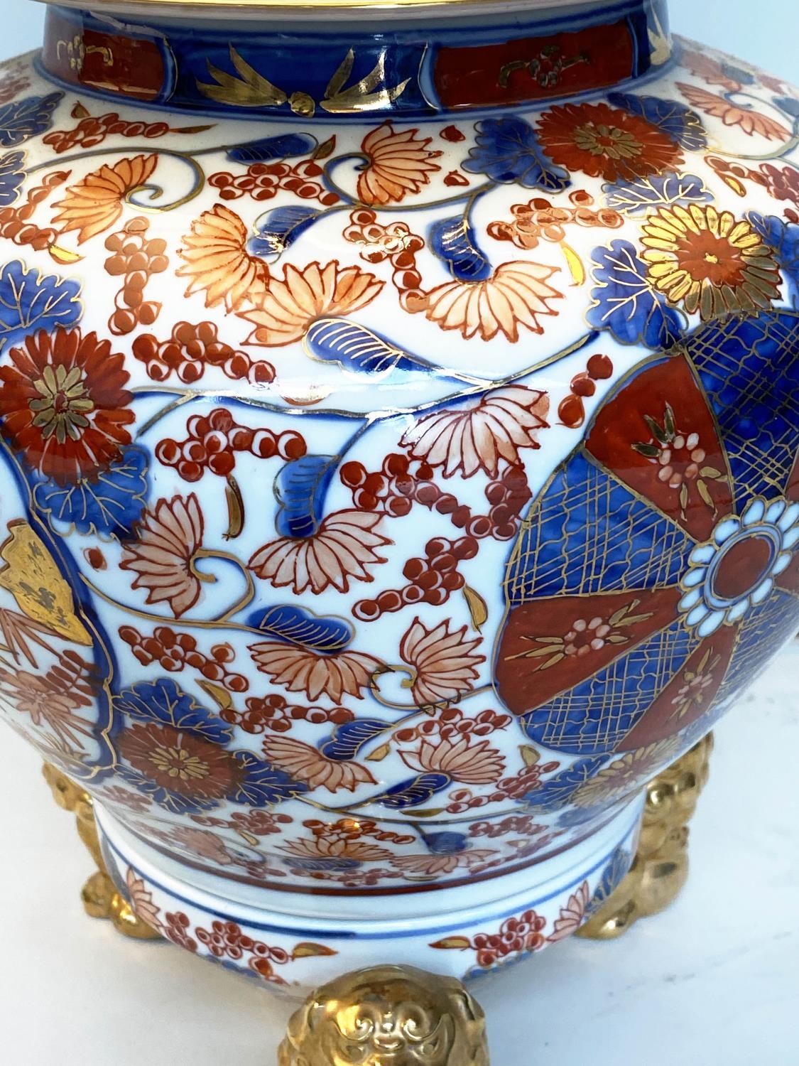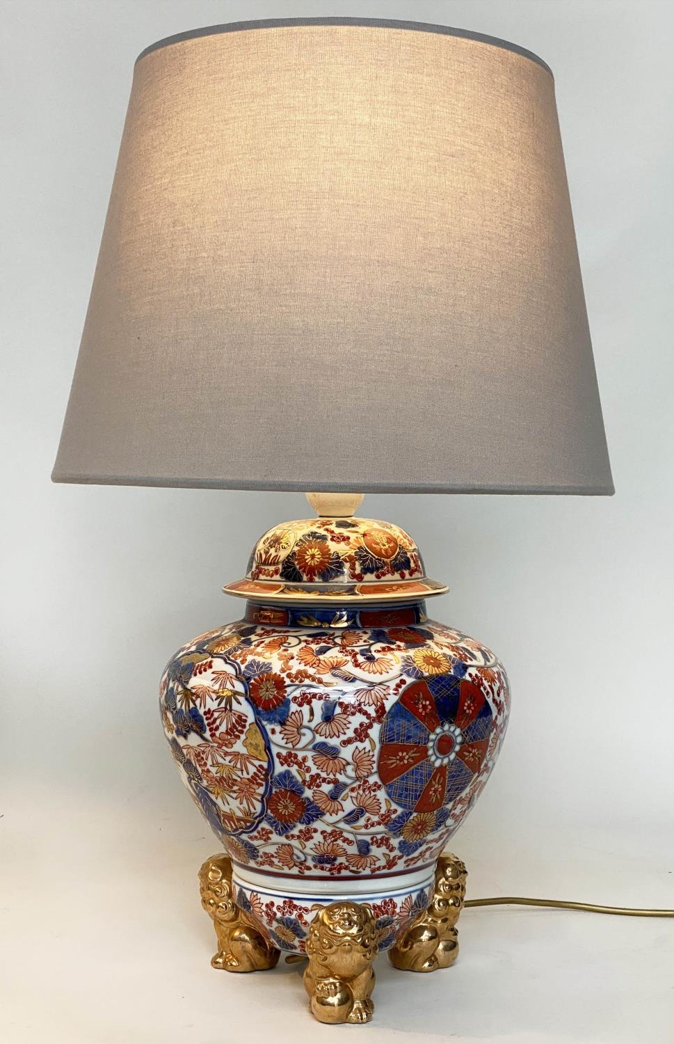 TABLE LAMPS, a pair, Imari design ceramic of lidded vase form with Dogs of Foo gilt supports (with shades), 72cm H. (2)