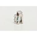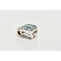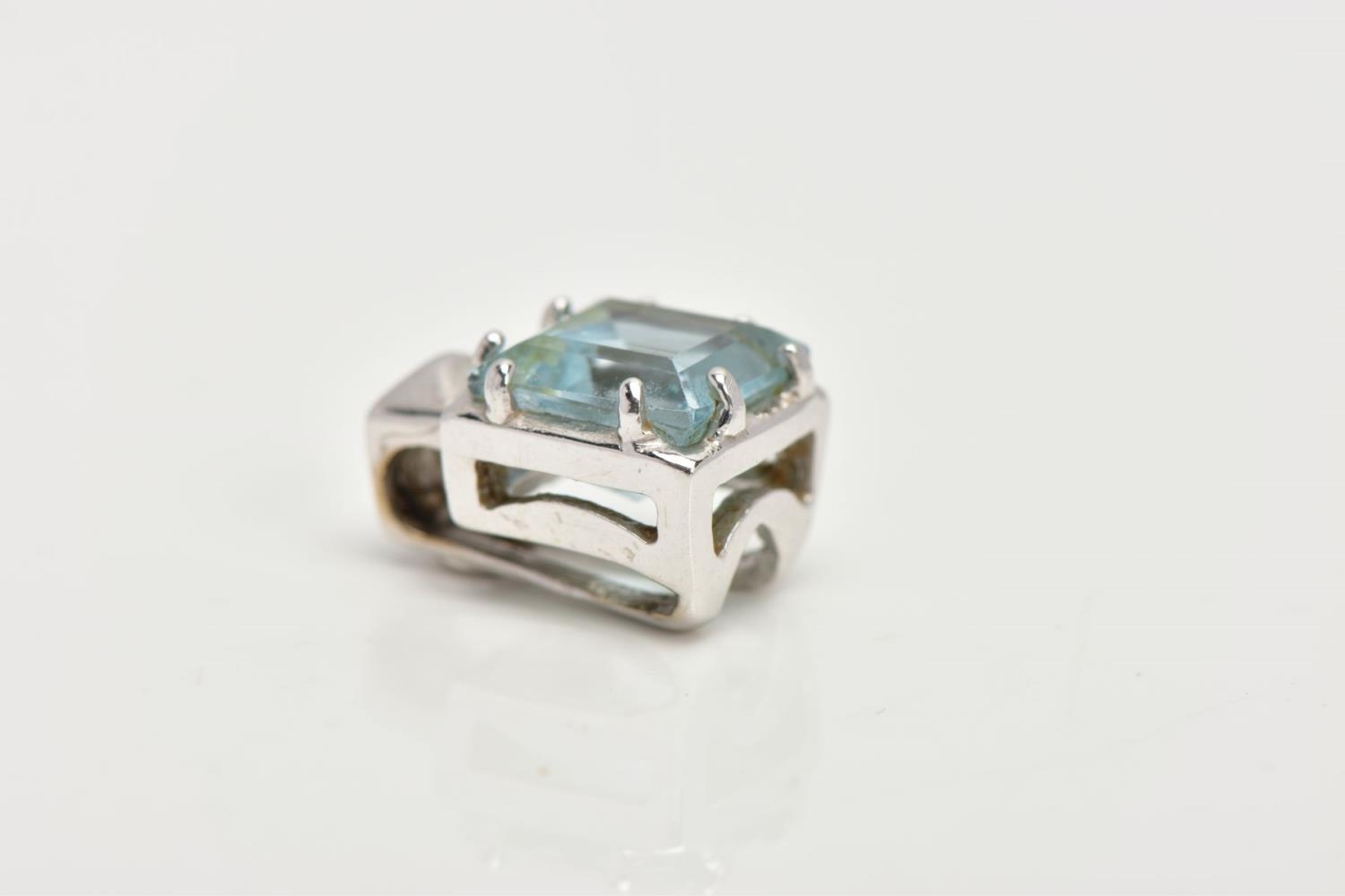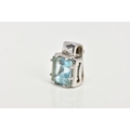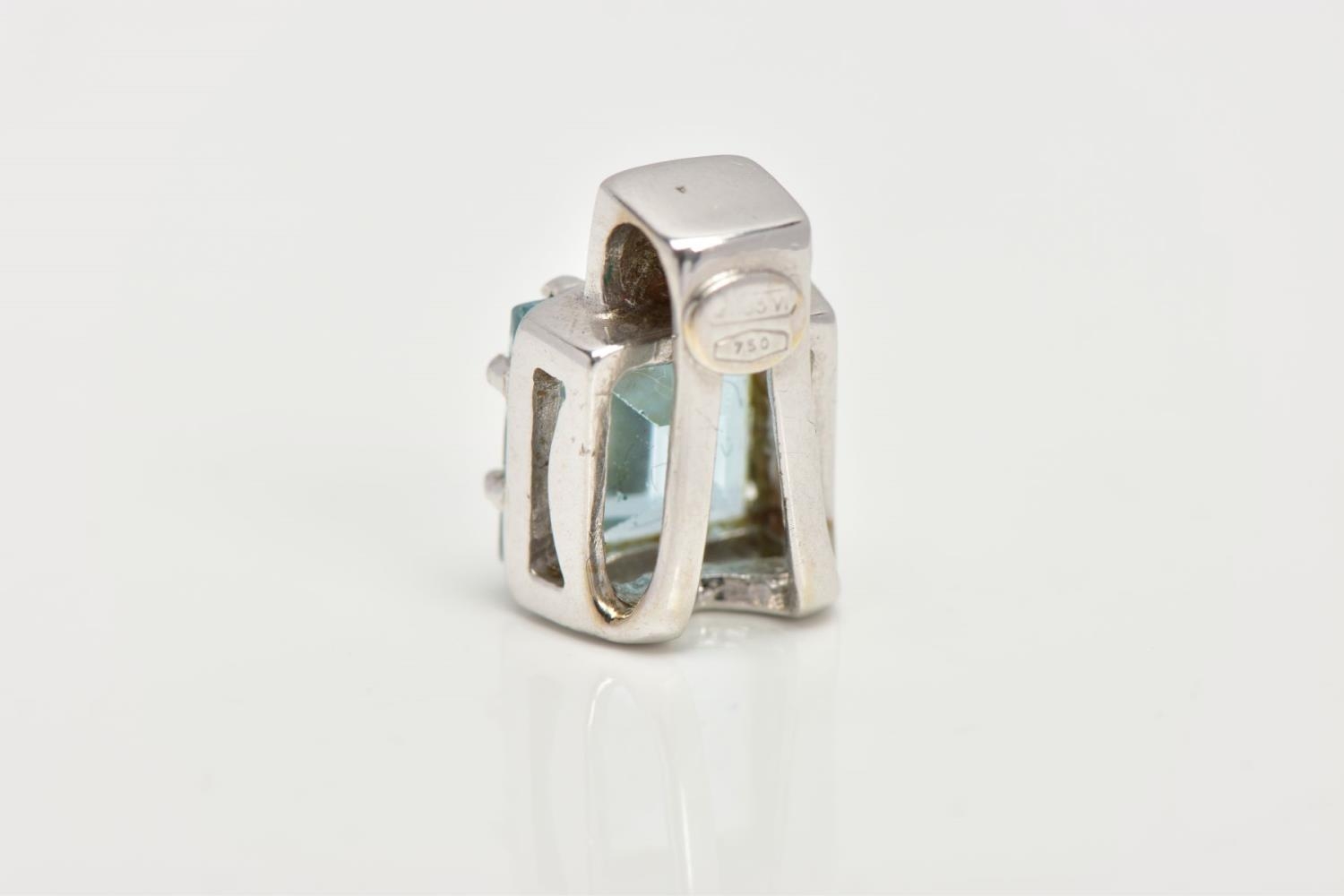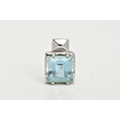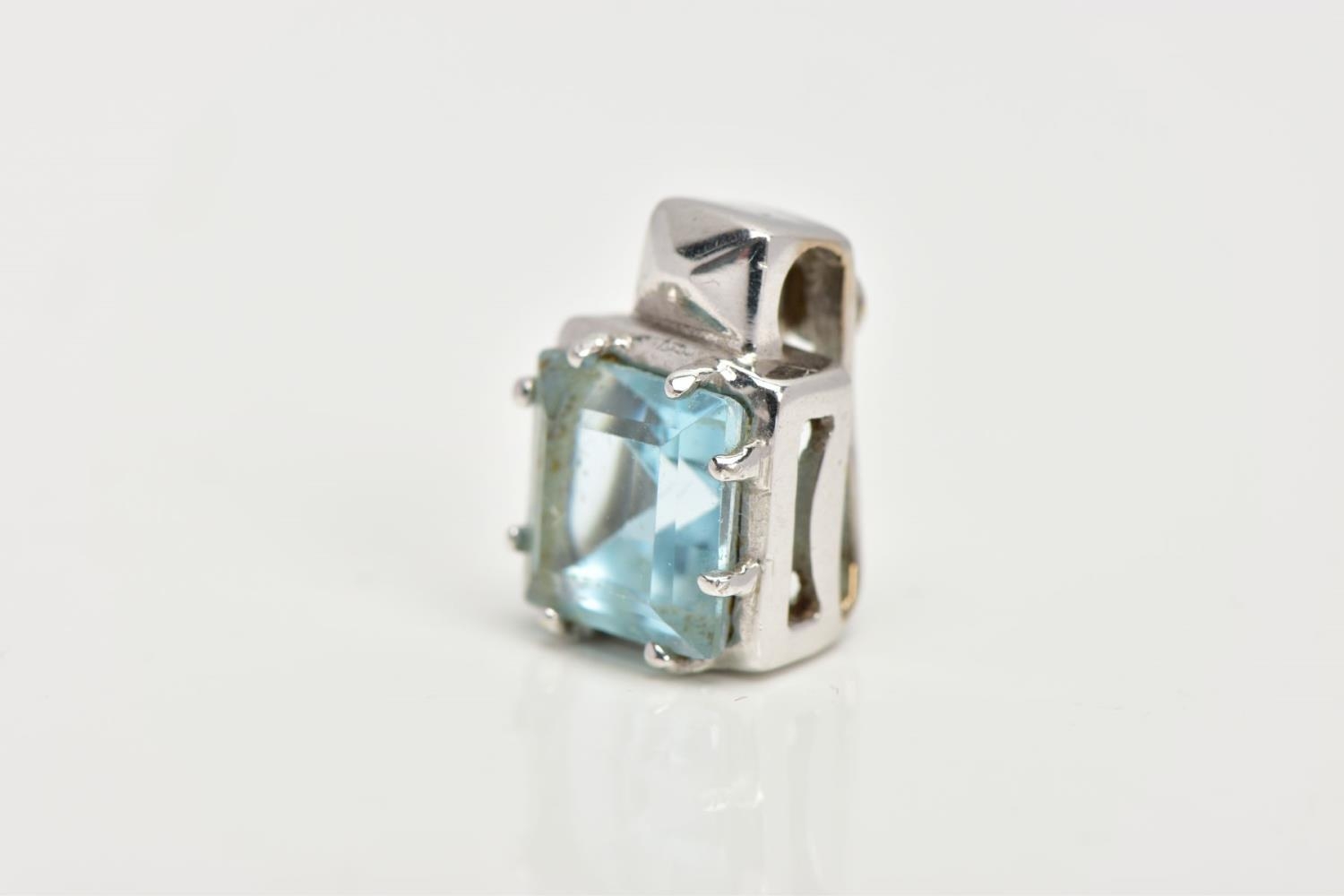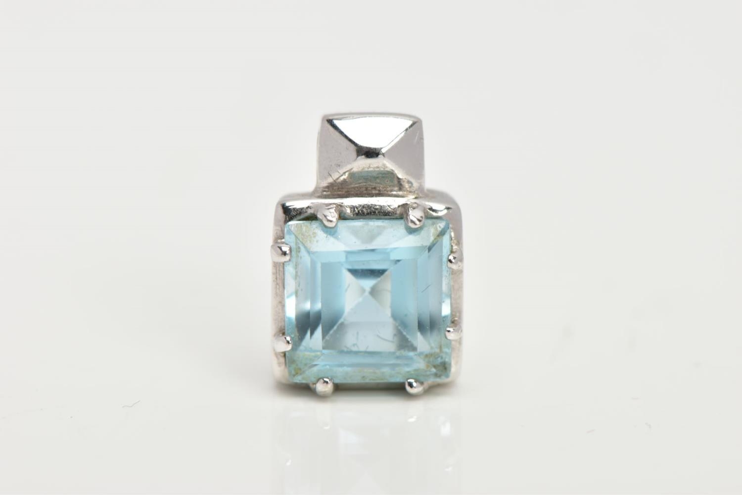 A TOPAZ PENDANT, the square cut blue topaz within an eight claw setting to the square mount and rectangular suspension loop, stamped '750', length 12mm, approximate gross weight 3.4 grams (condition report: overall good condition, light to moderate general wear)