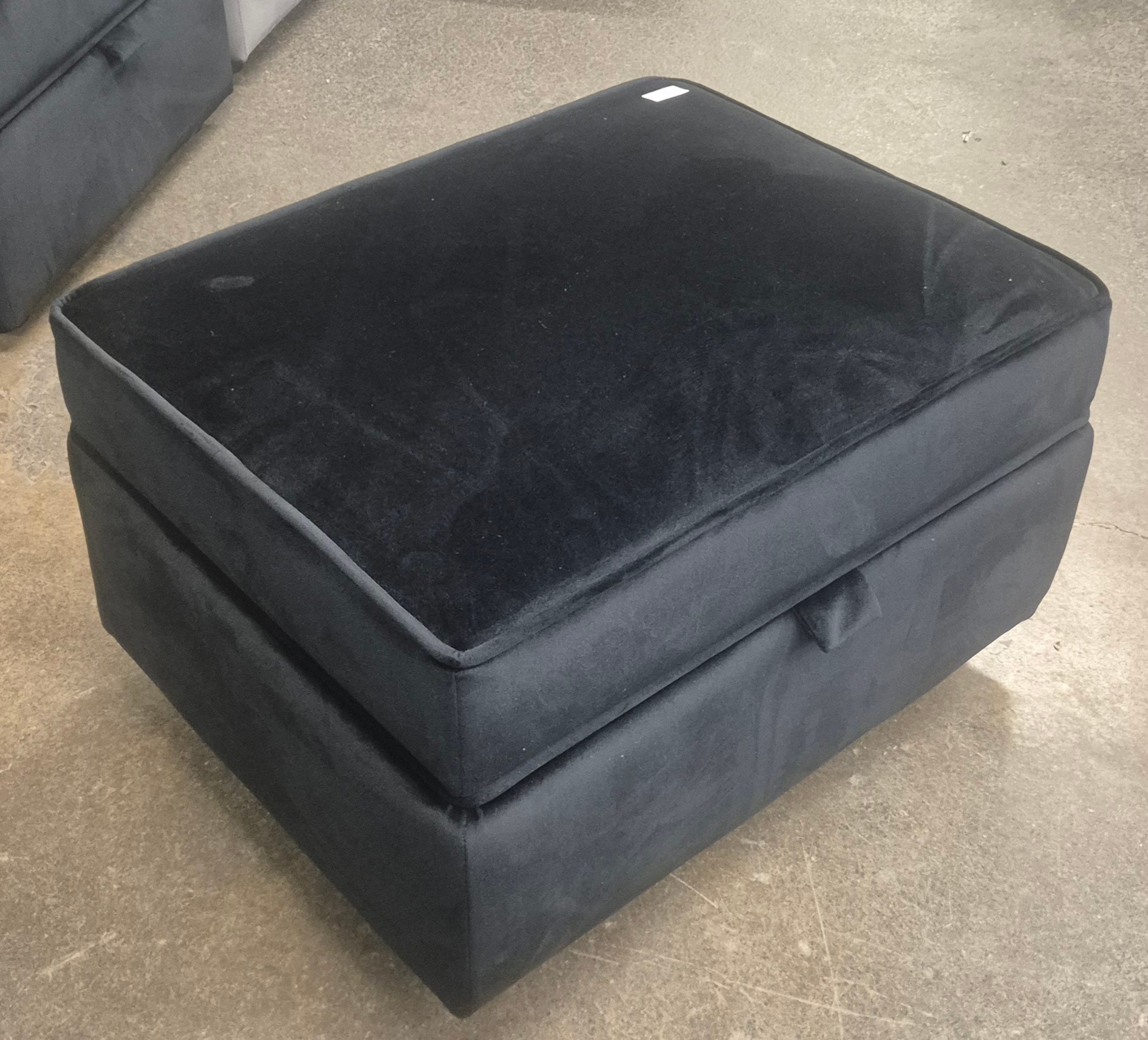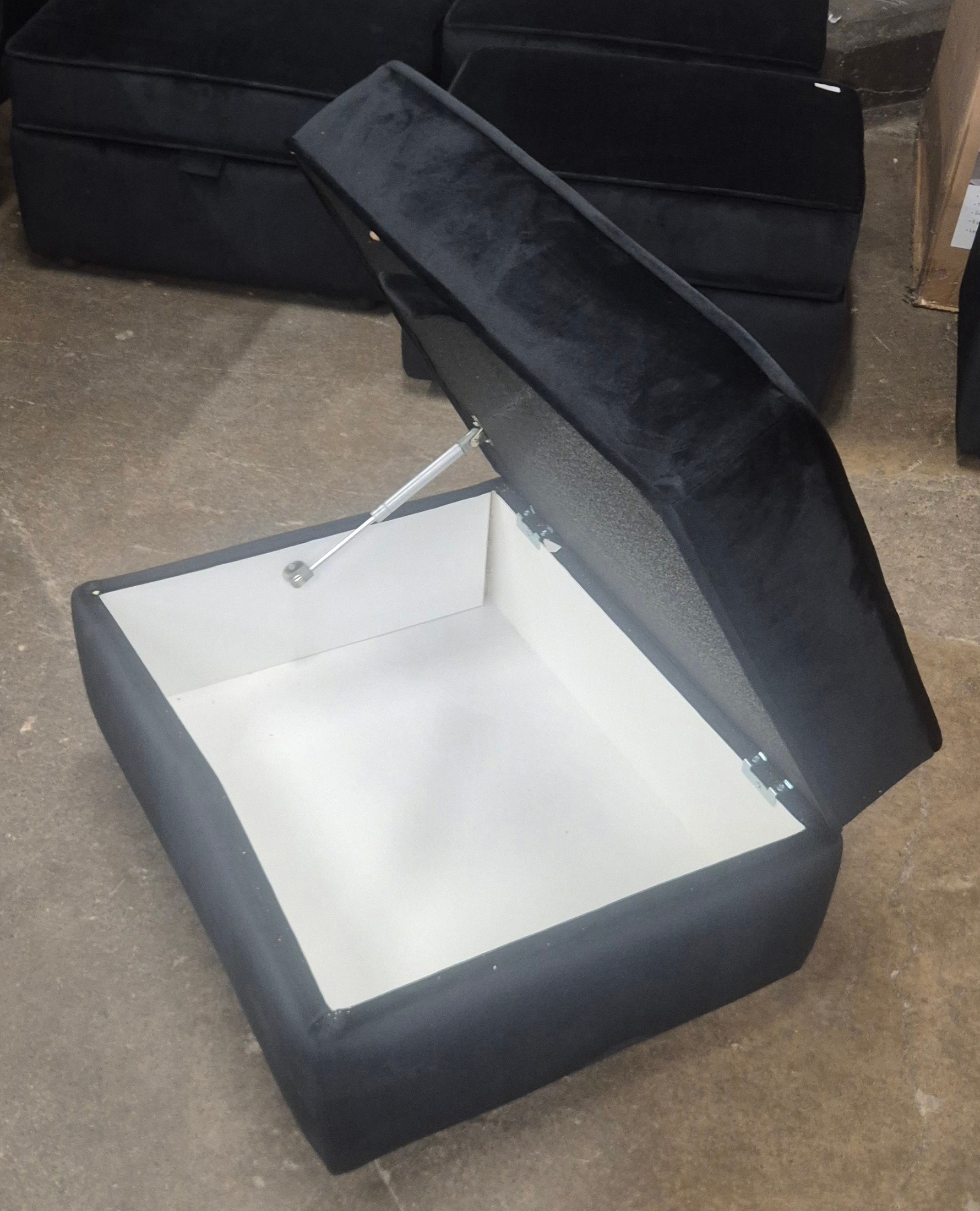 A black Hoxton velvet upholstered storage footstool