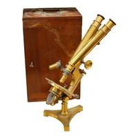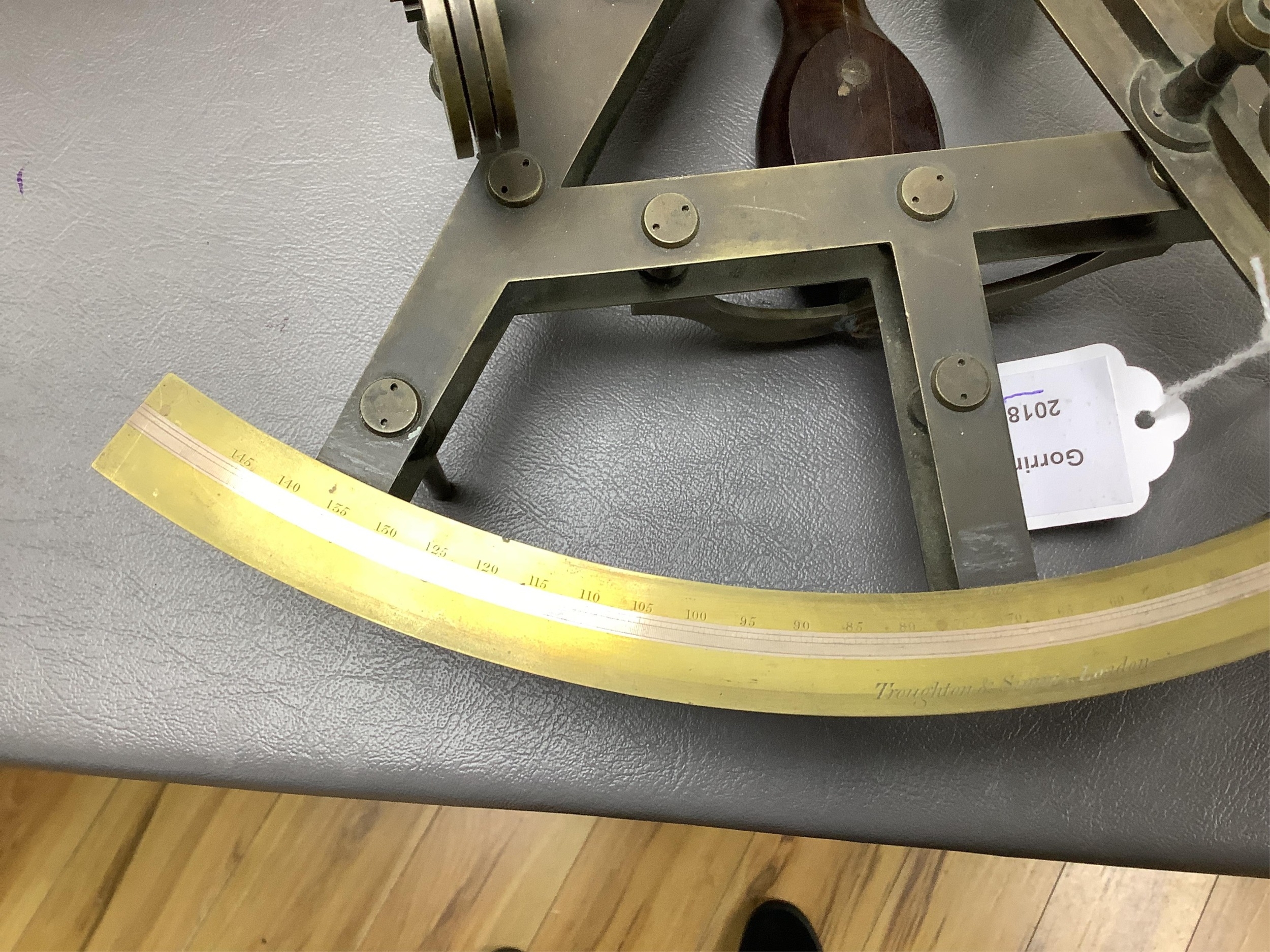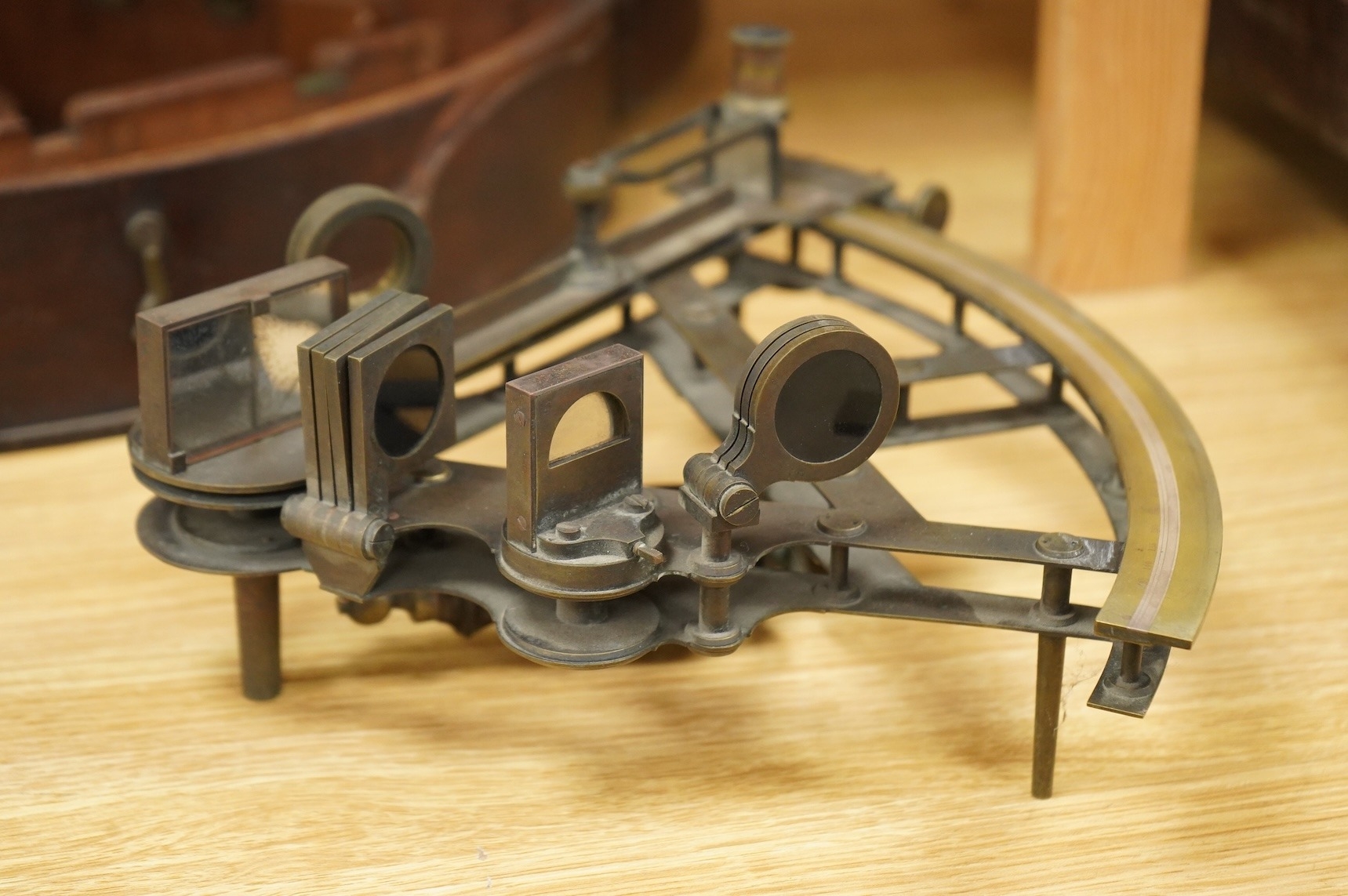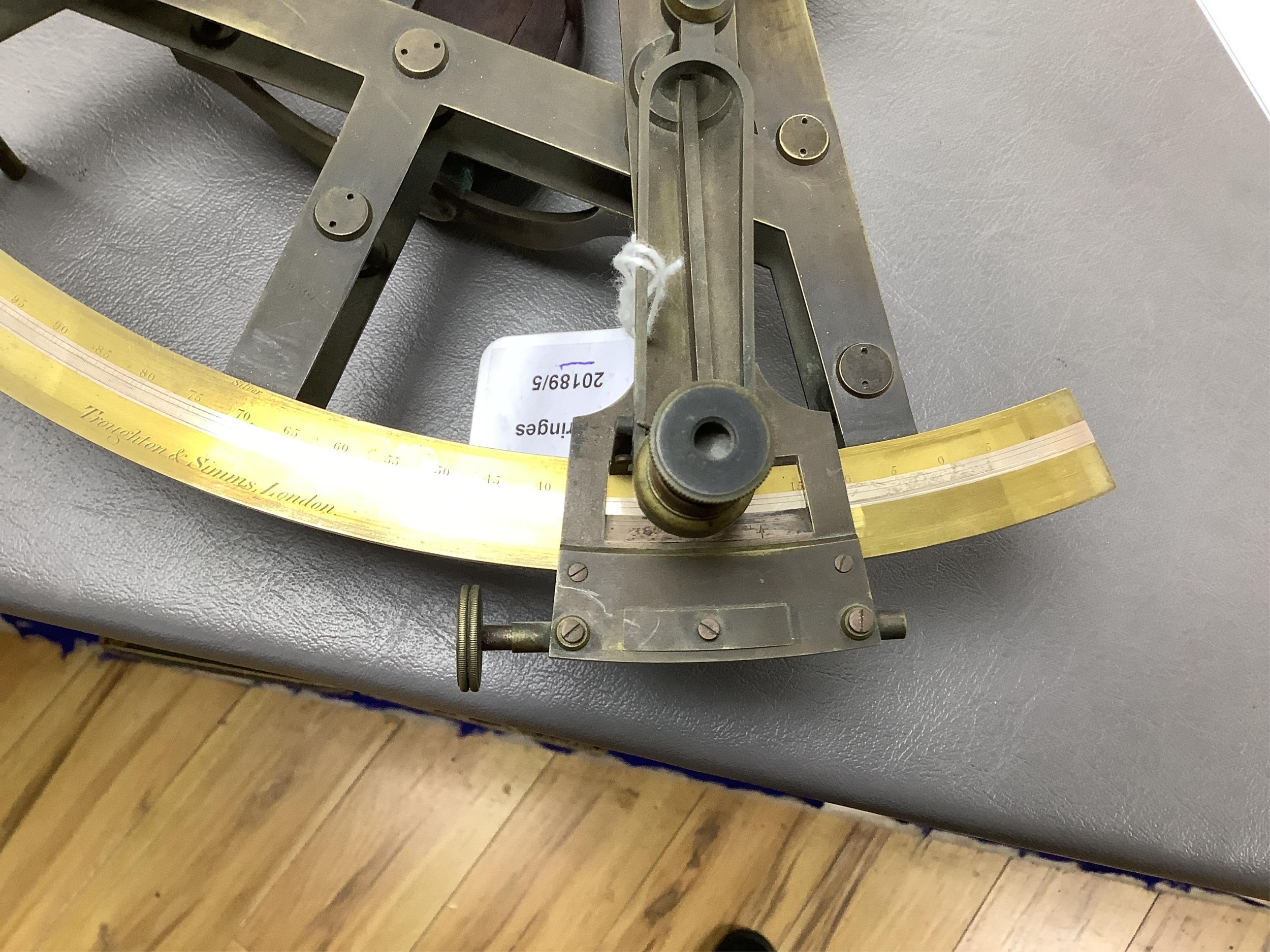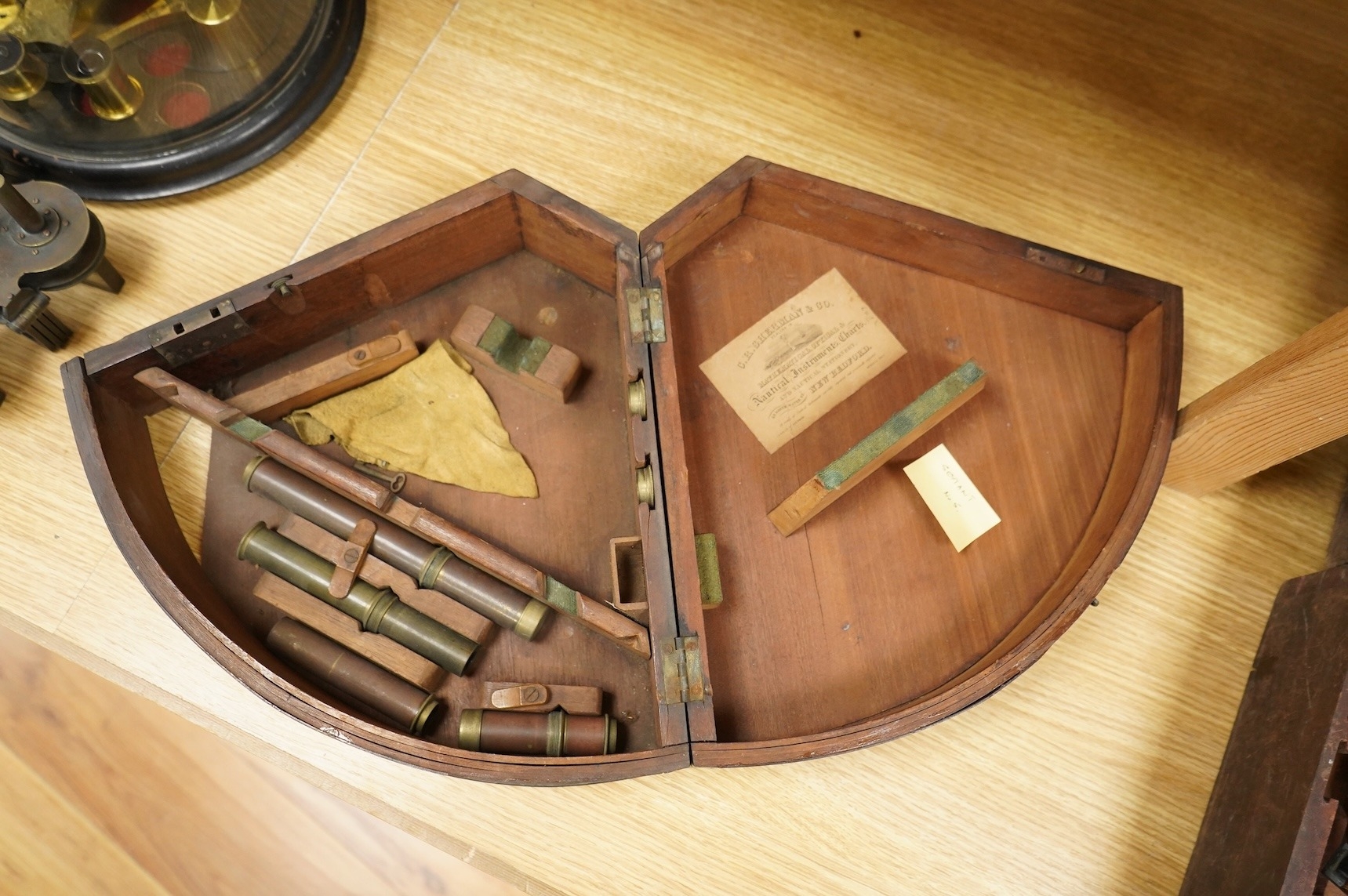 A mid 19th century brass and lacquered double frame sextant, by Troughton & Sims, London, number 2367, the mahogany case containing four interchangeable sighting telescopes, two eyepieces and an adjusting key