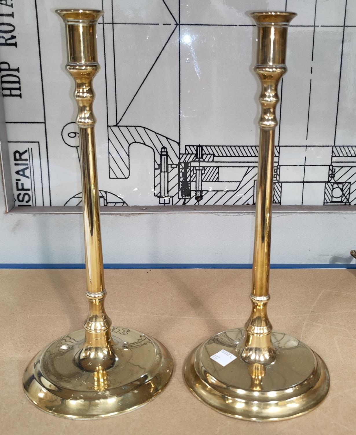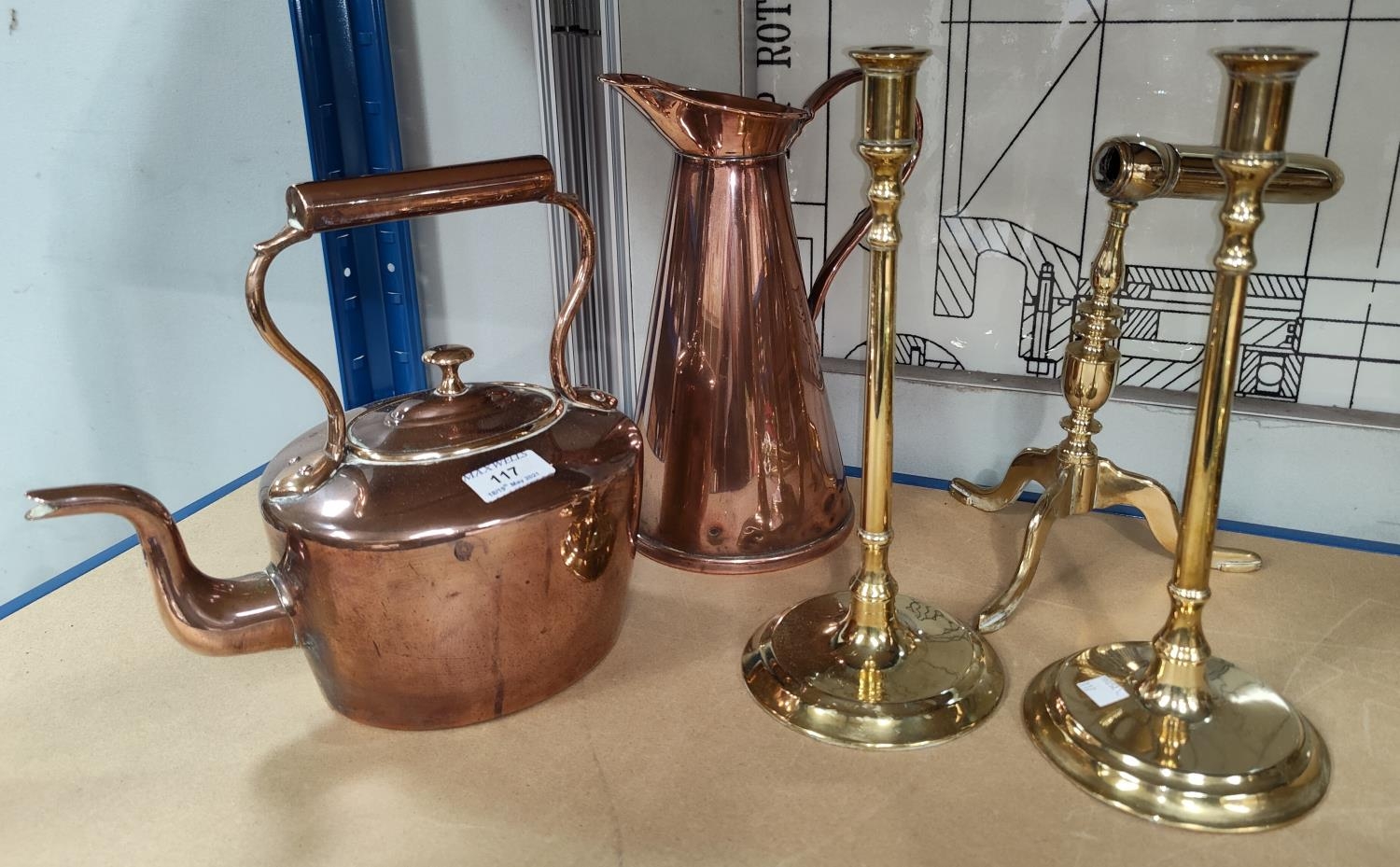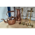 An oval 19th century copper kettle; a pair of slender column candlesticks; a tapering brass jug and a goffering iron stand