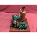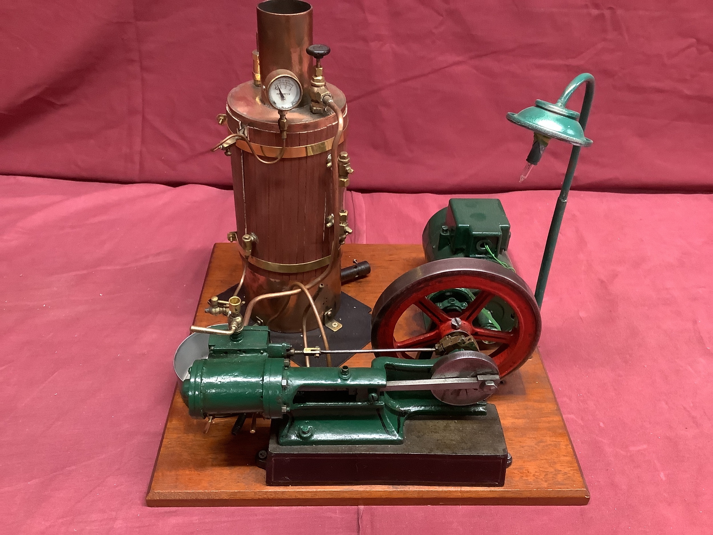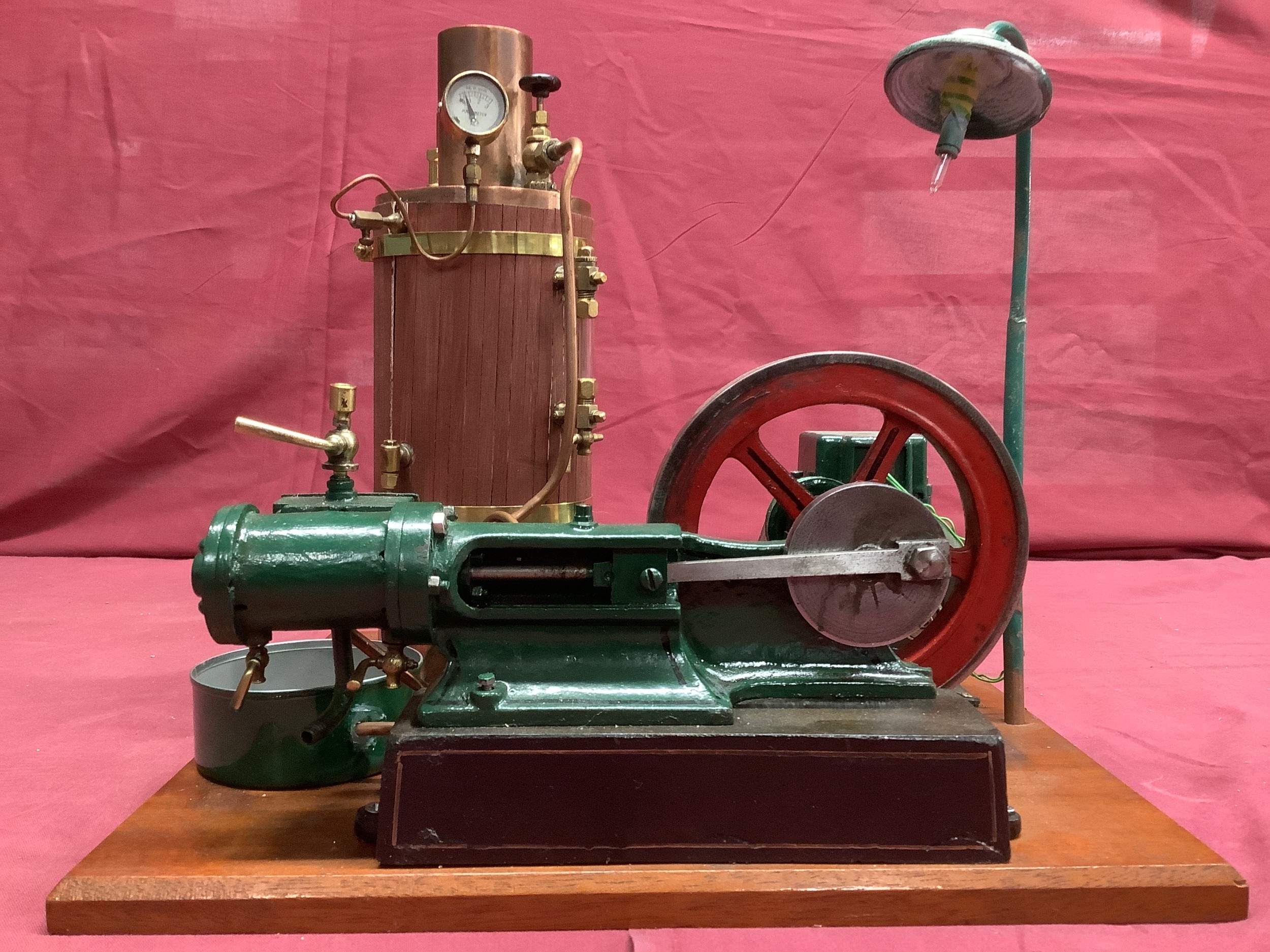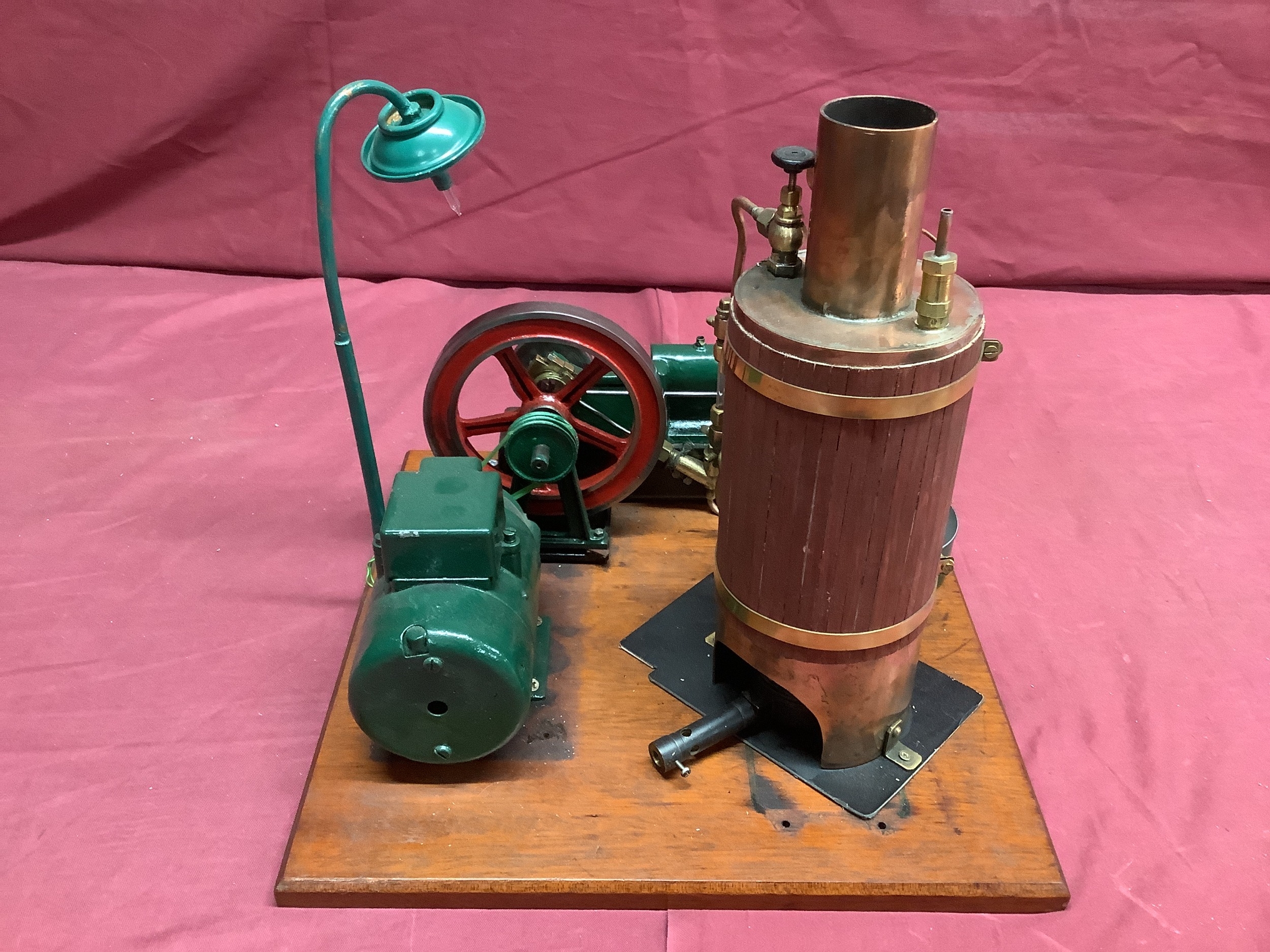 A Vintage Live Steam Horizontal Mill Engine with a Vertical Gas Fired Boiler, the 4 inch diameter by 12 inch high (plus chimney) boiler is wood clad and fitted with a pressure gauge, water sight glass, burner etc; the single cylinder mill engine with 1.5 inch stroke, connected to a five spoke 5.5 inch flywheel, further connected to a generator currently powering a yard light, finished in dark green, bright metal and varnished wood; all fitted to a 14 inch (14") square wood base, overall height 13 inch (13"), very good condition.