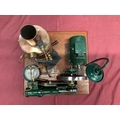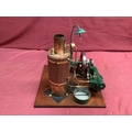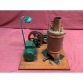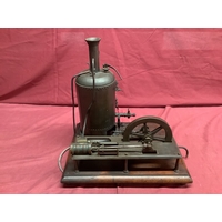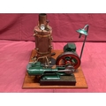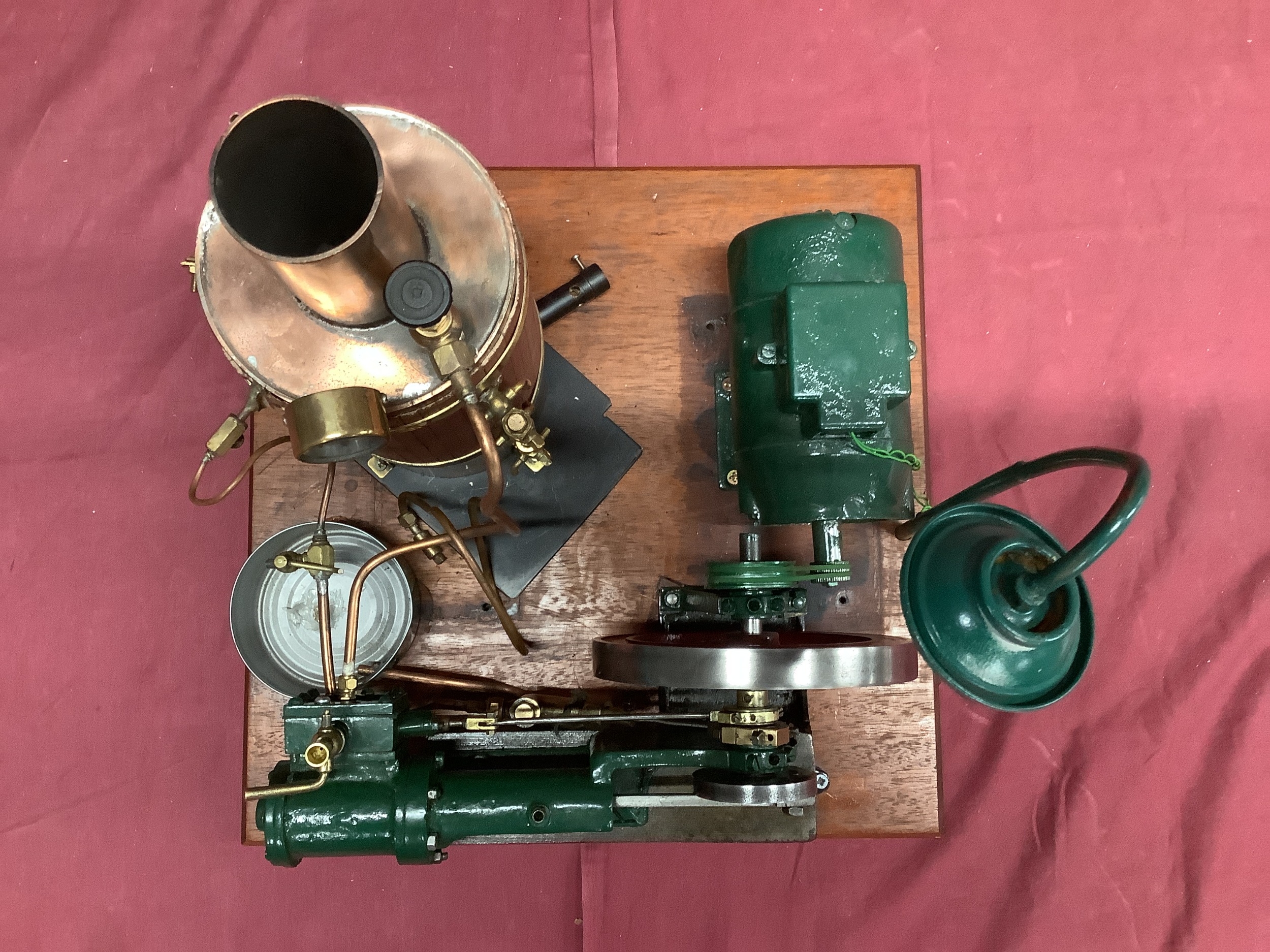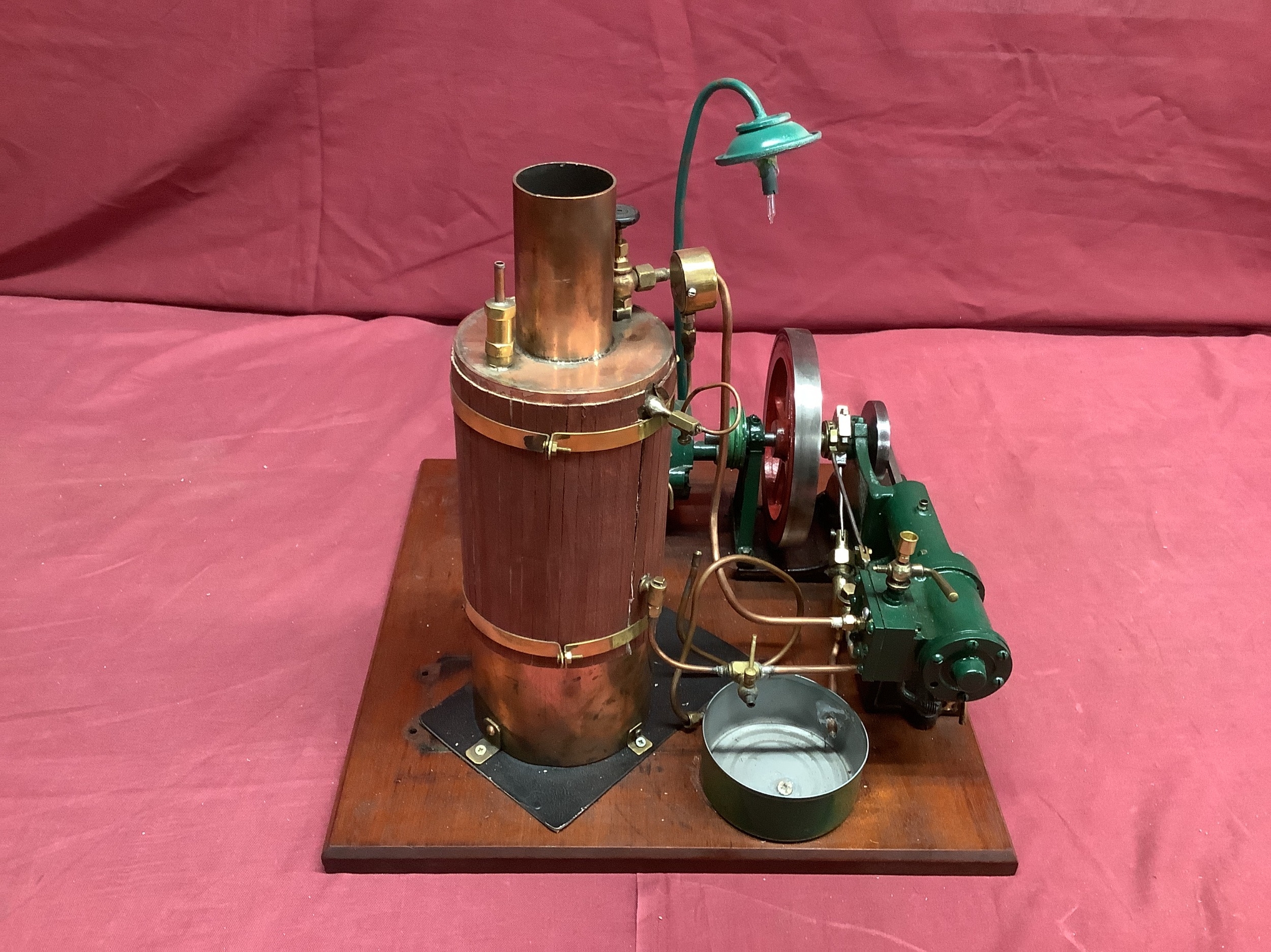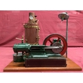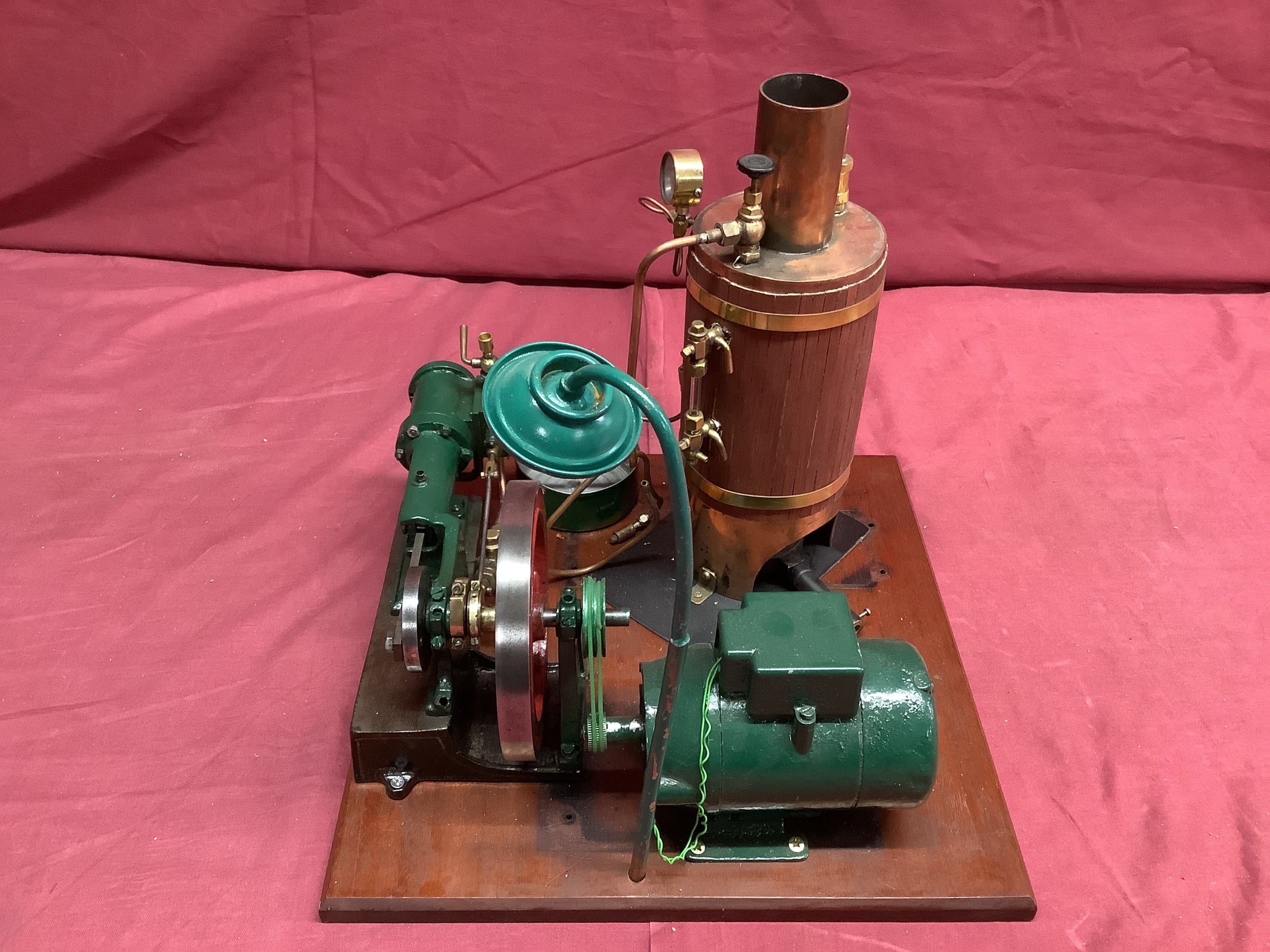 A Vintage Live Steam Horizontal Mill Engine with a Vertical Gas Fired Boiler, the 4 inch diameter by 12 inch high (plus chimney) boiler is wood clad and fitted with a pressure gauge, water sight glass, burner etc; the single cylinder mill engine with 1.5 inch stroke, connected to a five spoke 5.5 inch flywheel, further connected to a generator currently powering a yard light, finished in dark green, bright metal and varnished wood; all fitted to a 14 inch (14") square wood base, overall height 13 inch (13"), very good condition.