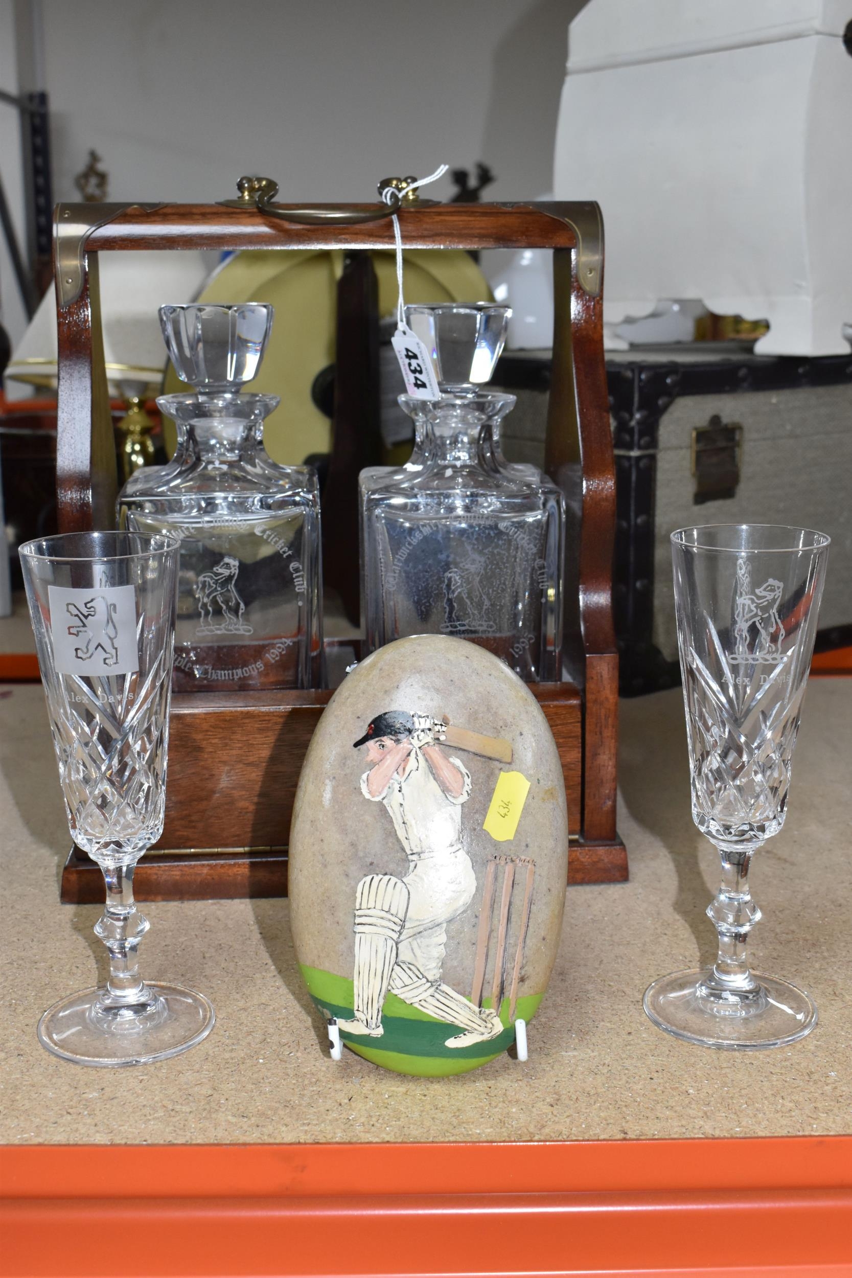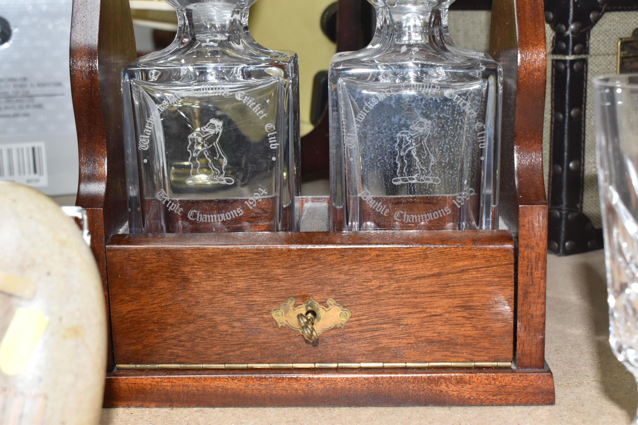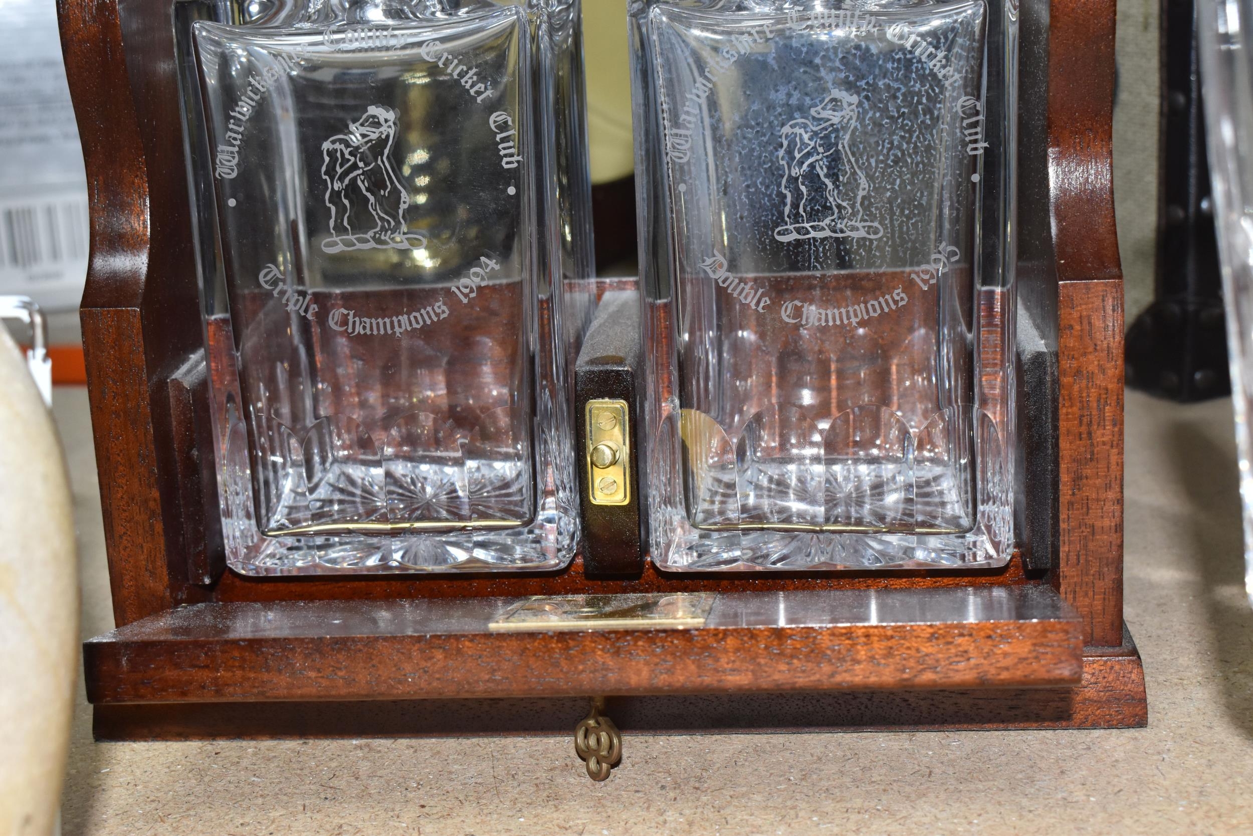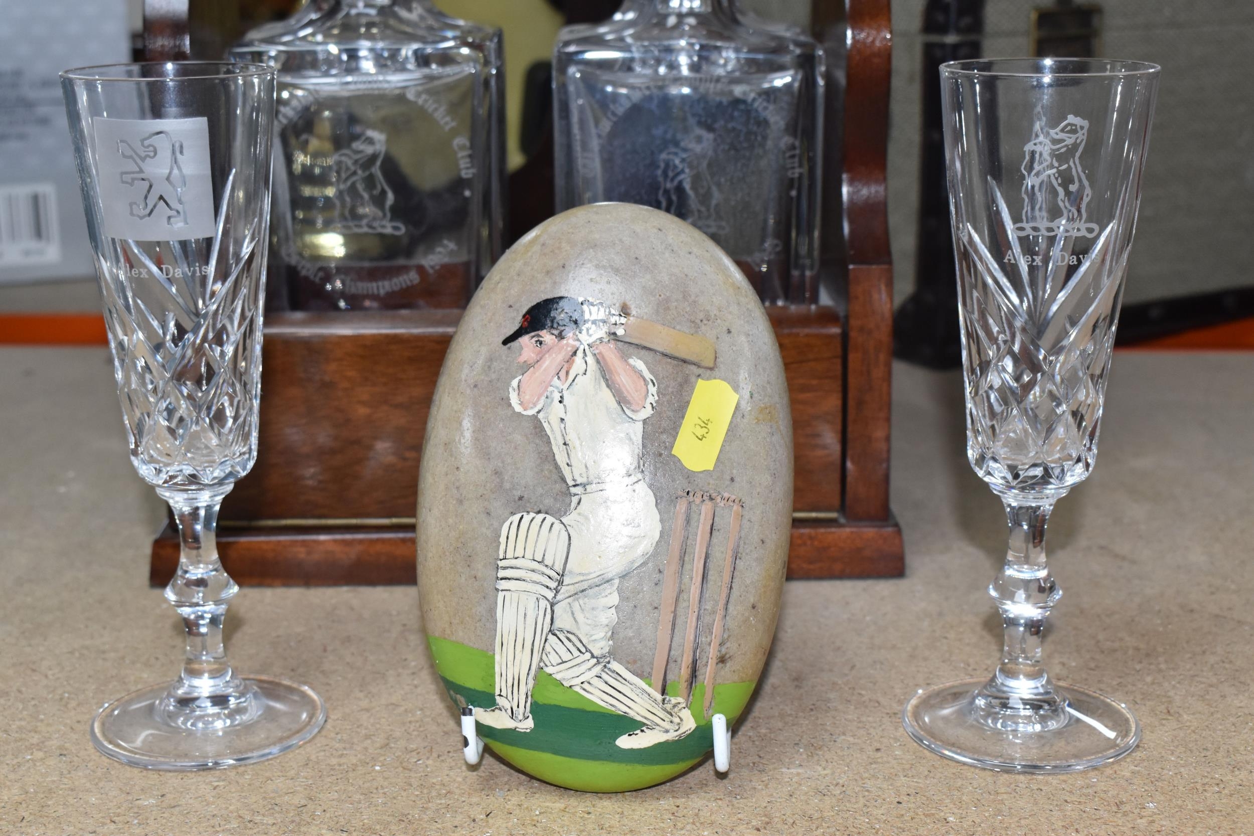 A SMALL COLLECTION OF CRYSTAL ITEMS SPORTS RELATED, a dark wood with brass detail tantalus caddy with drop front panel that locks with the key, two Atlantis Crystal cut glass decanters with stoppers engraved A.D on the stoppers, the decanters engraved with Warwickshire County Cricket Club, Triple Champions 1994 and the other Double Champions 1995, (water marked inside one decanter), two Royal Brierley champagne crystal flutes engraved Alex Davis and a symbol etched above, a painted stone of a cricketer and writing on the back, (Condition Report: overall in ok condition, would benefit from a clean), (4)