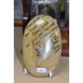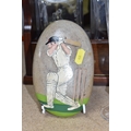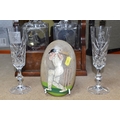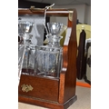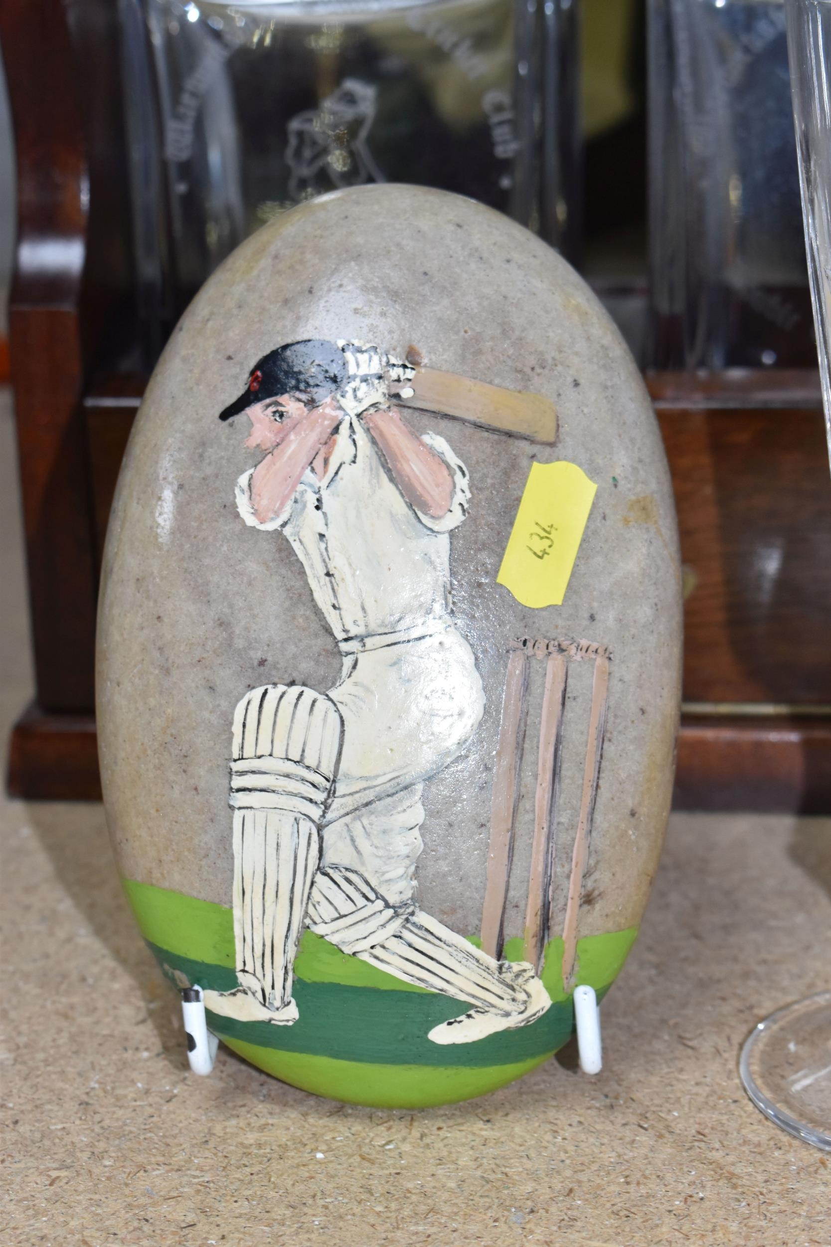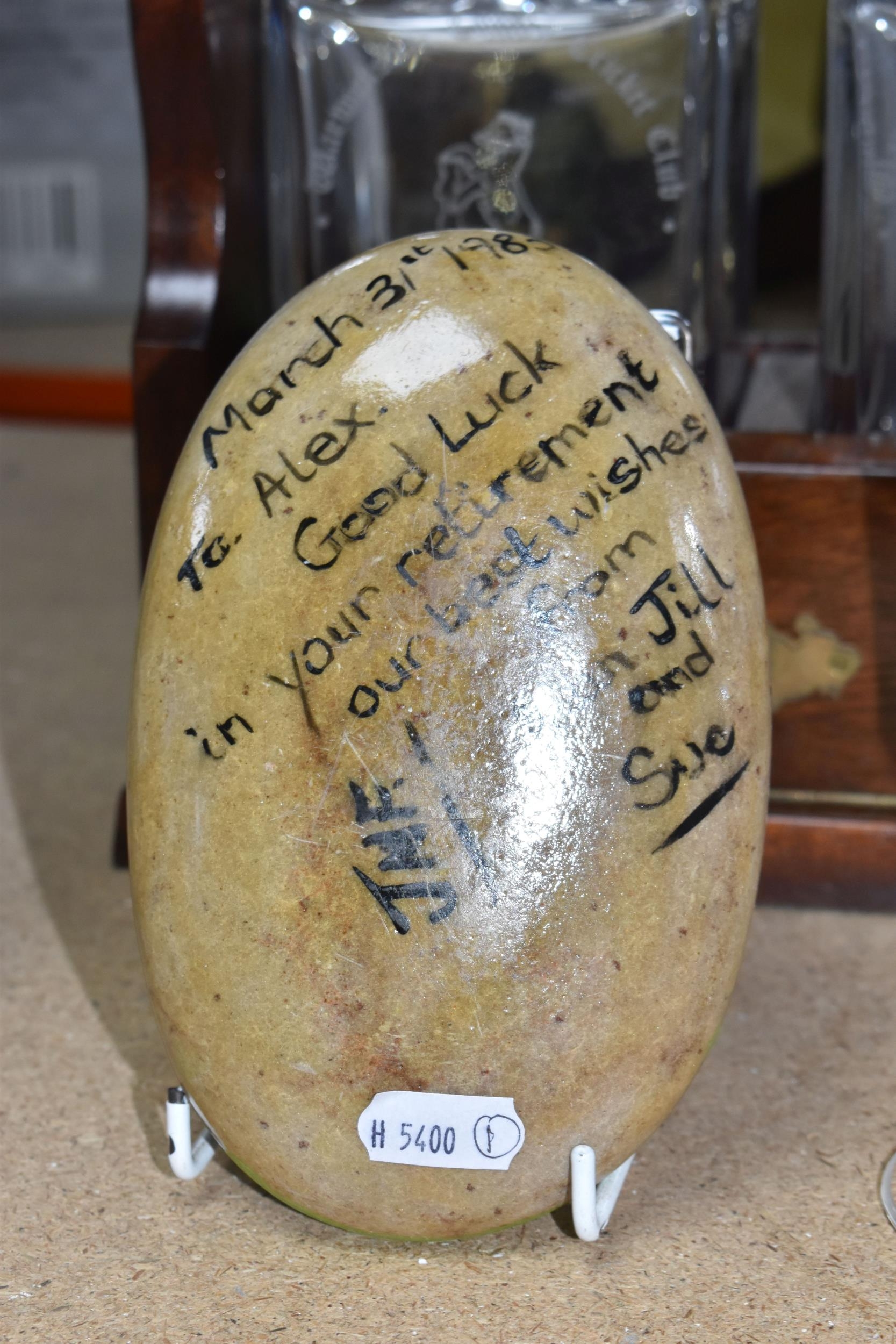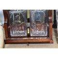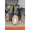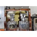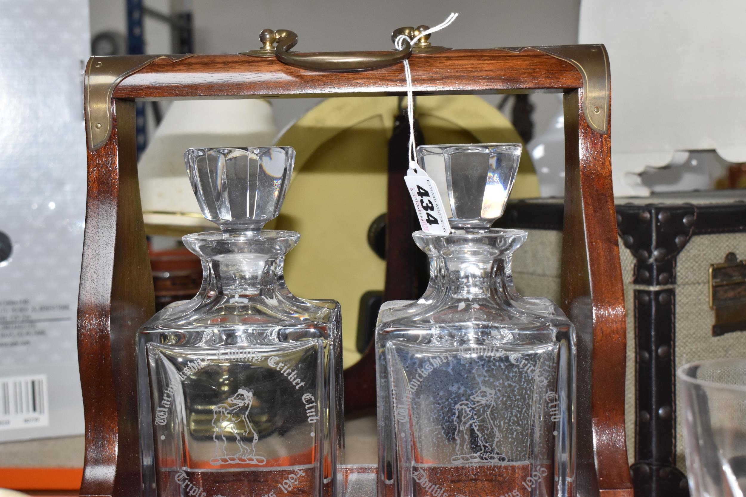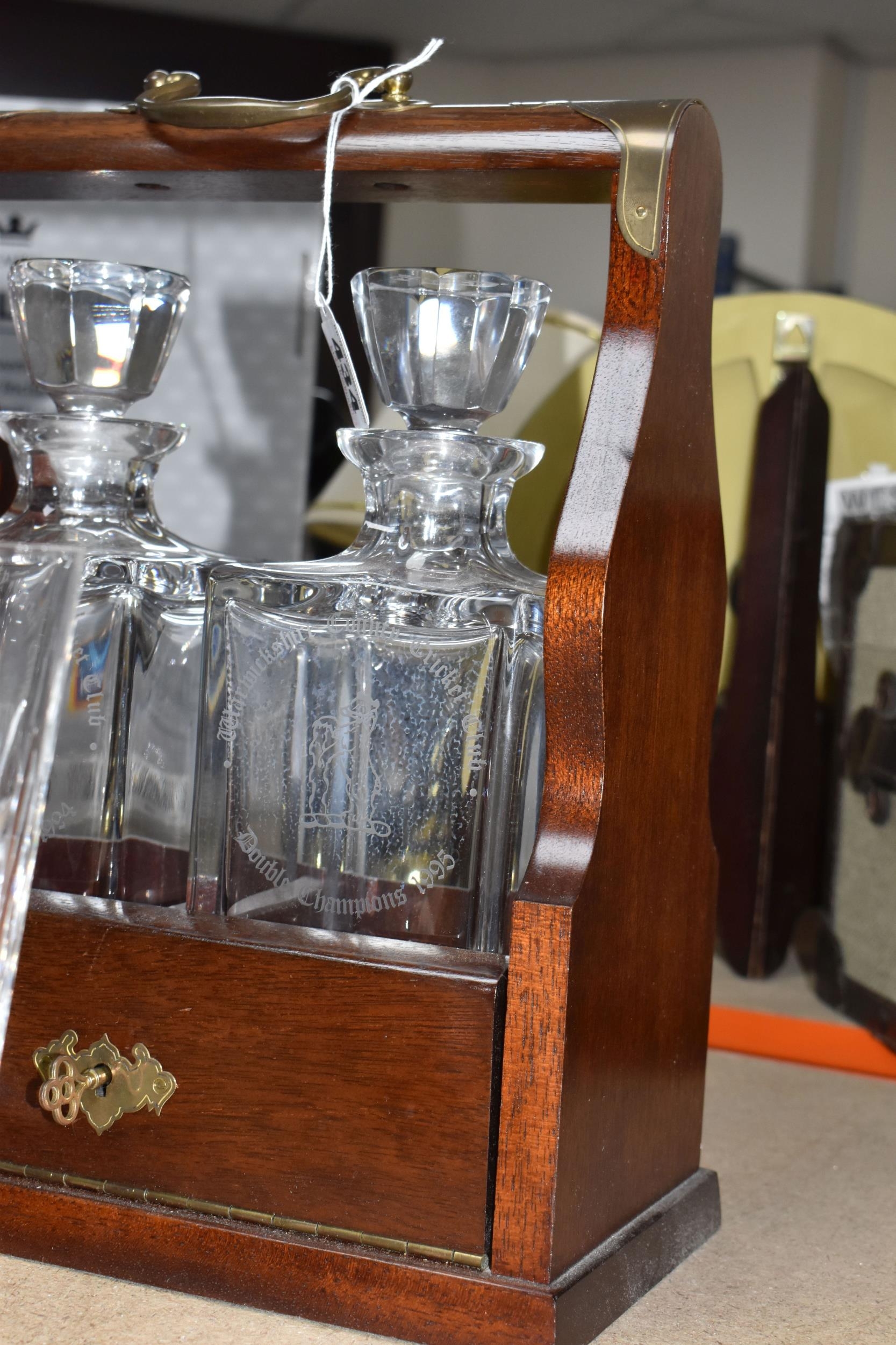 A SMALL COLLECTION OF CRYSTAL ITEMS SPORTS RELATED, a dark wood with brass detail tantalus caddy with drop front panel that locks with the key, two Atlantis Crystal cut glass decanters with stoppers engraved A.D on the stoppers, the decanters engraved with Warwickshire County Cricket Club, Triple Champions 1994 and the other Double Champions 1995, (water marked inside one decanter), two Royal Brierley champagne crystal flutes engraved Alex Davis and a symbol etched above, a painted stone of a cricketer and writing on the back, (Condition Report: overall in ok condition, would benefit from a clean), (4)