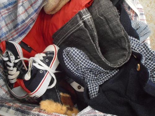 A BAG AND BOX OF CHILDRENS CLOTHES