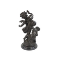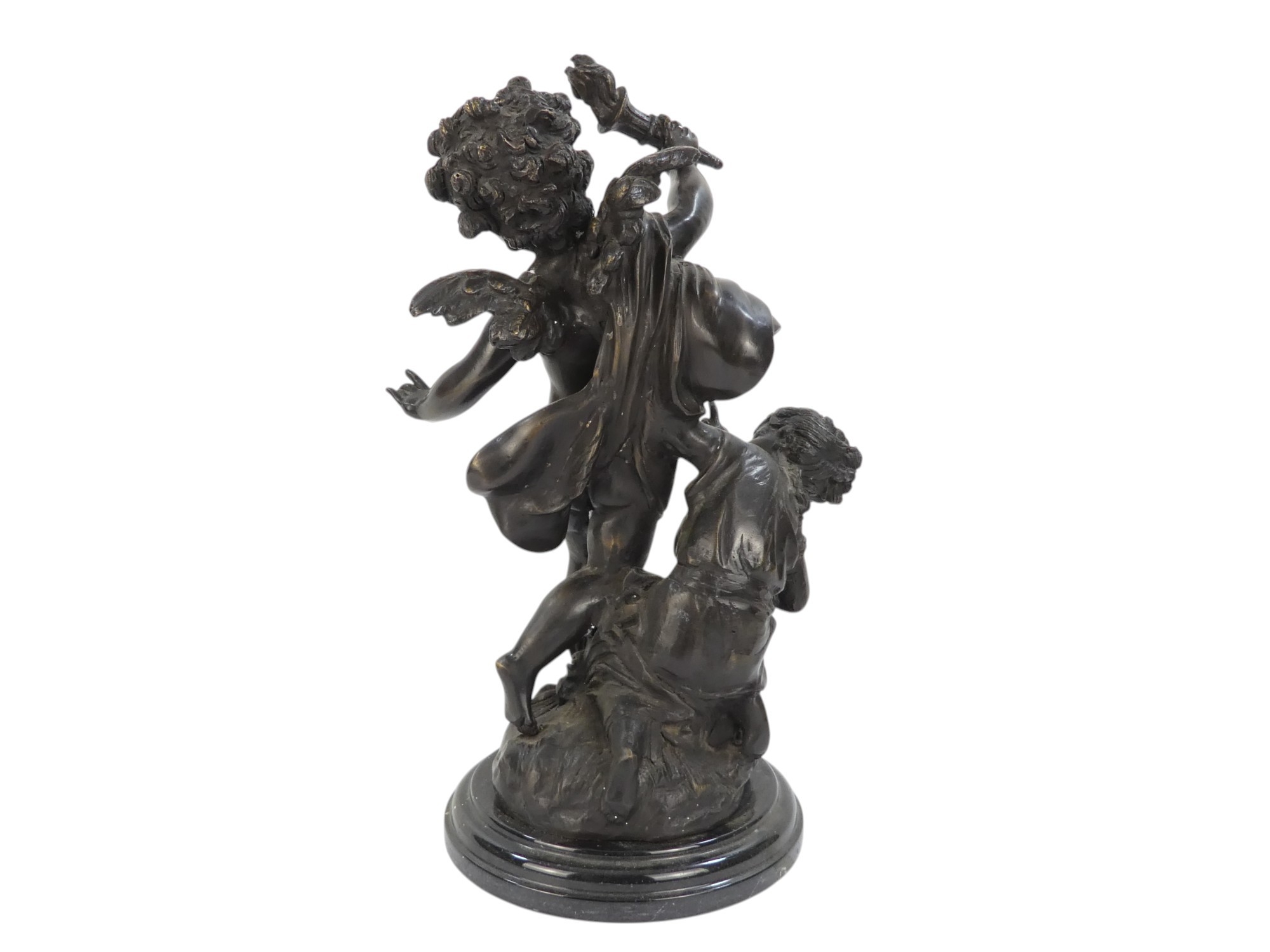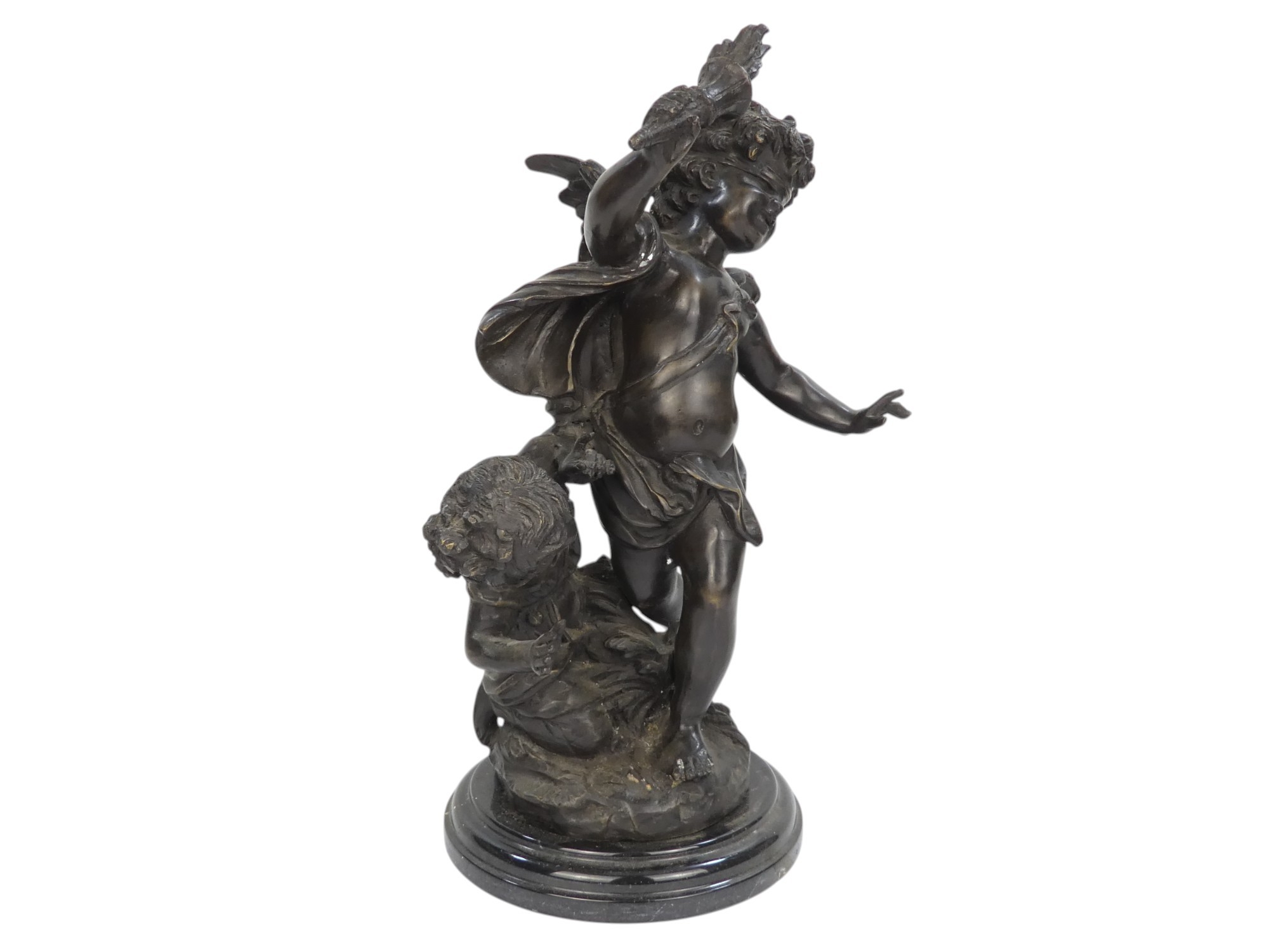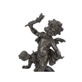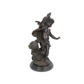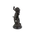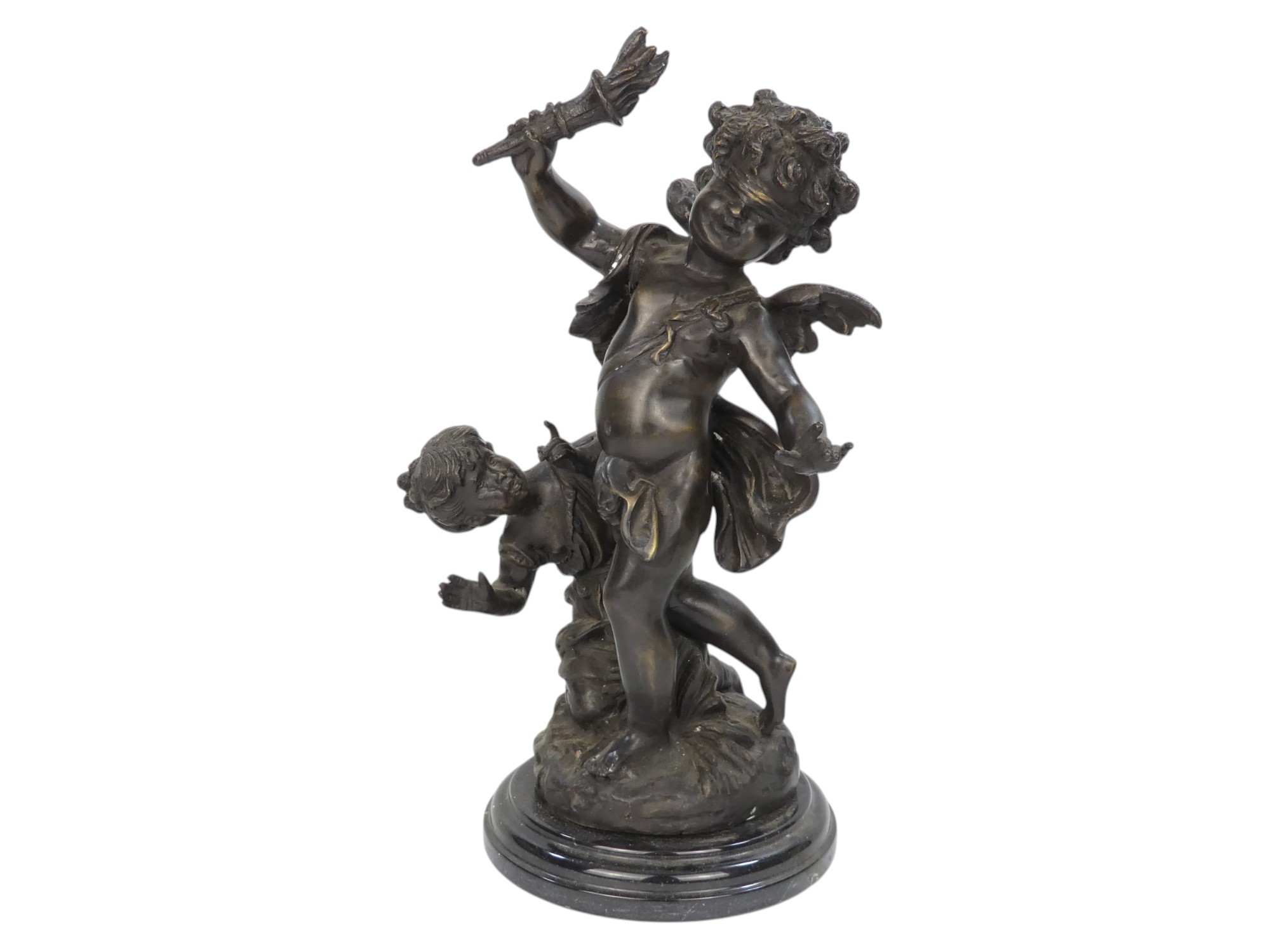 A bronze figure of a cherub - blindfolded and holding a torch, 43cm high.