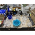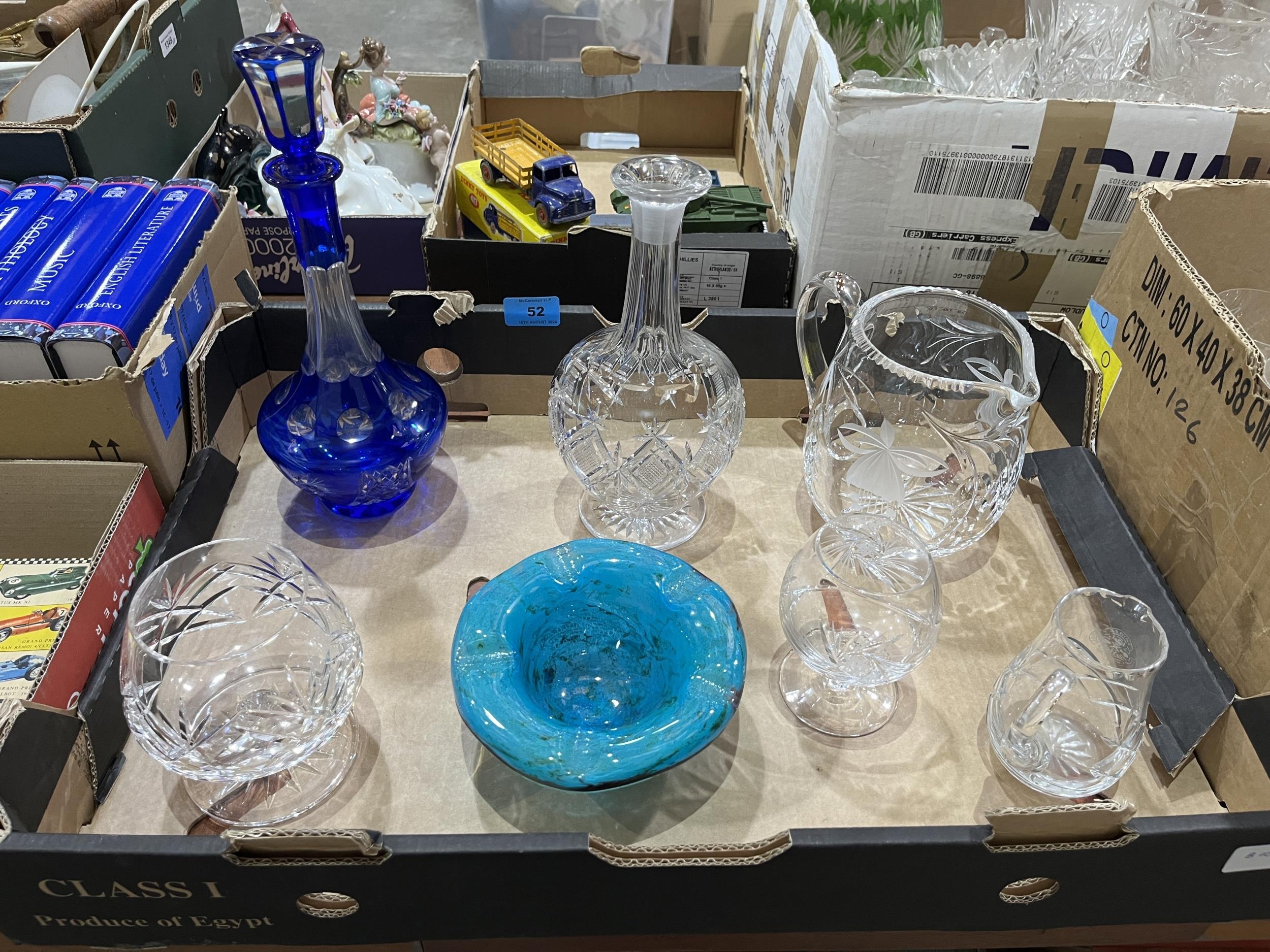 A blue overlaid glass decanter; a studio glass ashtray and cut glassware.