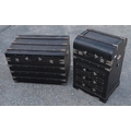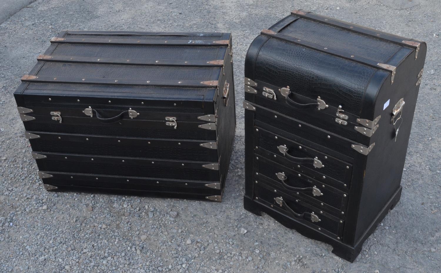 Wood banded black crocodile skin effect cabin trunk. W72cm L48cm H47cm. Similar skin effect topped chest of three drawers W44cm D38cm H70cm. (2)