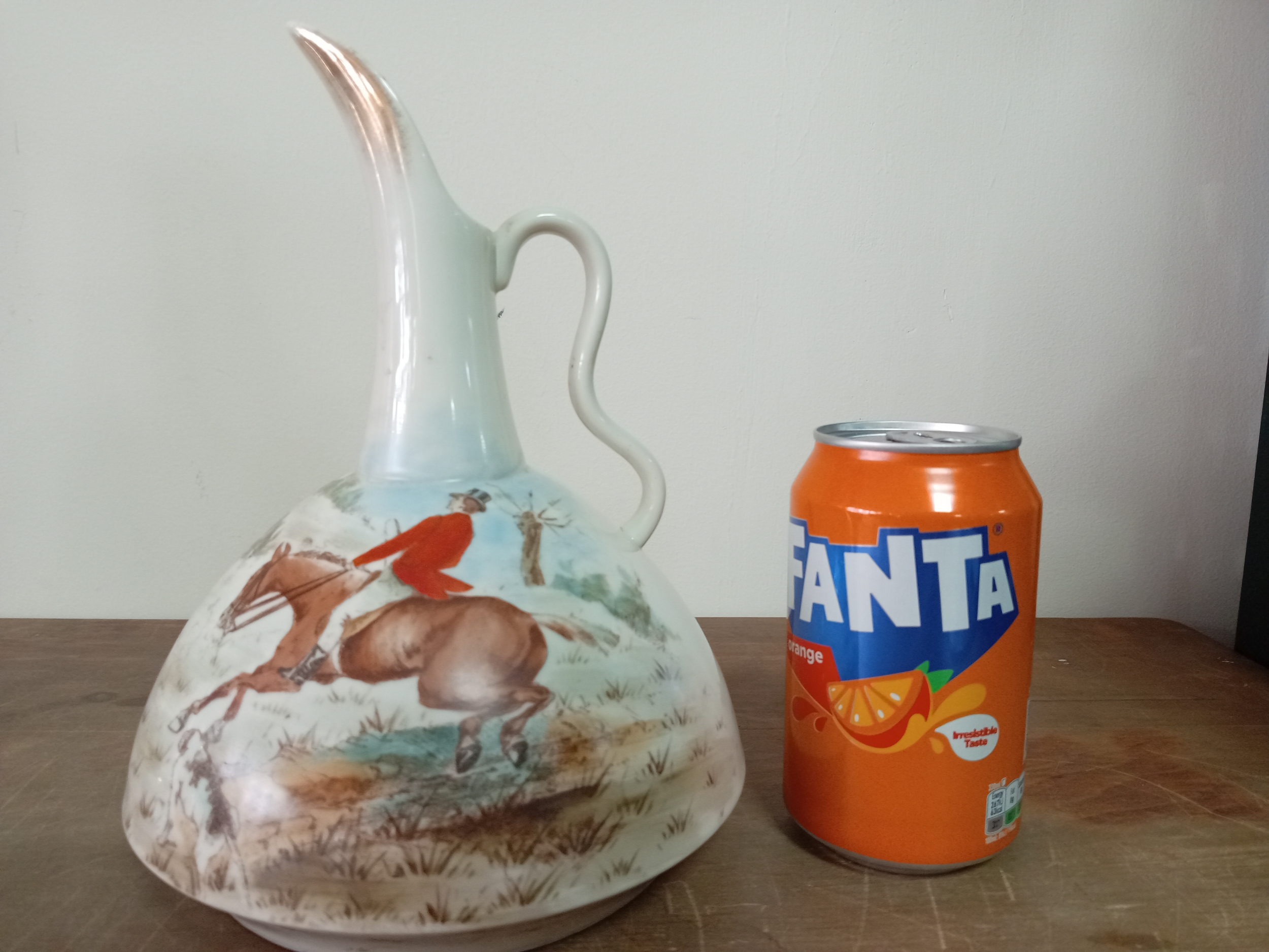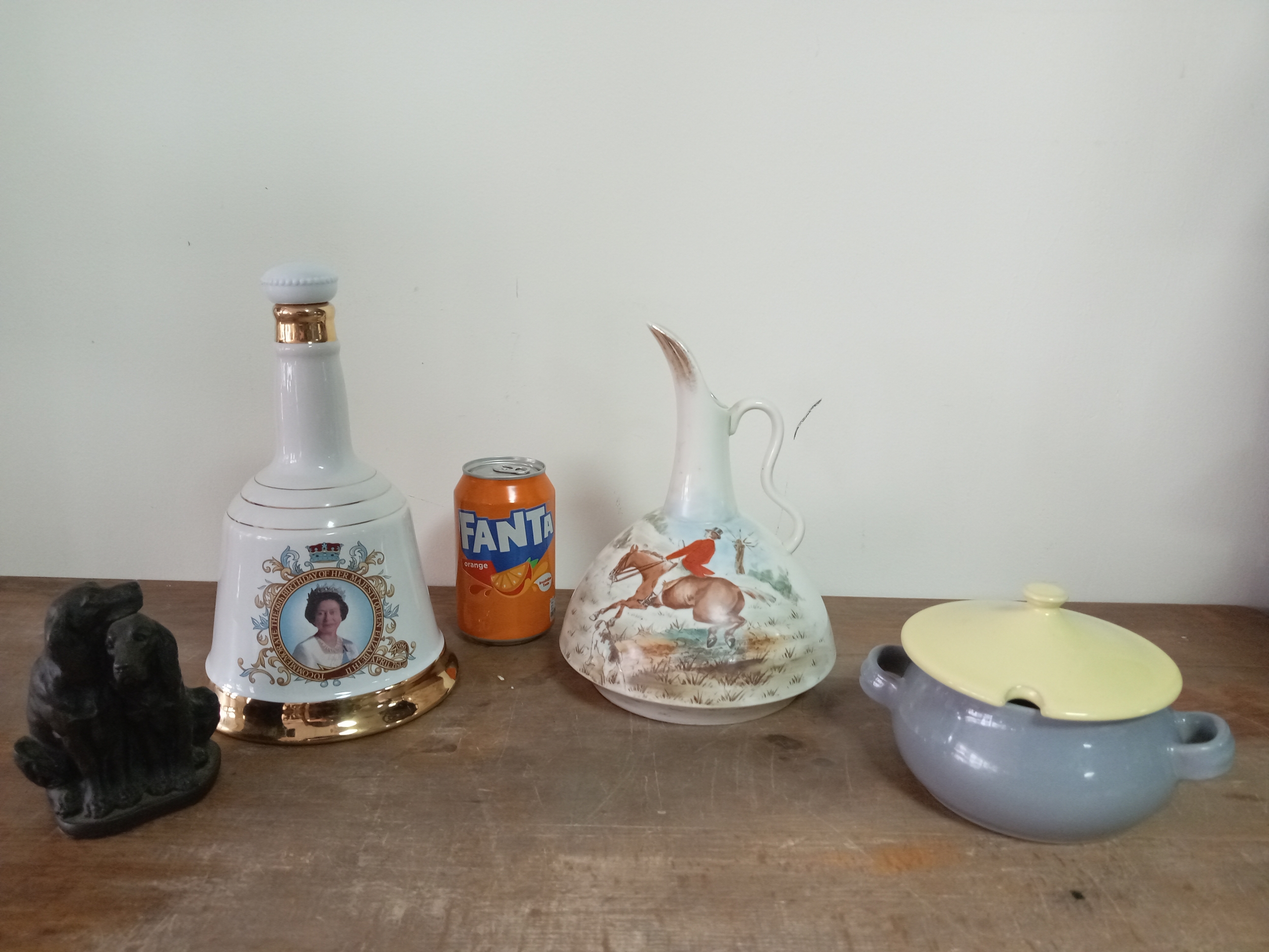 A collection of ceramics to include a Denby stoneware pot, a hunting scene claret jug, a queen Elizabeth II 60th commemorative jug and a cold cast bronze pair of spaniels.