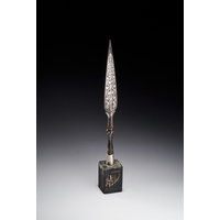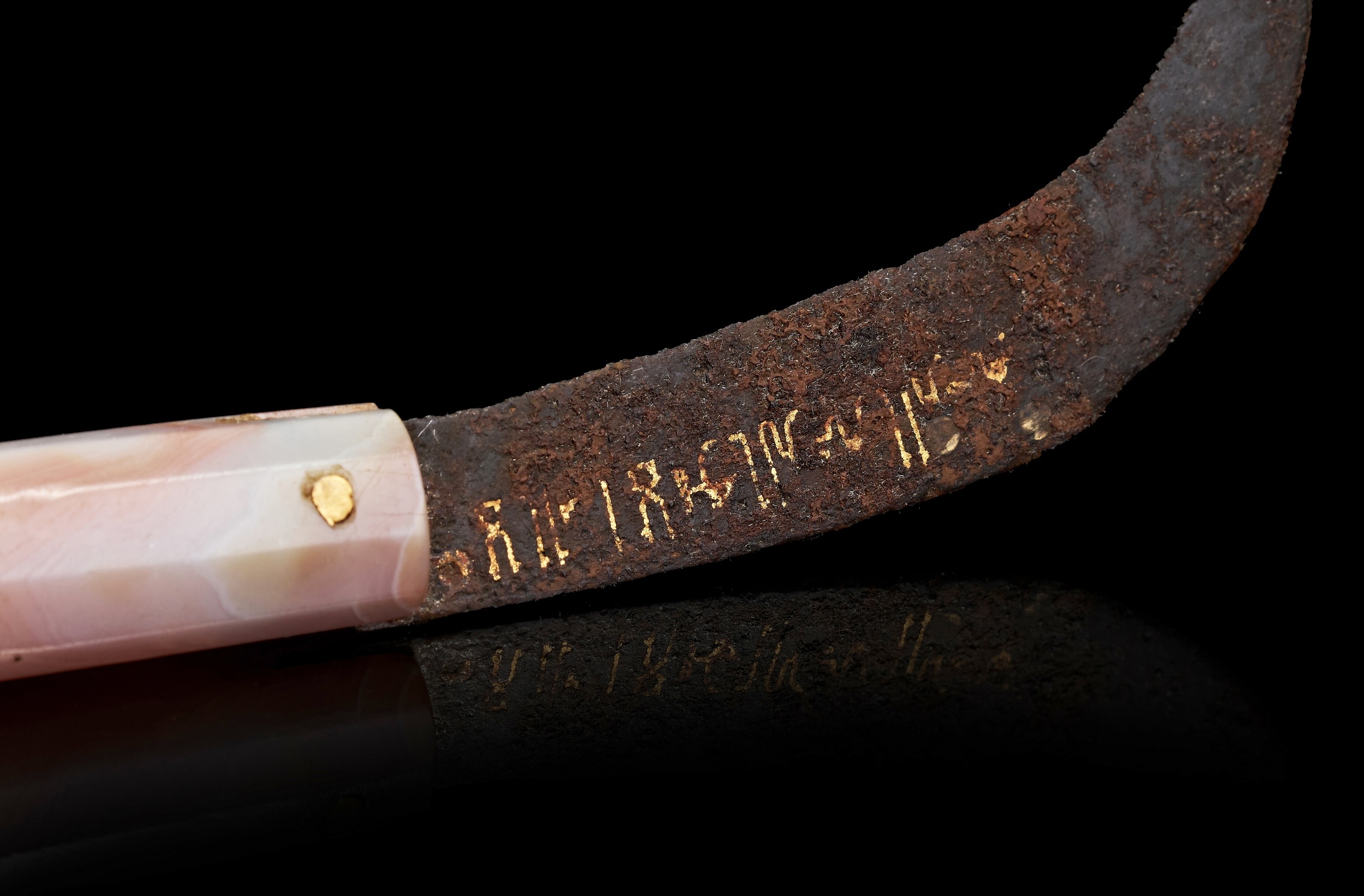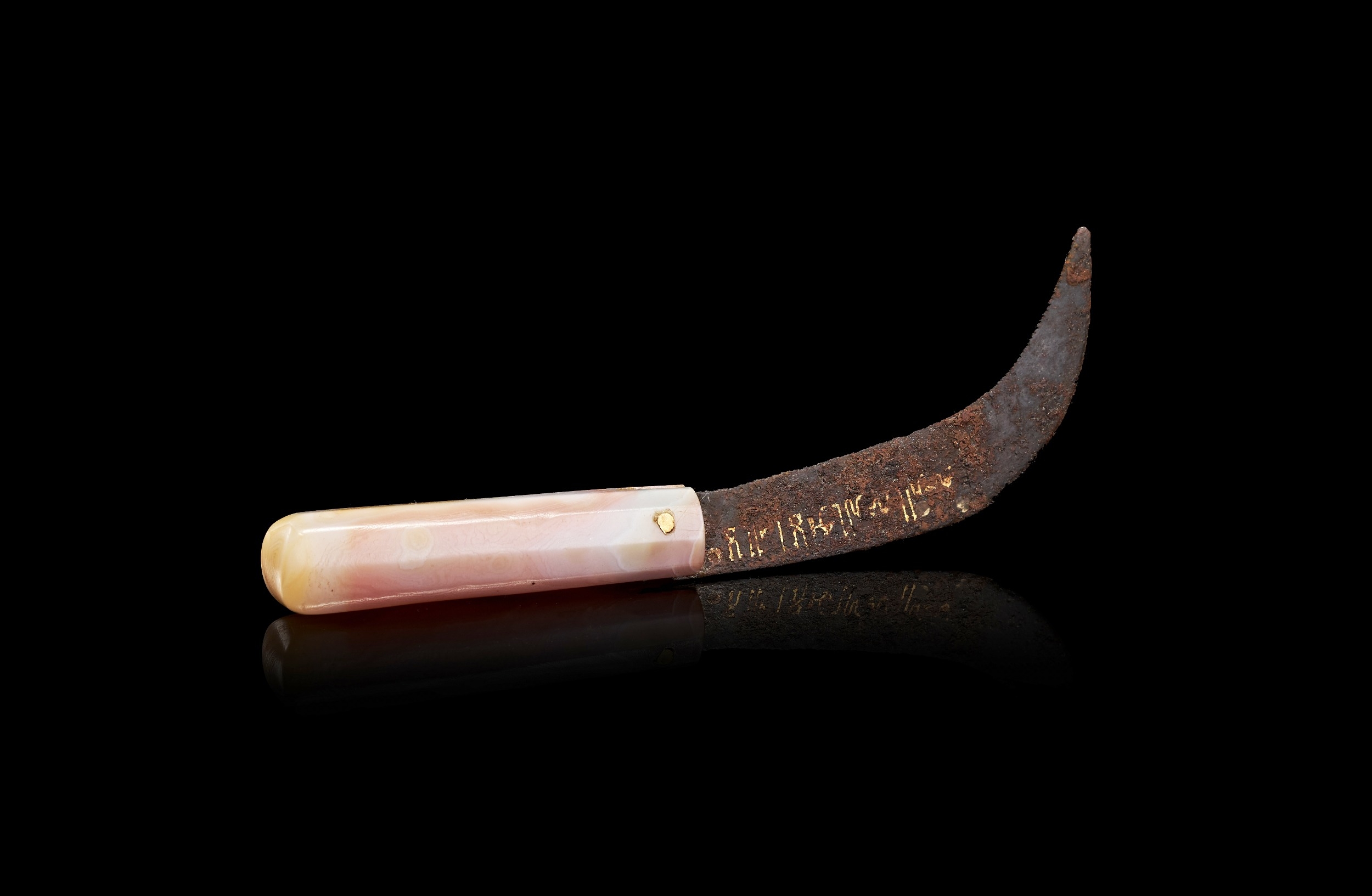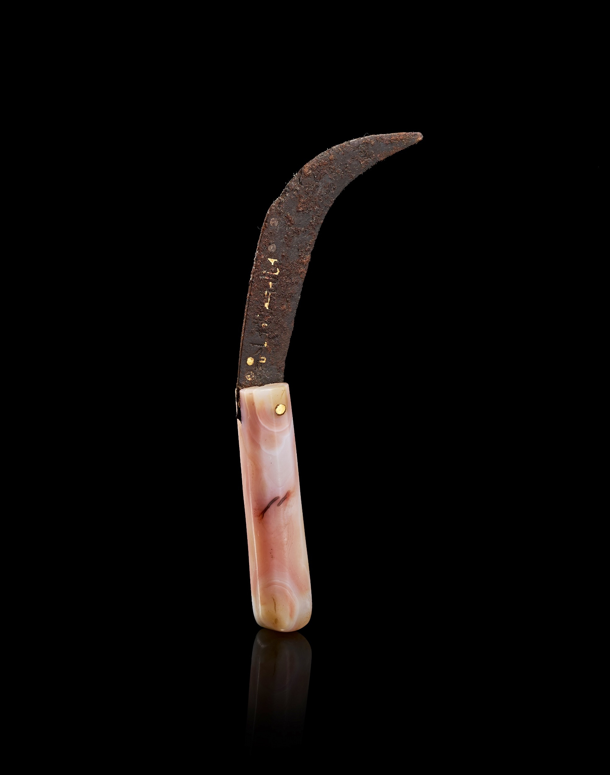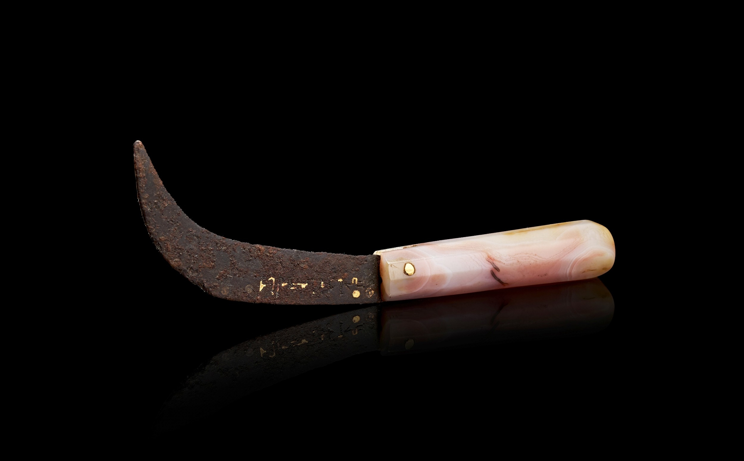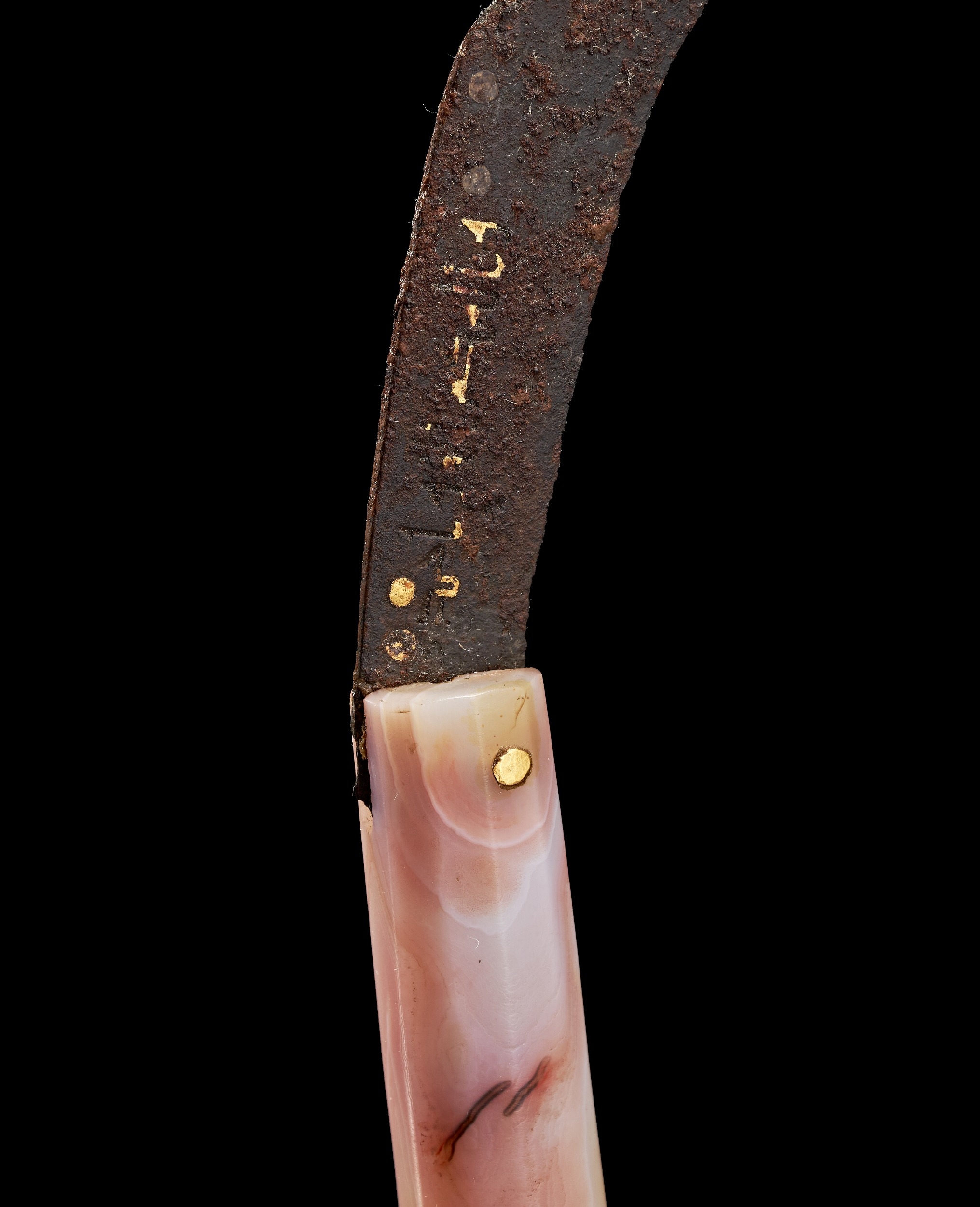 A HAWKBILL PRUNING KNIFE WITH GOLD INLAY AND BANDED AGATE HANDLE, GHAZNAVID OR SELJUK, EASTERN PERSIA, 11TH - 12TH CENTURY