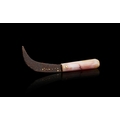 This antique fixed-blade pruning knife features a hawkbill-style steel blade. The blade is decorated with gold-colored metal inlay identified as arabic script. The inscription is present on both sides of the blade, accompanied by circular decorative motifs. The handle is constructed from a single piece of faceted, translucent banded agate (added later), exhibiting natural internal banding in shades of pink, white, and cream. The blade is secured to the handle with a single gold-toned pin.