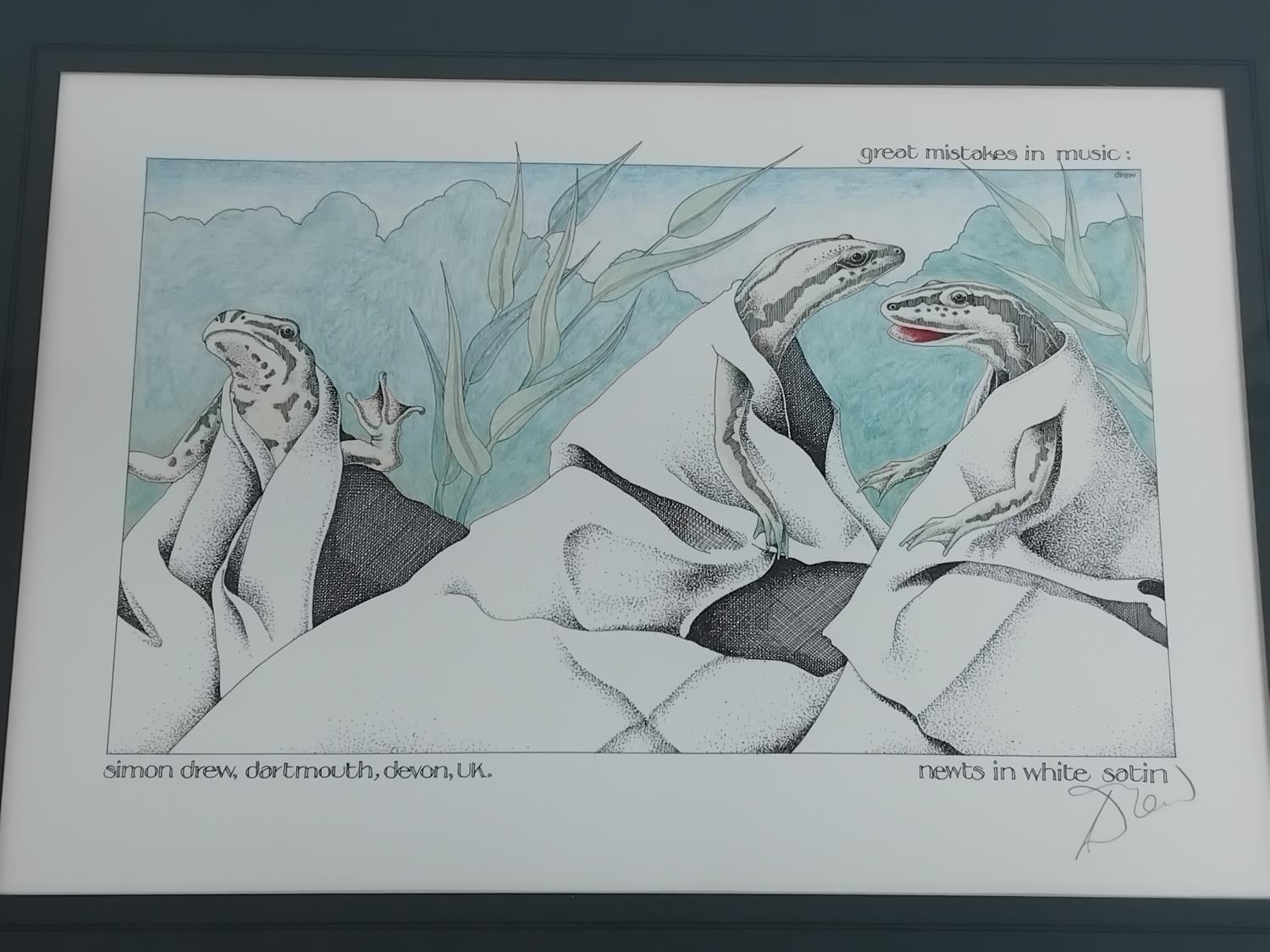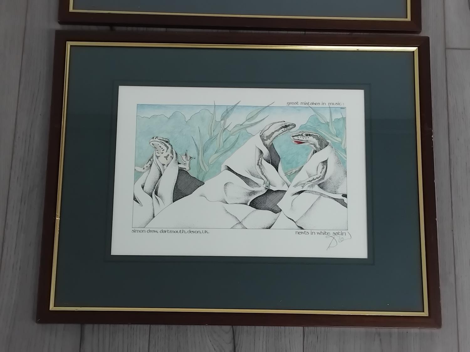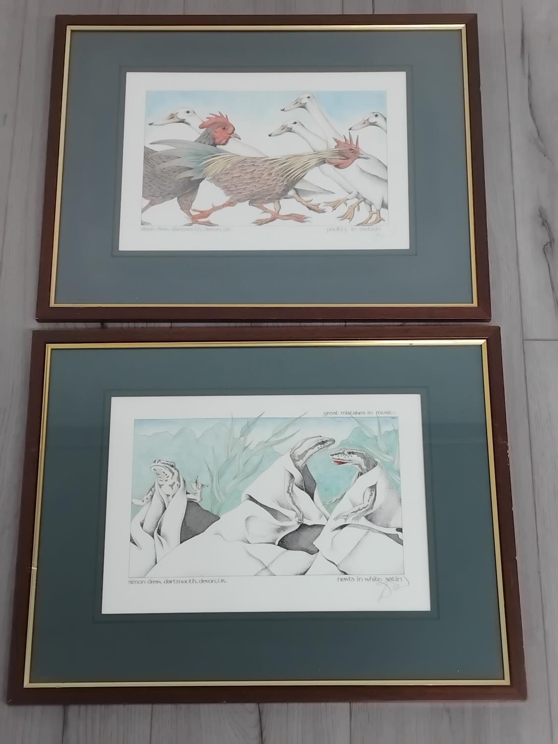Framed and Mounted Simon Drew 'Great Mistakes in Music' Prints (2), 'Poultry in Motion' and 'Newts in White Satin'. Both Pencil Signed Bottom Right. 50cm x 38cm.