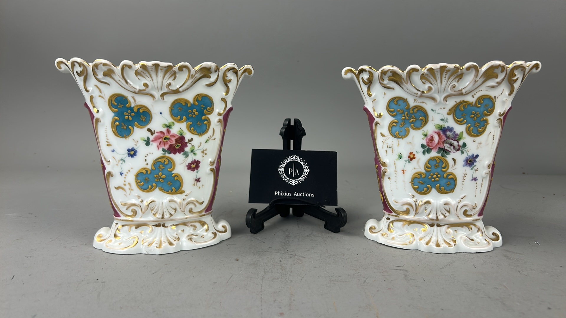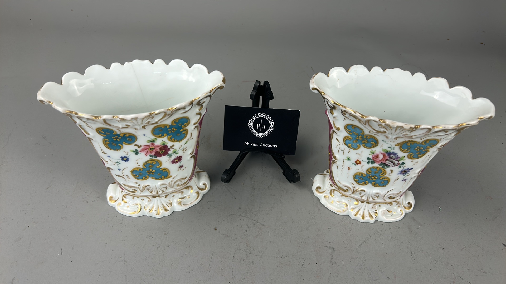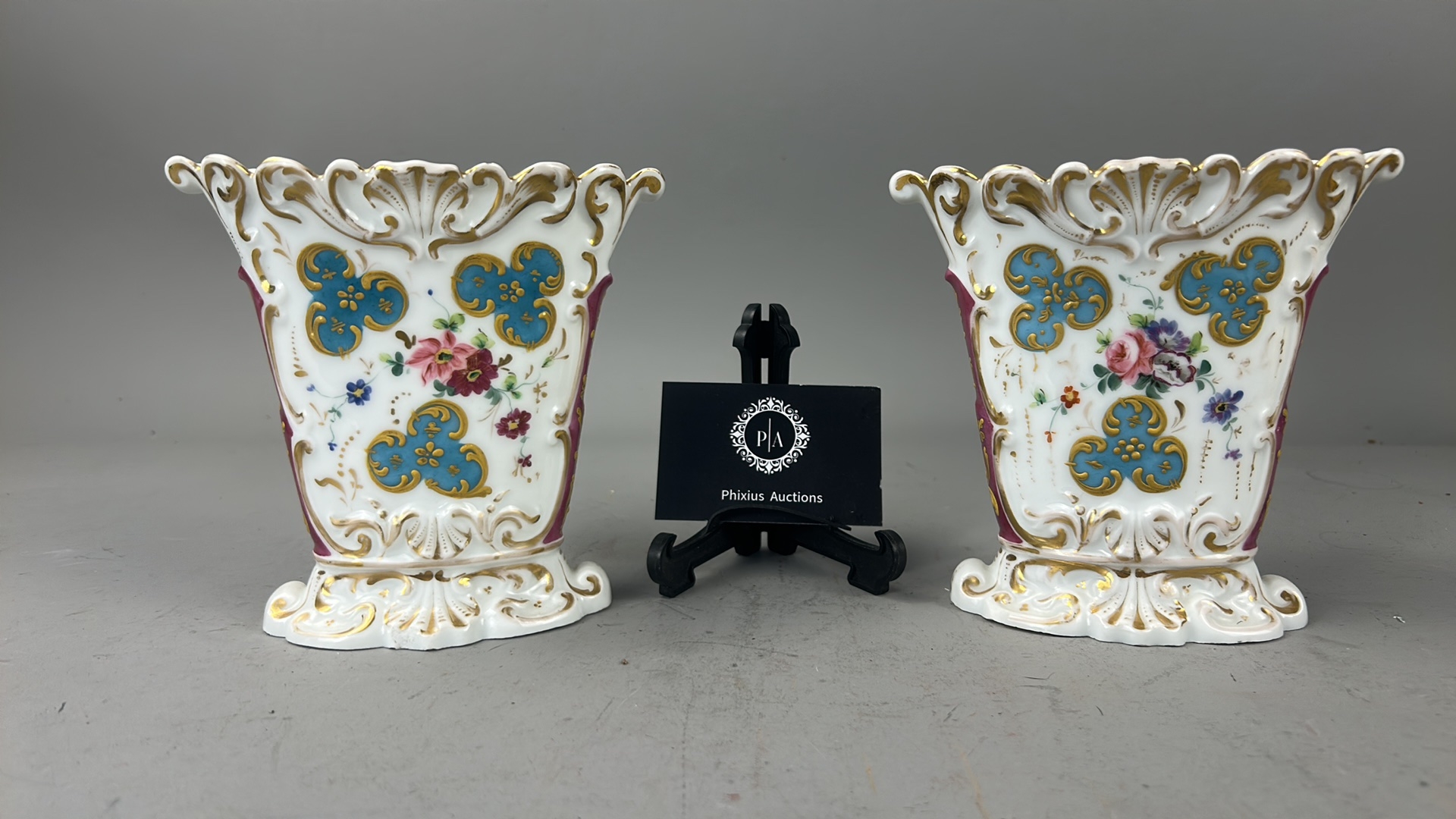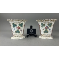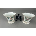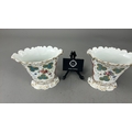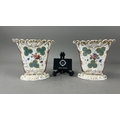 Pair of porcelain cache pots with flared scalloped rims, moulded scroll bases, turquoise quatrefoil cartouches and hand-painted floral sprays enriched with gilt, Rococo Revival style.