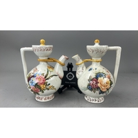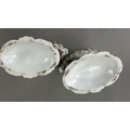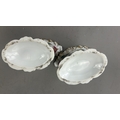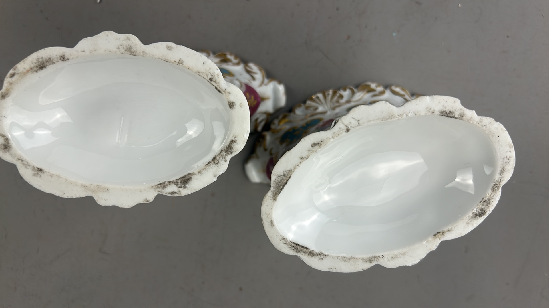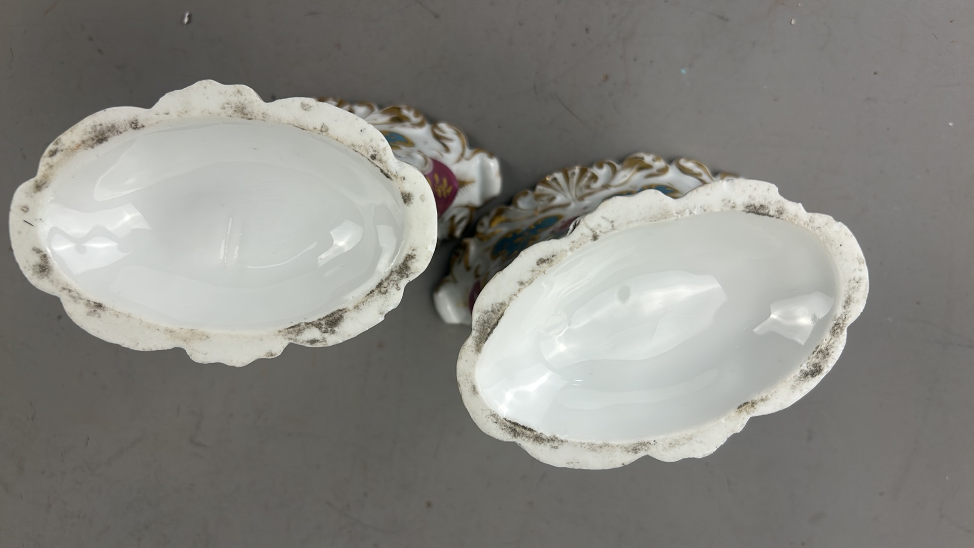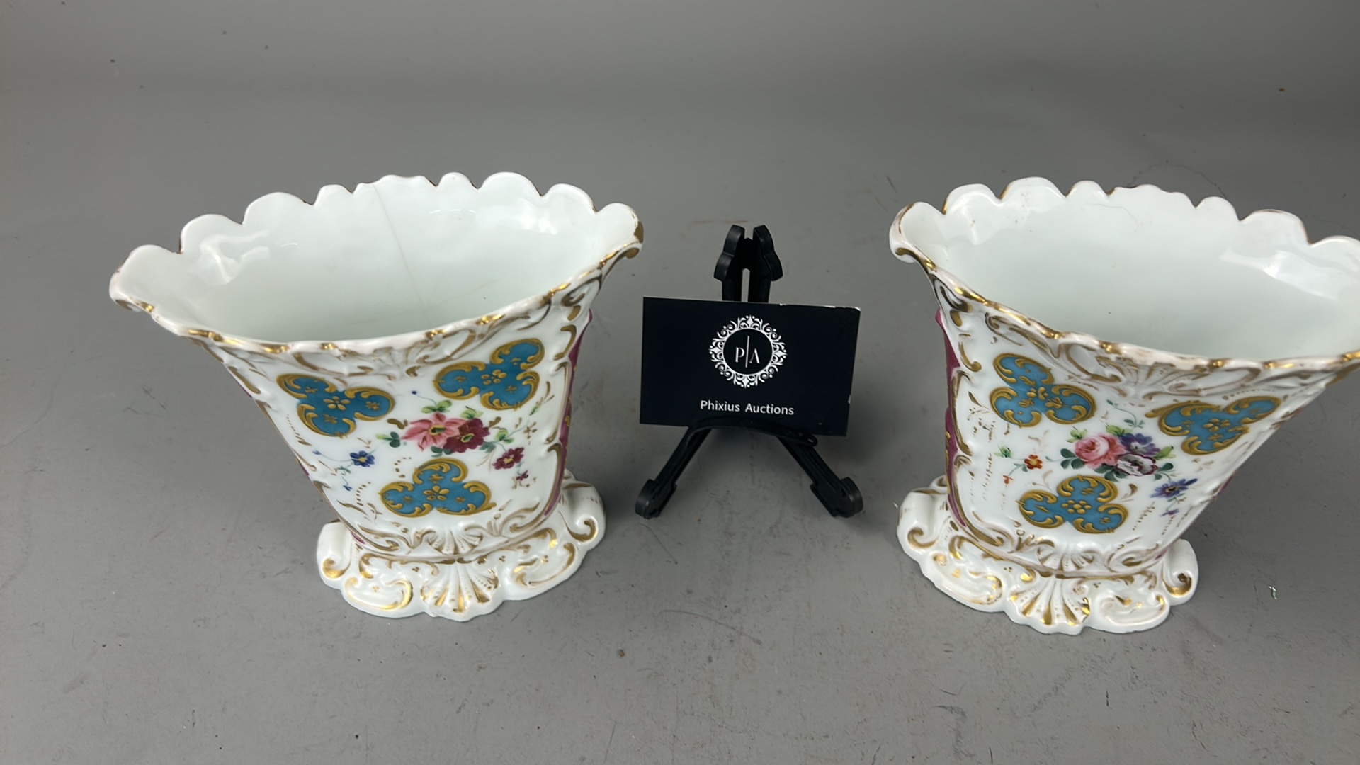 Pair of porcelain cache pots with flared scalloped rims, moulded scroll bases, turquoise quatrefoil cartouches and hand-painted floral sprays enriched with gilt, Rococo Revival style.