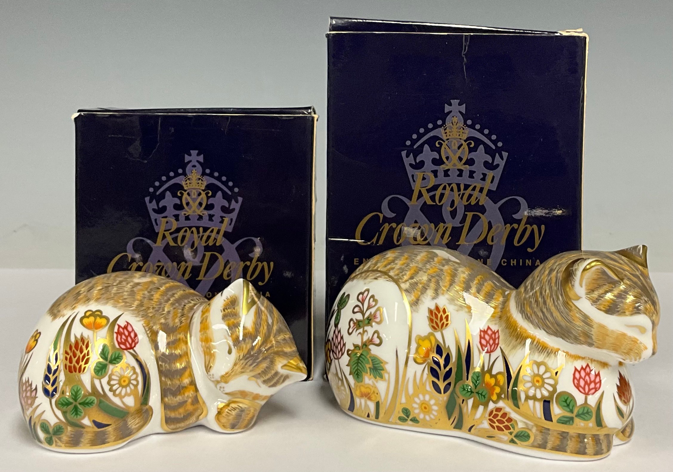 A pair of Royal Crown Derby paperweights, Cottage Garden Cat and Cottage Garden Kitten, gold stoppers, printed marks, each boxed