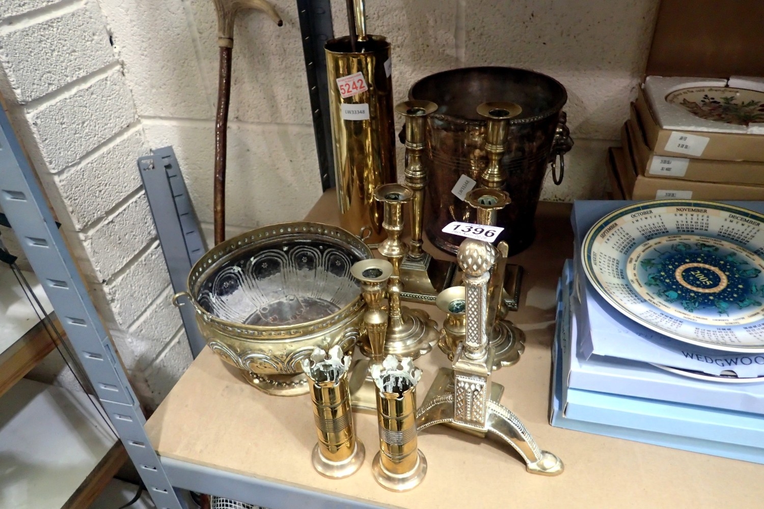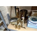 19th Century brass including three pairs of candlesticks, with a WWI artillery shell etc. Not available for in-house P&P