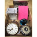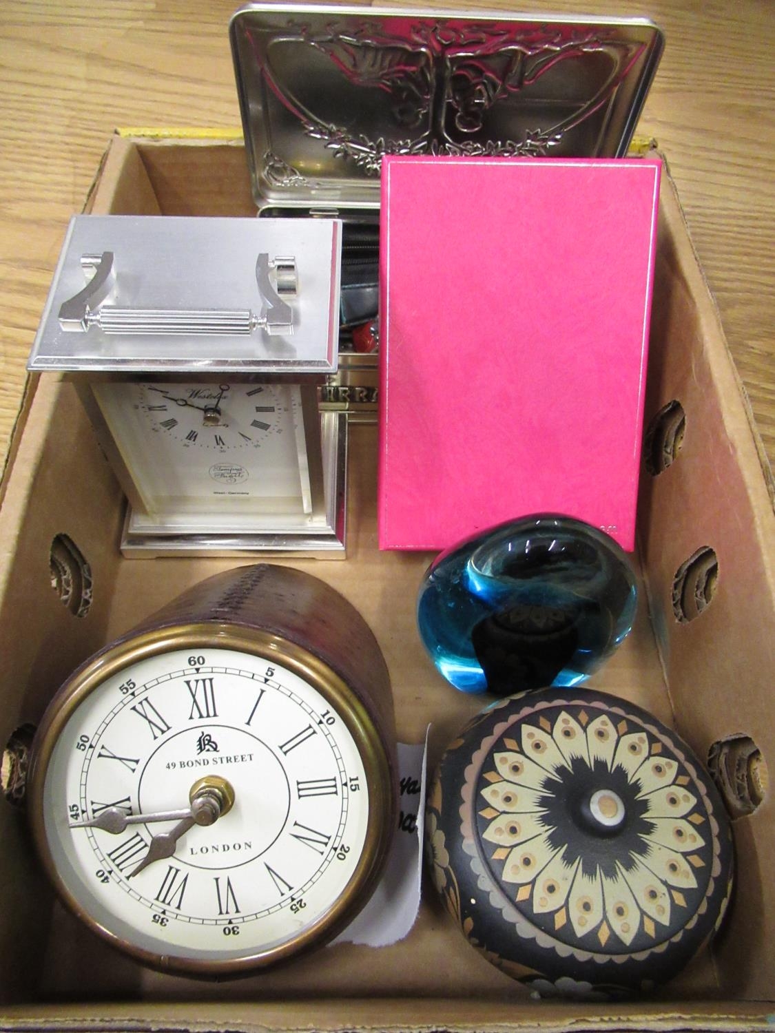 Westclox quartz carriage clock, quartz desk clock in leather case, quartz wrist watches, Swedish turquoise brass paperweight and other decorative items