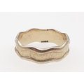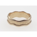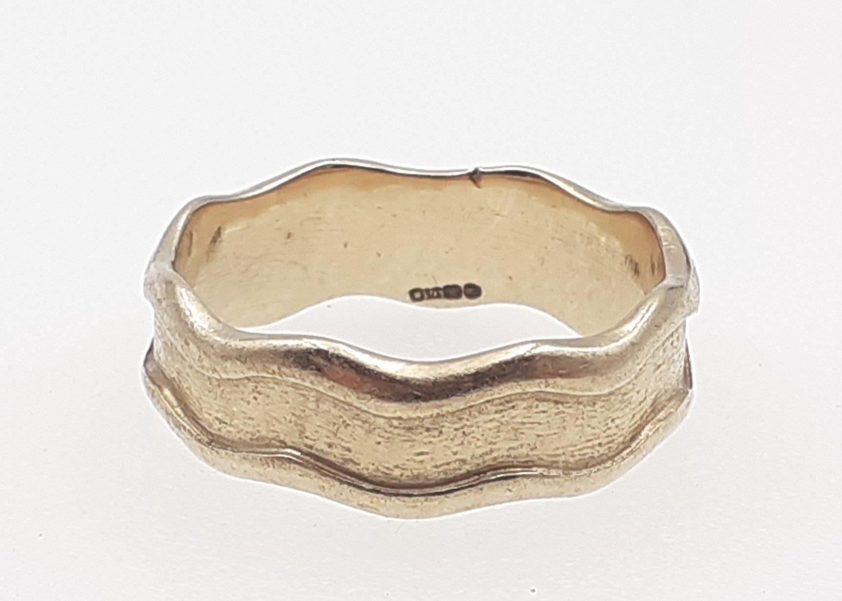 A superb 375 stamped gents wedding band with wave effect edges. Bought c. 2003 from the workshop of SHEILA FLEET at some considerable expense. Size T, weight 5.5g approx.