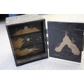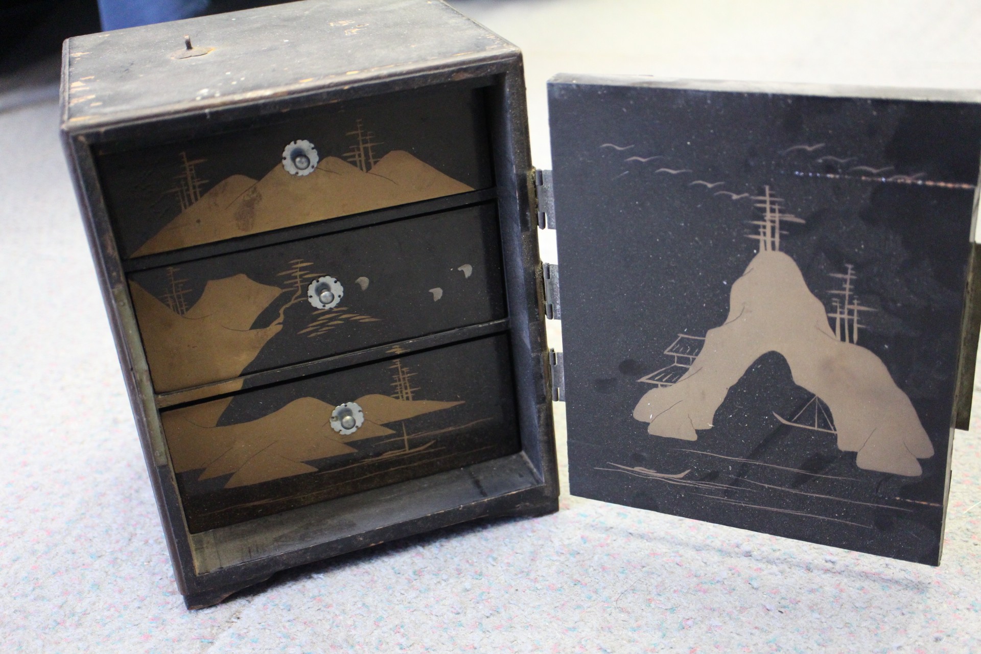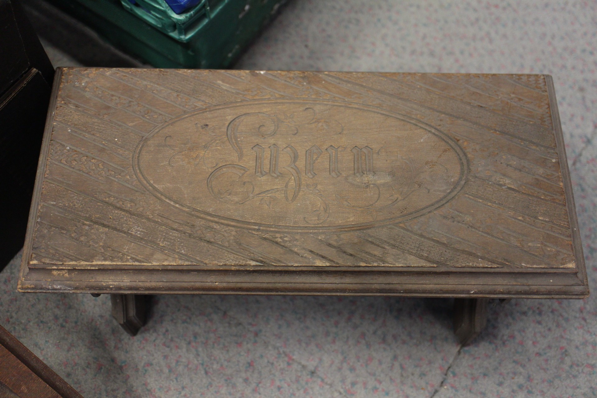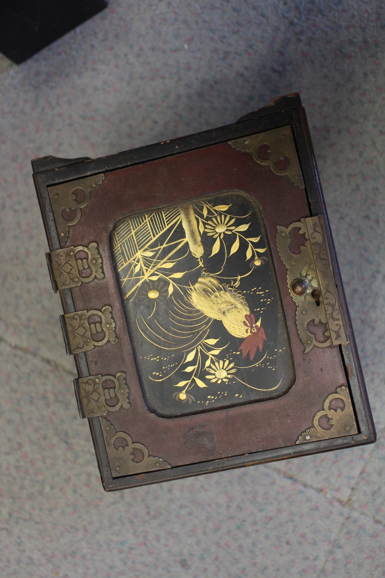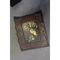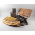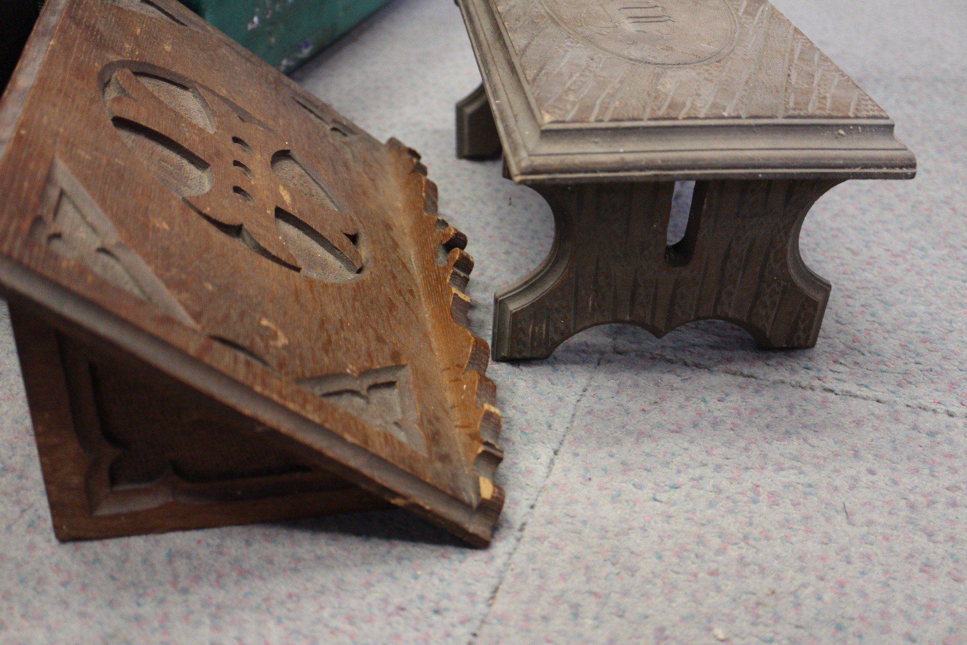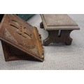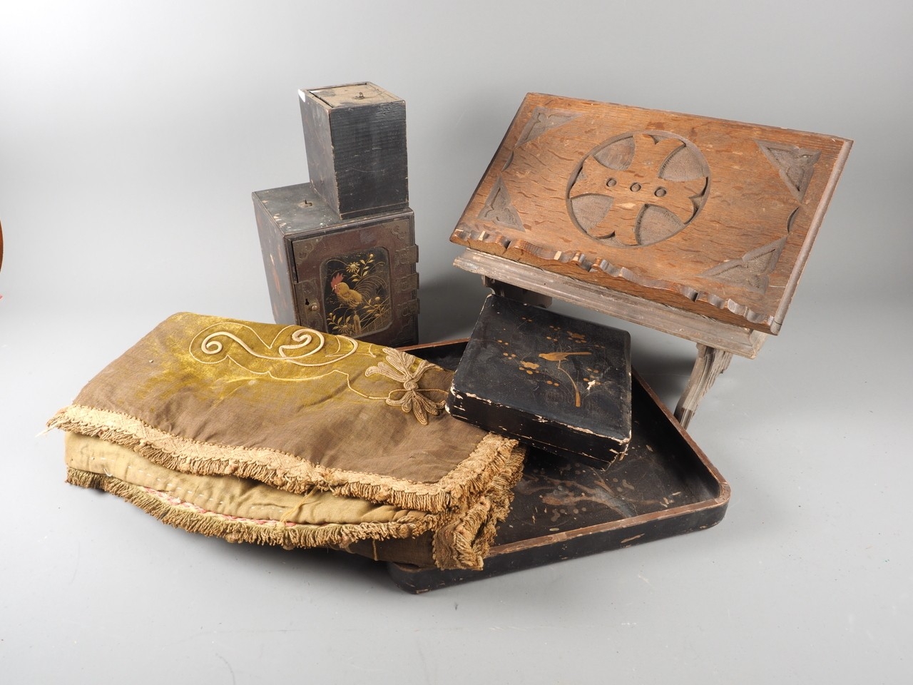 Two Gothic style bible stands, a number of lacquered boxes etc, and an embroidered velvet table runner