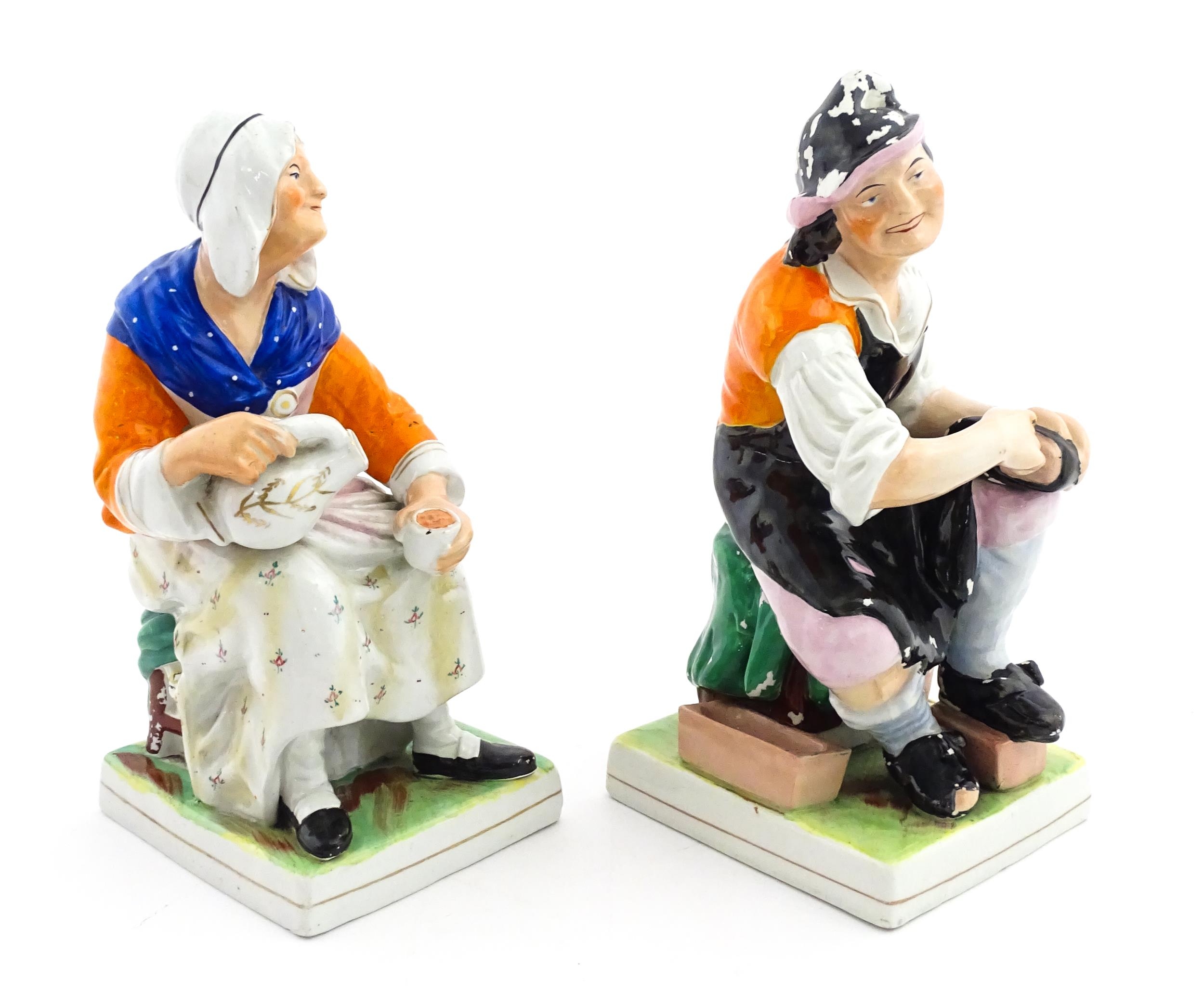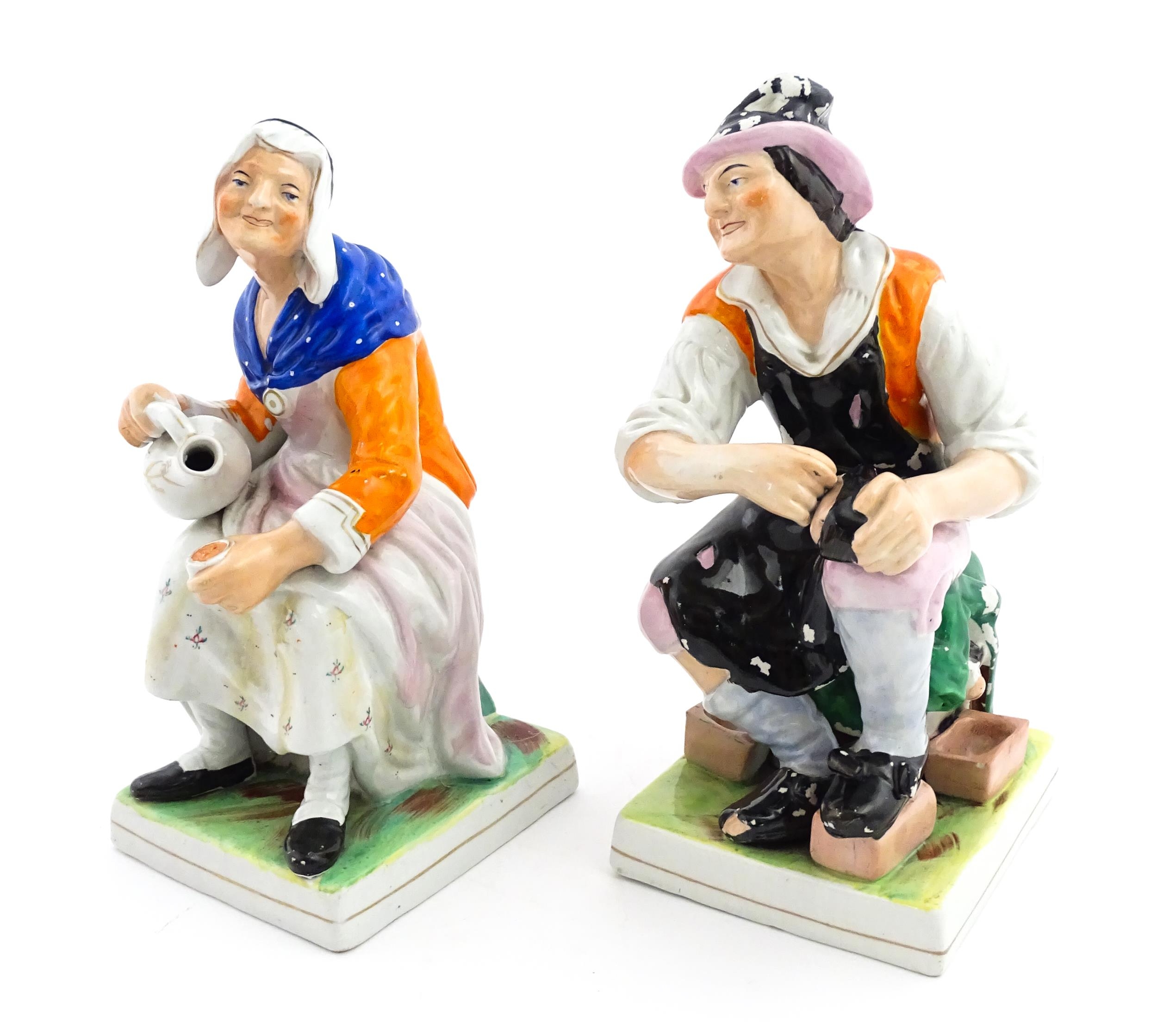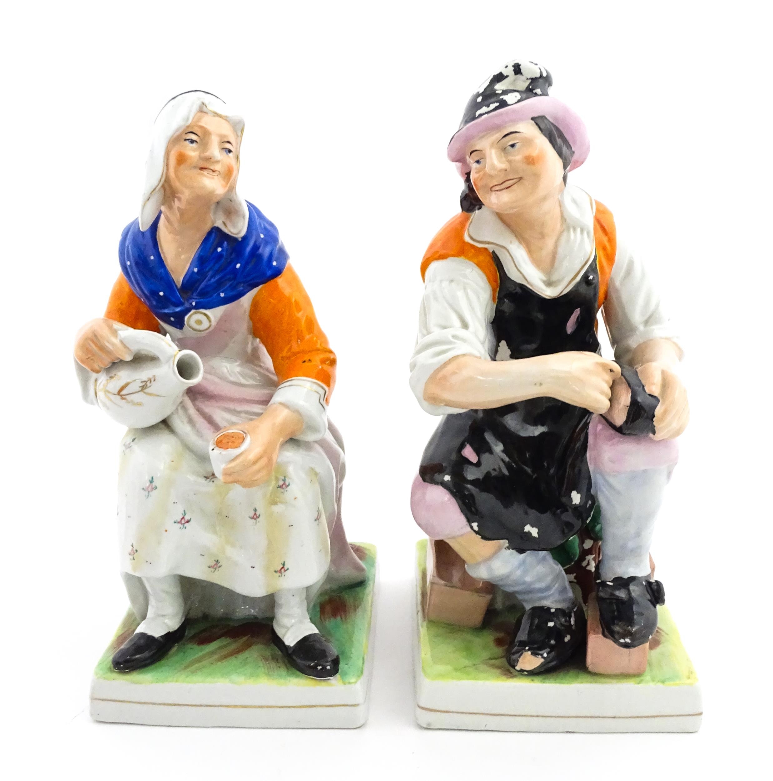 A pair of 20thC Staffordshire figures modelled as a cobbler and his wife. Approx. 12 1/4" high (2)