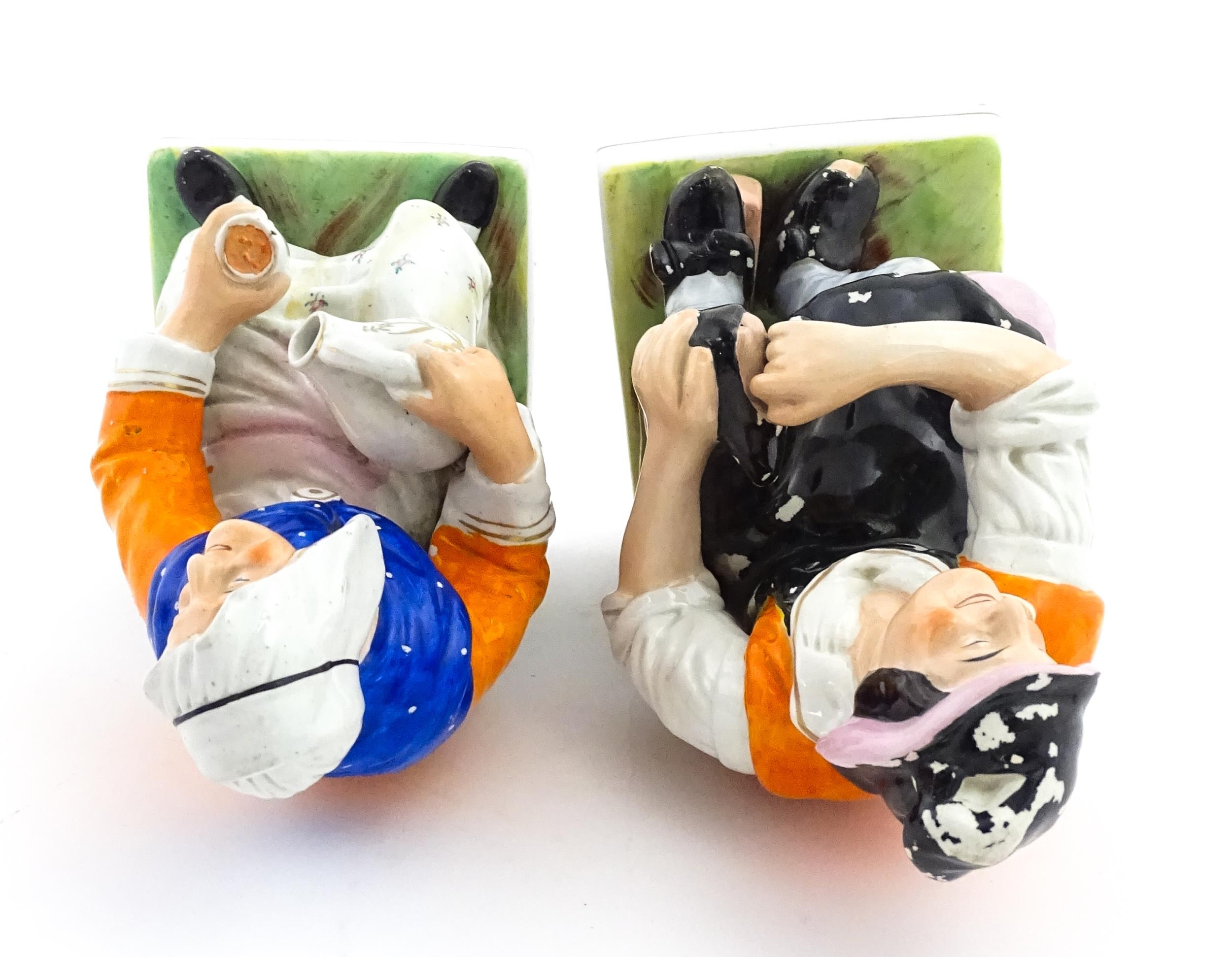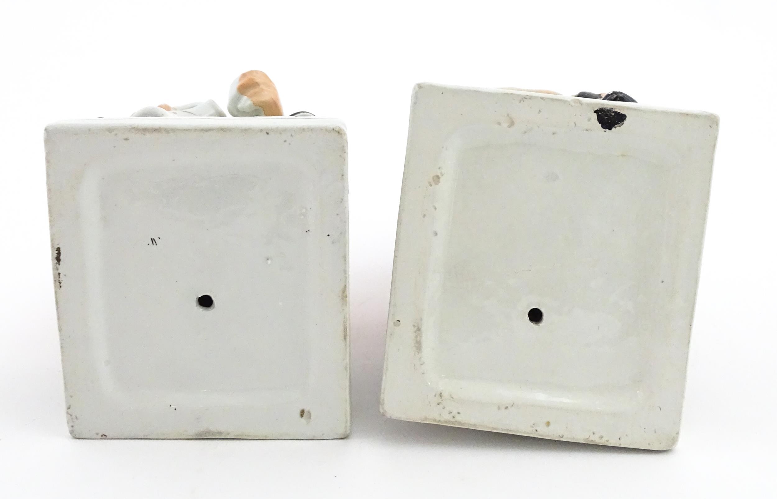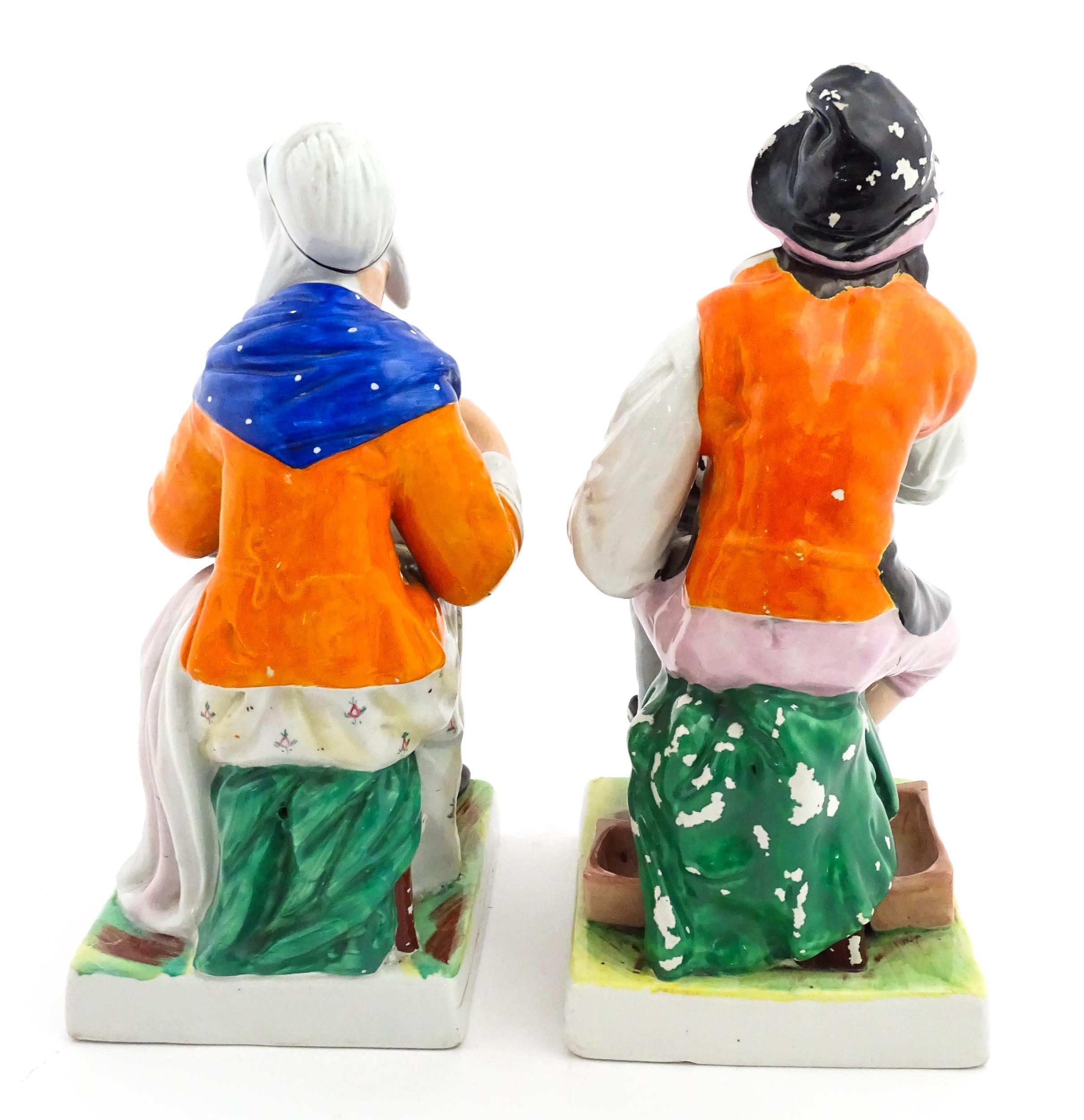 A pair of 20thC Staffordshire figures modelled as a cobbler and his wife. Approx. 12 1/4" high (2)
