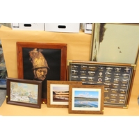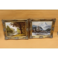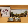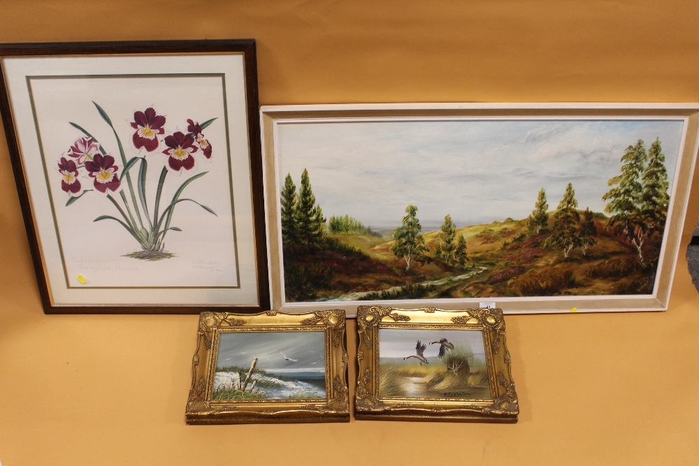 A FRAMED OIL ON CANVAS DEPICTING A RURAL LANDSCAPE SIGNED D HAYCOCK TOGETHER WITH TWO SMALLER GILT FRAMED OIL ON CANVASES AND A SIGNED FLORAL PRINT (4)