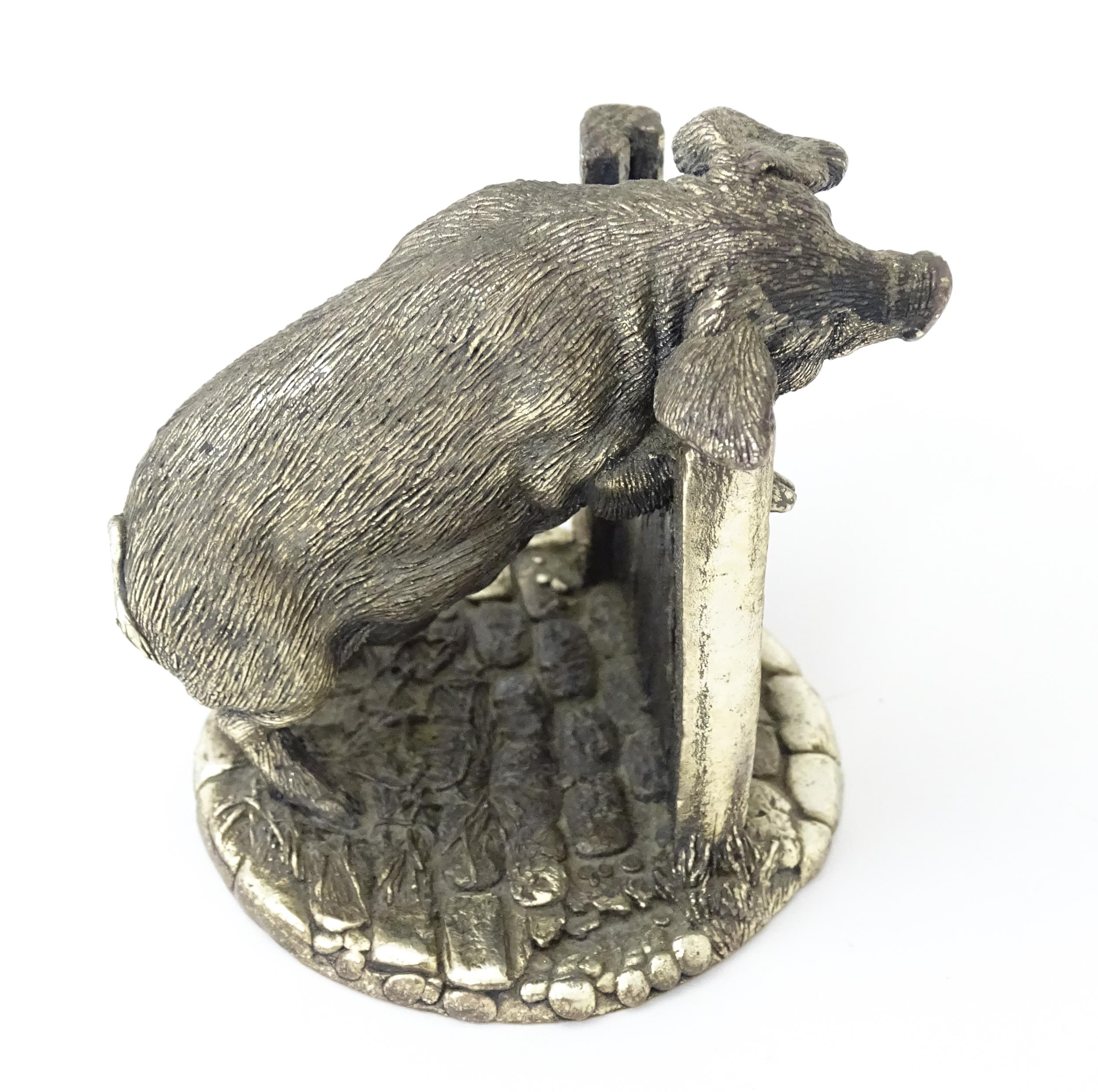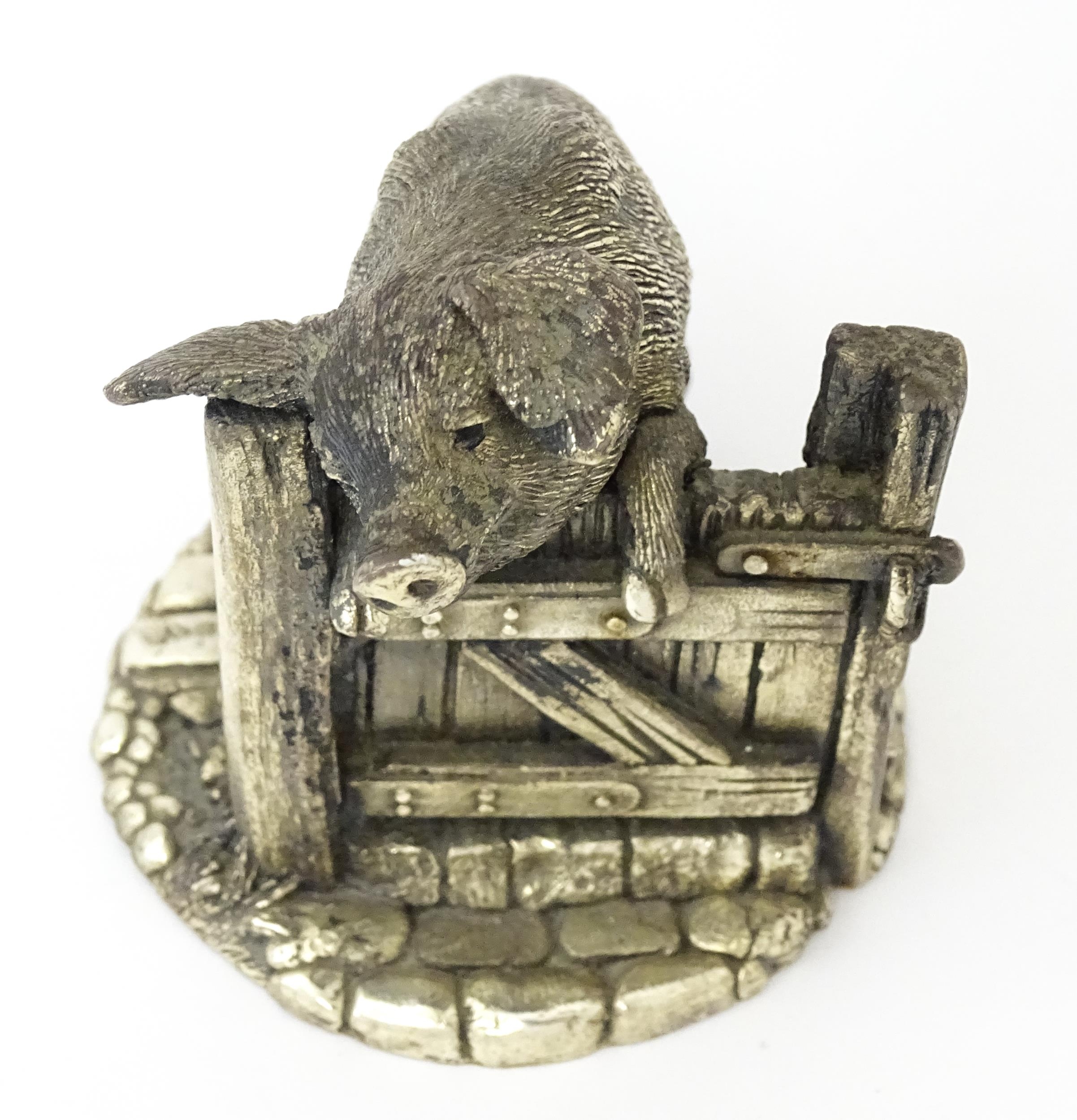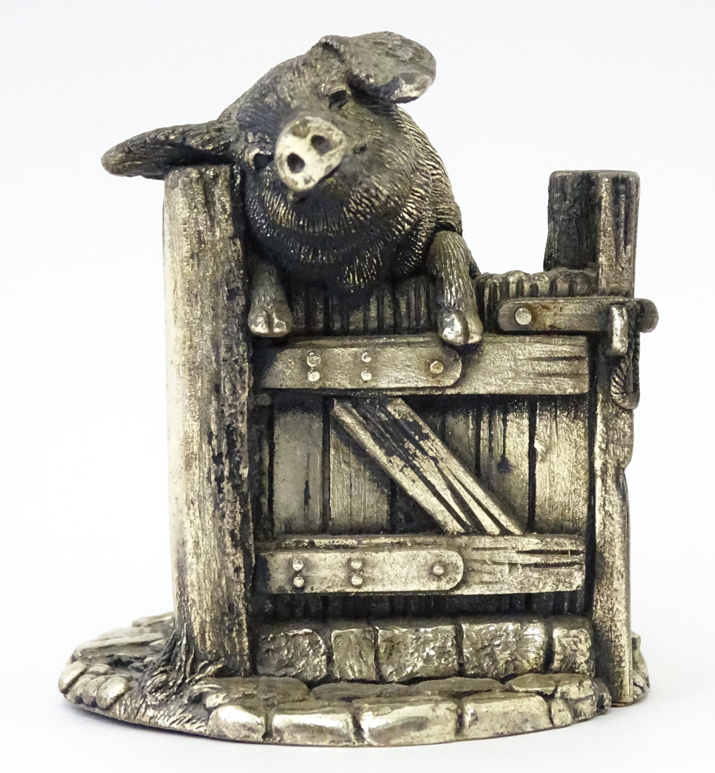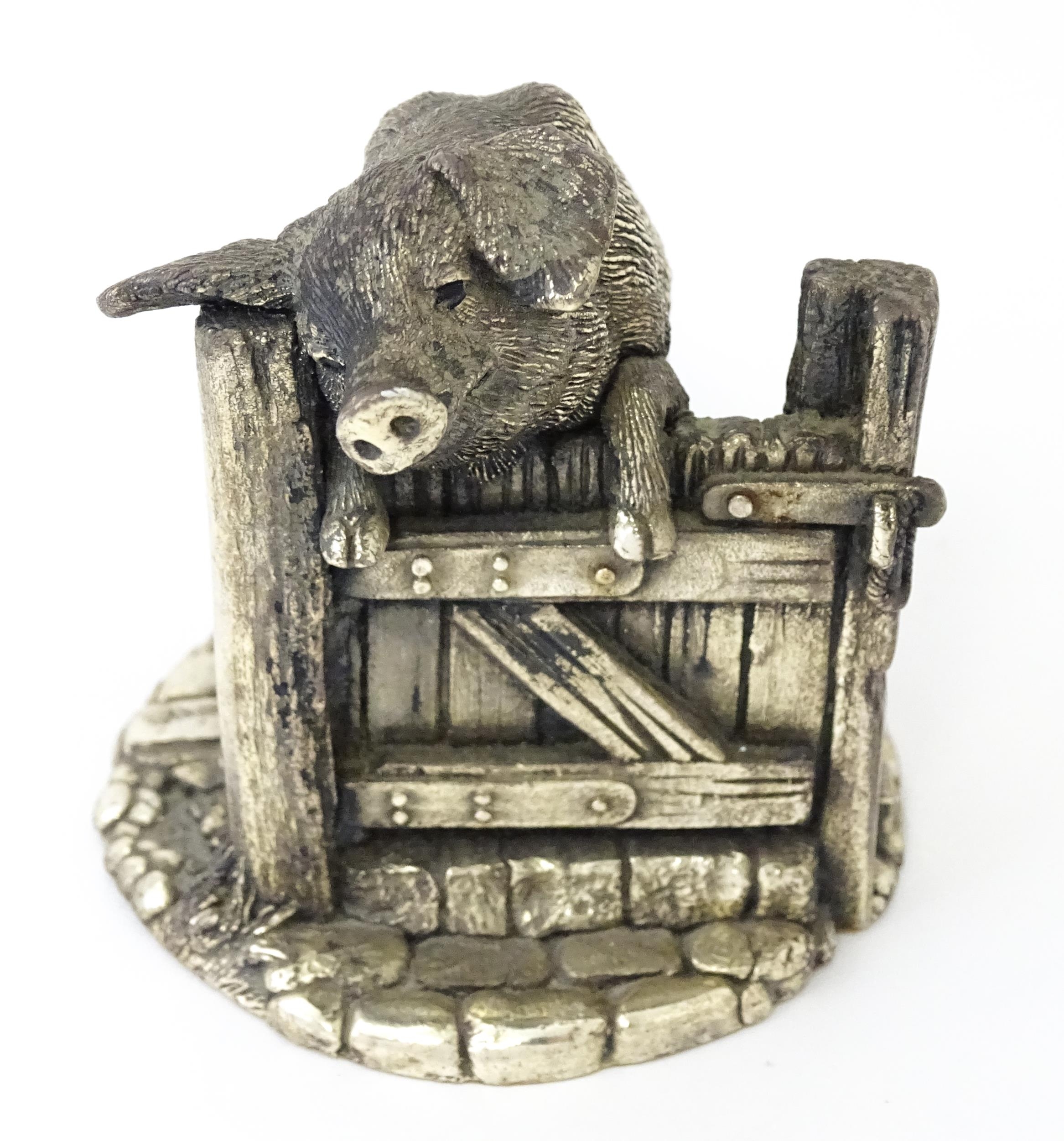 A Country Artist's silver covered model of a pig looking over a fence, hallmarked Birmingham 1993. Approx. 3 1/2" high