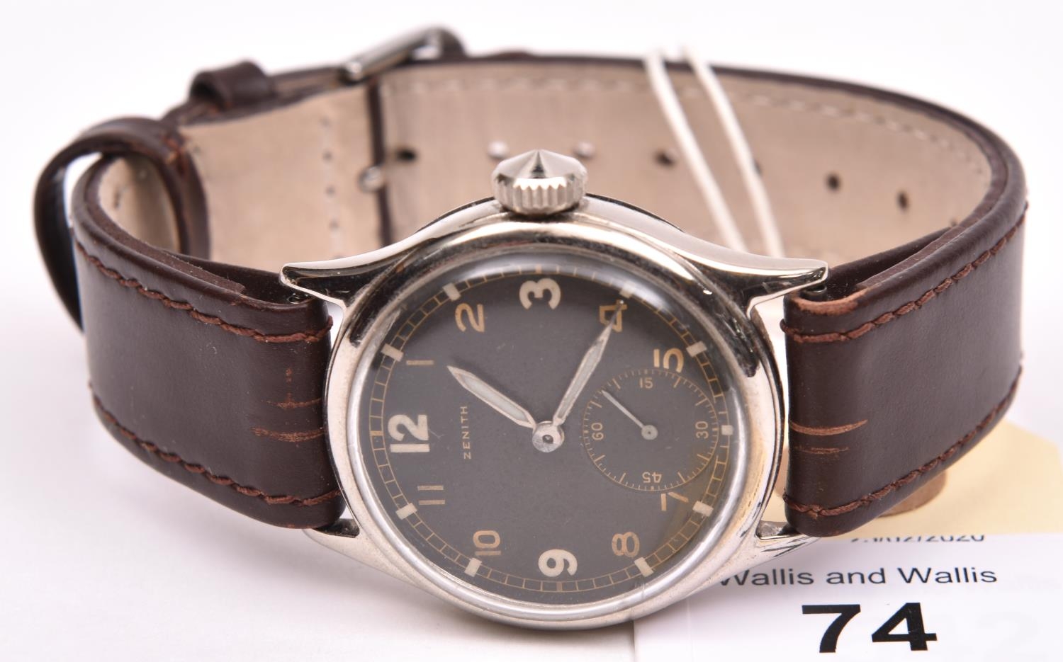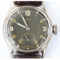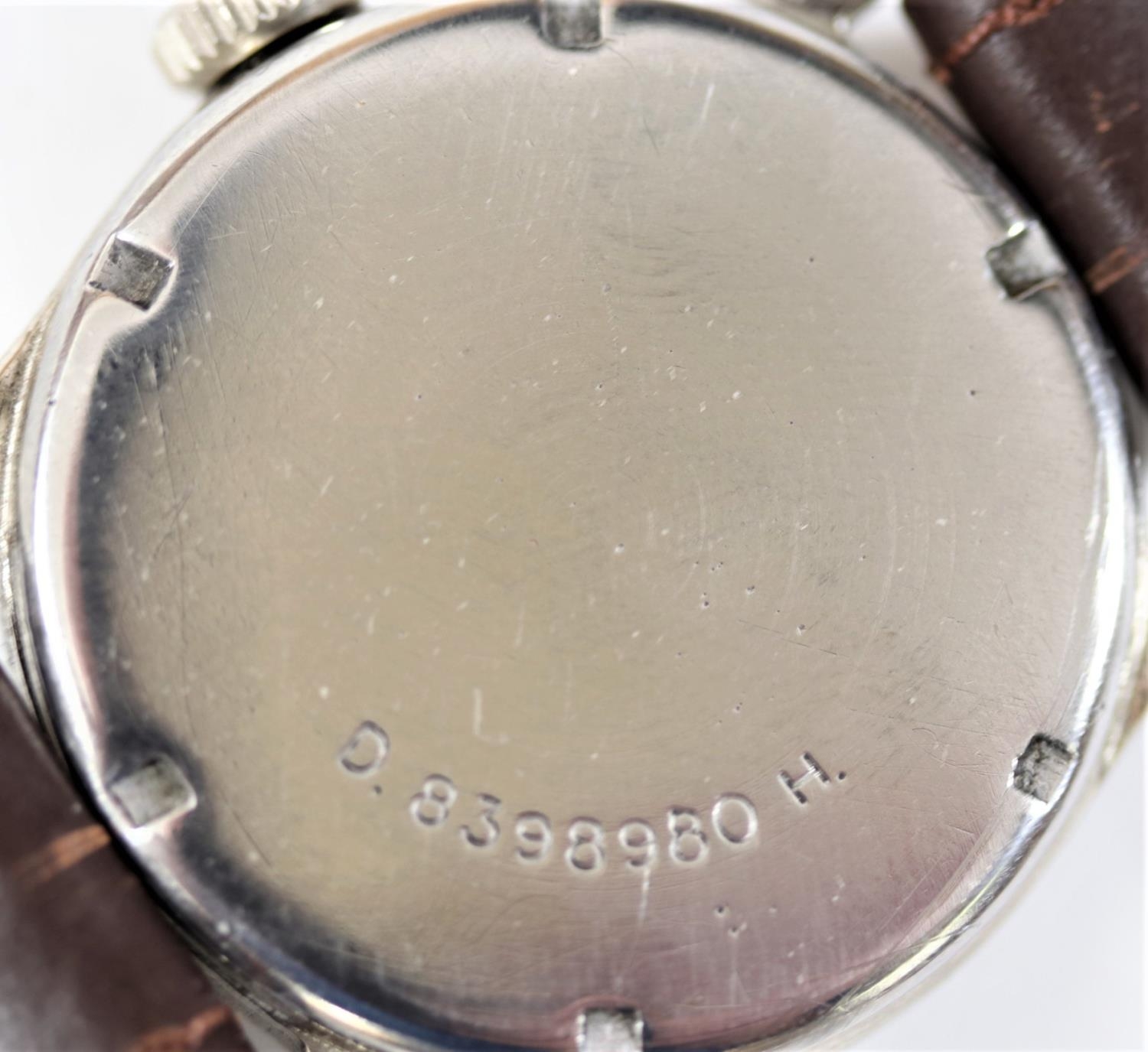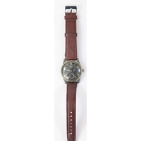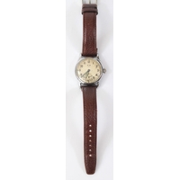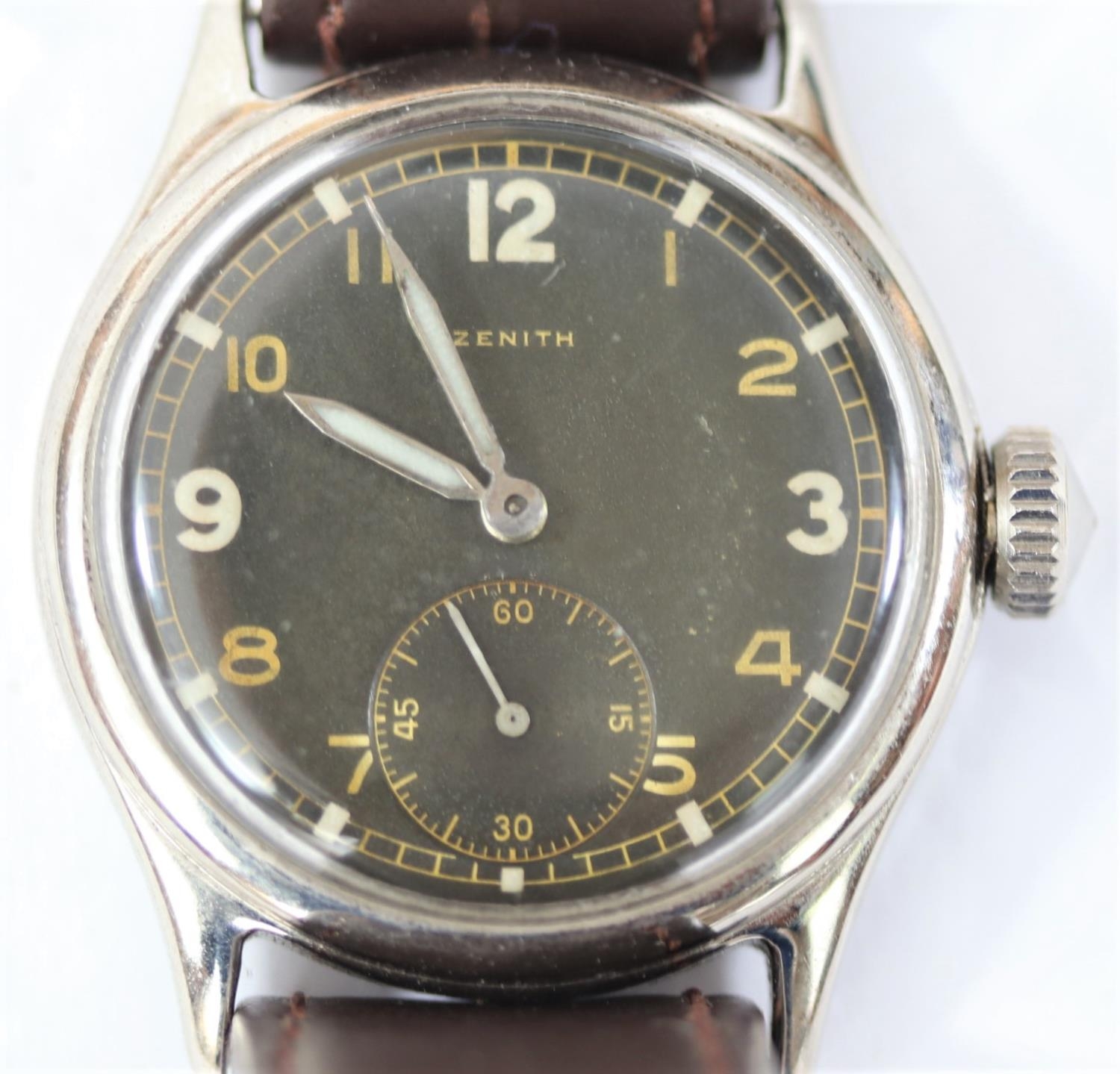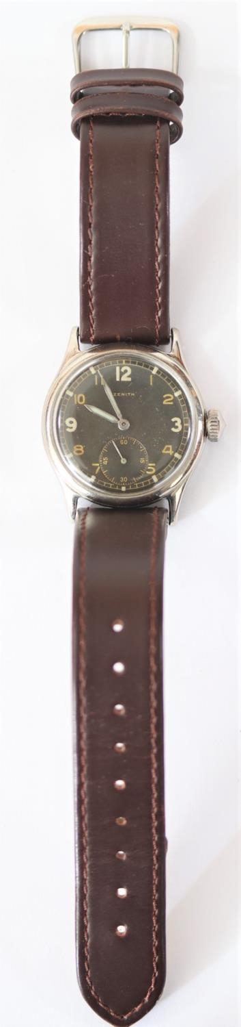 DH marked Zenith wristwatch. Serial D8398980H. Bright chrome plated case (refinished) 33mm not including crown. Faint traces of model number between lugs. Spring bars. Screw caseback, marked only with serial number (polished). Refinished dial and hands. Fine gilt Zenith signed movement, shock protected balance, clean, running condition. Original dust cover present. VGC
